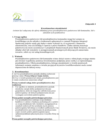 Załącznik 4 Kwestionariusz niezaleŜności (winien być załączony do oferty składanej przez przedsiębiorstwo państwowe lub komunalne, lub z udziałem tych podmiotów) 1. Uwaga ogólna Przedsiębiorstwa państwowe lub przedsiębiorstwa komunalne mogą być uznane za kwalifikujące się do udziału w konkursach ogłaszanych w ramach Programu Integracji Społecznej jedynie wtedy gdy będą w stanie wykazać Ŝe: (i) są prawnie i finansowo autonomiczne, oraz (ii) działają w oparciu o prawo handlowe. śadna zaleŜna instytucja państwowa nie moŜe uczestniczyć w projektach finansowanych przez Bank Światowy, nie moŜe składać ofert lub wniosków w postępowaniach przetargowych dotyczących zamawiania towarów, robót czy teŜ usług konsultingowych. 2. Wniosek Przedsiębiorstwo państwowe lub komunalne winno złoŜyć razem z ofertą kopię swojego statutu jak równieŜ wypełniony poniŜszy kwestionariusz podpisany przez osobę (-y) reprezentującą przedsiębiorstwo. Oferta przedsiębiorstwa, którego niezaleŜność w świetle poniŜszych informacji zostanie ustalona w świetle przyjętych kryteriów kwalifikowalności moŜe zostać dopuszczona do dalszej oceny. 3. Kwestionariusz 1. (a) Czy przedsiębiorstwo posiada odrębną osobowość prawną i statut. Proszę dołączyć kopię statutu. (b) Czy w świetle postanowień statutu, przedsiębiorstwo jest w stanie zrealizować zamawiane usługi? Proszę wymienić usługi, które przedsiębiorstwo chce realizować. 1. Czy zgodnie ze statutem, przedsiębiorstwo posiada niezaleŜny zarząd zdolny podejmować decyzje gospodarcze, które nie mogą być zablokowane przez państwo/gminę i do których podejmowania nie jest wymagane zezwolenie państwa/gminy. Proszę podać szczegóły potwierdzające powyŜsze. 2. Czy przedsiębiorstwo realizuje swoje działania handlowe w całości z funduszy pochodzących z zysków ze swojej działalności lub z kredytów zaciągniętych na zasadach rynkowych bez uciekania się do pomocy państwa/gminy lub dotacji ze środków publicznych. Czy przedsiębiorstwo jest zobowiązane do przekazywania części swoich zysków państwo/gminie (poza opłatami/podatkami płaconymi przez wszystkie firmy na rynku) Proszę podać szczegóły potwierdzające powyŜsze. 3. Czy przedsiębiorstwo działa w ramach prawa handlowego, np. jest zdolne do zaciągania kredytów, odpowiedzialna za długi, czy moŜe ogłosić bankructwo, czy moŜe być pozwanym? Proszę podać szczegóły potwierdzające powyŜsze. 4. Czy przedsiębiorstwo jest jednostką zaleŜną Państwa /beneficjenta projektu. Proszę podać szczegóły potwierdzające powyŜsze. 5. Czy przedsiębiorstwo posiada przedstawicieli państwa/ beneficjenta projektu w swoim zarządzie (radzie nadzorczej) Proszę podać szczegóły potwierdzające powyŜsze. 6. Czy jednostka jest powiązana w istotny sposób z którymkolwiek beneficjentem końcowym projektu. Proszę przedstawić szczegółowe informacje tych powiązań 1. OstrzeŜenie Informujemy, Ŝe przedstawienie fałszywych informacji prowadzić będzie od uniewaŜnienia jakiejkolwiek umowy zawartej z przedsiębiorstwem, która będzie finansowana w części lub w całości ze środków Banku Światowego oraz nakazu zwrotu kwot uprzednio zapłaconych przedsiębiorstwu w ramach tych umów. 2. Oświadczenie Oświadczam Ŝe przeczytałem i zrozumiałem wszystkie warunki udziału w projekcie, jak równieŜ Ŝe wszystkie informacje tu zamieszczone są prawdziwe i prawidłowe we wszystkich szczegółach. [Nazwa i adres siedziby przedsiębiorstwa] _____________________________________________________________________ [podpis i pieczęć osoby upowaŜnionej do reprezentowania przedsiębiorstwa] Załączniki: Kopia statutu
