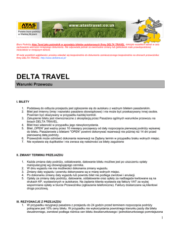 www.atastravel.co.uk Polskie biuro podróży w Wielkiej Brytanii Biuro Podróży Atas Tavel jako pośrednik w sprzedaży biletów autokarowych firmy DELTA TRAVEL, dołożyło wszelkich starań w celu zachowania wierności niniejszego dokumentu. Nie odpowiada jednak za ewentualne zmiany lub (jakkolwiek mało prawdopodobne) nieścisłości w niniejszym tekście. W razie wszelkich wątpliwości, prosimy odwołać się bezpośrednio do dokumentu zamieszczonego bezpośrednio na stronach przewoźnika: firmy DELTA TRAVEL: http://www.deltatravel.pl/ DELTA TRAVEL Warunki Przewozu I. BILETY 1. Podstawą do odbycia przejazdu jest zgłoszenie się do autokaru z ważnym biletem pasażerskim. 2. Bilet jest imienny (imię i nazwisko pasażera obowiązkowe) i nie może być przekazywany innej osobie. Powinien być okazywany w przypadku każdej kontroli. 3. Zakupienie biletu jest równoznaczne z akceptacją przez Pasażera ogólnych warunków przewozu na liniach DELTA TRAVEL. 4. Bilet traci własność w przypadku jego niewykorzystania. 5. Bilet „OPEN” jest ważny przez 10 miesięcy począwszy od daty rozpoczęcia pierwszej podróży wpisanej do biletu. Pasażerowie z biletami "OPEN” powinni dokonywać rezerwacji nie później niż 14 dni przed planowaną datą podróży. 6. Przewoźnik może odmówić dokonania rezerwacji na Żądany termin w przypadku braku wolnych miejsc. 7. Nie wystawia się duplikatów i nie zwraca się należności za bilety zagubione II. ZMIANY TERMINU PRZEJAZDU 1. Każda zmiana daty podróży, oddatowanie, datowanie biletu możliwe jest po uiszczeniu opłaty manipulacyjnej wg obowiązującego cennika. 2. W dniu wyjazdu nie ma możliwości dokonania zmiany wyjazdu. 3. Zmiany daty wyjazdu i powrotu dokonywane są w miarę wolnych miejsc. 4. Po dokonaniu zmiany daty wyjazdu lub powrotu bilet nie podlega zwrotowi i anulacji. 5. Opłaty za zmiany daty podróży, datowanie, oddatowanie oraz opłaty za nadbagaże kwitowane są na drukach KP, wystawionych w autokarze. Na żądanie klienta wystawia się faktury VAT za wyżej wspomniane opłaty w biurze Przewoźnika (zgłoszenie telefoniczne). Faktury dostarczane są klientowi droga pocztową. III. REZYGNACJE Z PRZEJAZDU 1. W przypadku rezygnacji pasażera z przejazdu do 24 godzin przed terminem rozpoczęcia podróży potrącane jest 10% ceny biletu. W przypadku nie wykorzystania powrotnego kierunku jazdy dla biletu dwustronnego, zwrotowi podlega różnica cen biletu dwukierunkowego i jednokierunkowego pomniejszona 1 o 10% wartości, nie później jednak niż 24 godziny przed terminem powrotu. W dniu wyjazdu bilet przepada. 2. Podanie o zwrot kosztów za niewykorzystany bilet należy składać do biura, które sprzedało bilet. 3. Pasażer traci prawo do zwrotu kosztów za niewykorzystany bilet po upływie 1 miesiąca od daty zgłoszenia rezygnacji z przejazdu. IV. PRZEWÓZ BAGAŻU 1. Pasażer zobowiązany jest do przestrzegania ustanowionych przez Przewoźnika przepisów i taryfy dotyczących przewozu zarejestrowanego bagażu. 2. Pasażer, w ramach wykupionego biletu ma prawo do przewozu 1 bagażu o wadze do 25 kg i o wymiarach 30x40x80 cm (długość x wysokość x szerokość) oraz bagażu podręcznego o wadze do 5 kg. W przypadku przekroczenia regulaminowej wagi bagażu powyżej 5kg podręcznego oraz powyżej 25kg dużego pobierane są opłaty zgodnie z obowiązującym cennikiem. 3. Za każdy dodatkowy bagaż pobierana jest opłata zgodnie z obowiązującym cennikiem. 4. Nadbagaż jest zabierany w miarę wolnych miejsc w bagażniku. 5. Bagaż powinien być odebrany przez podróżnego z chwilą przyjazdu do przystanku docelowego. Bagaż nieodebrany jest przechowywany przez okres 2 miesięcy na koszt właściciela. 6. Reklamacje z powodu straty i uszkodzenia bagażu powinny być zgłoszone przez podróżnego natychmiast po dotarciu na miejsce i potwierdzone pisemnie najpóźniej 7 dni po zakończeniu podróży. 7. Bagaż powinien być opisany imiennie. 8. Wysokość odszkodowania dotyczącego zarejestrowanego bagażu nie może przekroczyć 100 EURO. Bagaż o wartości przekraczającej 100 EURO powinien być przez Pasażera dodatkowo ubezpieczony na jego koszt. 9. Zabrania się pasażerom przewożenia w bagażu i przy sobie materiałów i przedmiotów, które mogą zagrażać bezpieczeństwu w transporcie i stwarzać możliwość wyrządzenia szkody. V. PRAWA I OBOWIAZKI PASAŻERÓW 1. Pasażer ma obowiązek posiadać własny bilet oraz dokumenty upoważniające do wyjazdu i wjazdu na obszary danych państw. Zobowiązany jest także do przestrzegania przepisów ustanowionych przez administrację krajów tzn. przepisów urzędów celnych, finansowych i innych organów administracji dotyczących zarówno osób jak i przewożonego przez nie bagażu. 2. Wsiadanie i wysiadanie z autokaru jest dozwolone w miejscach określonych w rozkładzie jazdy. 3. Pasażer ma prawo do zmiany miejsca wsiadania lub wysiadania wyłącznie po akceptacji przewoźnika i po uiszczeniu określonej w cenniku opłaty manipulacyjnej. 4. Za zanieczyszczenie autokaru pobierana będzie opłata w wysokości ustanowionej w cenniku. Za uszkodzenie wyposażenia autokaru Pasażer ponosi odpowiedzialność do kwoty wyrządzonej szkody. 5. Pasażer powinien stawić się 15 minut przed planowanym odjazdem autokaru. 6. Na przystankach pośrednich, na skutek możliwości opóźnienia przyjazdu autokaru, Pasażer jest zobowiązany czekać nie krócej niż 2 godziny. 7. Jeżeli niemożność skorzystania z przejazdu linią ,,DELTA-TRAVEL” nastąpiła na skutek odwołania przewozu, pasażerowi przysługuje zwrot do wysokości kwoty wpłaconej przewoźnikowi za bilet. 8. W autokarze obowiązuje zakaz palenia tytoniu i picia alkoholu. 9. Zaleca się wykupienie dodatkowego ubezpieczenia od choroby, gdyż ubezpieczenie zapewnione przez przewoźnika obejmuje tylko czas pobytu w autokarze. VI. PRAWA I OBOWIĄZKI PRZEWOŹNIKA 1. Przewoźnik ma prawo nie dopuścić do zajęcia miejsc
