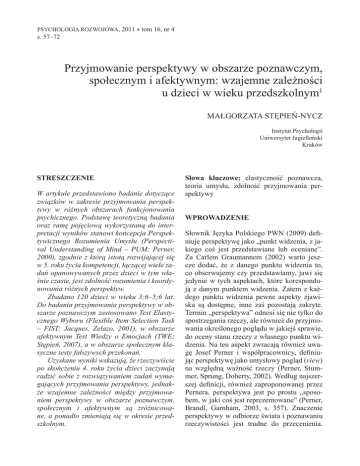 PSYCHOLOGIA ROZWOJOWA, 2011 * tom 16, nr 4 s. 57–72 Przyjmowanie perspektywy w obszarze poznawczym, społecznym i afektywnym: wzajemne zależności u dzieci w wieku przedszkolnym1 MAŁGORZATA STĘPIEŃ-NYCZ Instytut Psychologii Uniwersytet Jagielloński Kraków STRESZCZENIE W artykule przedstawiono badanie dotyczące związków w zakresie przyjmowania perspektywy w różnych obszarach funkcjonowania psychicznego. Podstawę teoretyczną badania oraz ramę pojęciową wykorzystaną do interpretacji wyników stanowi koncepcja Perspektywicznego Rozumienia Umysłu (Perspectival Understanding of Mind – PUM; Perner, 2000), zgodnie z którą istotą rozwijającej się w 5. roku życia kompetencji, łączącej wiele zadań opanowywanych przez dzieci w tym właśnie czasie, jest zdolność rozumienia i koordynowania różnych perspektyw. Zbadano 120 dzieci w wieku 3;6–5;6 lat. Do badania przyjmowania perspektywy w obszarze poznawczym zastosowano Test Elastycznego Wyboru (Flexible Item Selection Task – FIST; Jacques, Zelazo, 2001), w obszarze afektywnym Test Wiedzy o Emocjach (TWE; Stępień, 2007), a w obszarze społecznym klasyczne testy fałszywych przekonań. Uzyskane wyniki wskazują, że rzeczywiście po skończeniu 4. roku życia dzieci zaczynają radzić sobie z rozwiązywaniem zadań wymagających przyjmowania perspektywy, jednakże wzajemne zależności między przyjmowaniem perspektywy w obszarze poznawczym, społecznym i afektywnym są zróżnicowane, a ponadto zmieniają się w okresie przedszkolnym. Słowa kluczowe: elastyczność poznawcza, teoria umysłu, zdolność przyjmowania perspektywy WPROWADZENIE Słownik Języka Polskiego PWN (2009) definiuje perspektywę jako „punkt widzenia, z jakiego coś jest przedstawiane lub oceniane”. Za Carlem Graumannem (2002) warto jeszcze dodać, że z danego punktu widzenia to, co obserwujemy czy przedstawiamy, jawi się jedynie w tych aspektach, które korespondują z danym punktem widzenia. Zatem z każdego punktu widzenia pewne aspekty zjawiska są dostępne, inne zaś pozostają zakryte. Termin „perspektywa” odnosi się nie tylko do spostrzegania rzeczy, ale również do przyjmowania określonego poglądu w jakiejś sprawie, do oceny stanu rzeczy z własnego punktu widzenia. Na ten aspekt zwracają również uwagę Josef Perner i współpracownicy, definiując perspektywę jako umysłowy pogląd (view) na względną ważność rzeczy (Perner, Stummer, Sprung, Doherty, 2002). Według najszerszej definicji, również zaproponowanej przez Pernera, perspektywa jest po prostu „sposobem, w jaki coś jest reprezentowane” (Perner, Brandl, Garnham, 2003, s. 357). Znaczenie perspektywy w odbiorze świata i poznawaniu rzeczywistości jest trudne do przecenienia. 58 Analiza poglądów filozofów i psychologów, przeprowadzona przez Arkadiusza Białka (2007, s. 137), doprowadziła autora do wniosku, że „poznanie jest inherentnie perspektywiczne: każde reprezentowanie zachodzi z jakiejś określonej perspektywy, przez co reprezentowane są tylko pewne aspekty reprezentowanego, czyli reprezentowanie jest zawsze «reprezentowaniem jako»”. Również Perner jest zdania, że nie można reprezentować, nie reprezentując w jakiś sposób, gdyż każde użycie środka reprezentacji odbywa się z jakiejś perspektywy (Perner, Brandl, Garnham, 2003). Próba zrozumienia lub wyobrażenia sobie perspektywy, z jakiej patrzy na daną sytuację inna osoba, nazywana jest przyjmowaniem perspektywy. Zgodnie z przytoczonymi wyjaśnieniami definicyjnymi perspektywa jest obecna w wielu różnych obszarach funkcjonowania człowieka – między innymi językowym, poznawczym, społecznym czy afektywnym. W szczególnie silny sposób perspektywa jest obecna w obszarze językowym i komunikacyjnym, poprzez sam fakt perspektywiczności języka – za pomocą języka można bowiem wyrażać różne perspektywy odnośnie do tego samego obiektu (Clark, 1997). W obszarze poznawczym najczęściej mówi się o przyjmowaniu perspektywy spostrzegania wzrokowego, a więc polegającej na rozumieniu, w jaki sposób druga osoba, stojąc w innym miejscu, spostrzega dany obiekt (Piaget, Inhelder, 1956; Flavell, 1992). W szerszym znaczeniu można mówić o przyjmowaniu perspektywy w obszarze poznawczym również w odniesieniu do elastyczności (giętkości) poznawczej, która jest składową funkcji zarządzających2 (Miyake i in., 2000; Lehto, Juujärvi, Kooistra, Pulkkinen, 2003; Blair, Zelazo, Greenberg, 2005). Elastyczność poznawcza polega przede wszystkim na umiejętności płynnej zmiany punktu widzenia i przełączania się między różnymi aspektami sytuacji czy zadania (Miyake i in., 2000), ale również na umiejętności jednoczesnego ujmowania danego obiektu z różnych punktów widzenia (Jacques, Zelazo, 2001, 2005), co Małgorzata Stępień-Nycz jest istotą umiejętności przyjmowania perspektywy. Jednym z narzędzi do badania elastyczności poznawczej, które wymaga również umiejętności przyjmowania perspektywy, jest Test Elastycznego Wyboru (Flexible Item Selection Task – FIST; Jacques, Zelazo, 2001). Aby prawidłowo rozwiązać test, potrzebna jest nie tylko umiejętność elastycznej zmiany perspektyw, ale również umiejętność jednoczesnego rozpatrywania prezentowanego obiektu z dwóch punktów widzenia. W obszarze społecznym umiejętność przyjmowania perspektywy jest niezbędna do rozumienia cudzych przekonań, pragnień czy motywów działania (Perner, 2000) oraz do przewidywania czyichś zachowań na podstawie wiedzy o przekonaniach tejże osoby. Umiejętność przyjmowania perspektywy w tym obszarze pozwala również na zrozumienie, że pragnienia lub przekonania drugiej osoby mogą różnić się od własnych pragnień i przekonań. Wszystkie te kompetencje wchodzą w zakres tak zwanej teorii umysłu (szersze omówienie tej problematyki zob. Białecka-Pikul, 2002; Putko, 2008). W tym kontekście możemy zatem mówić także o perspekt