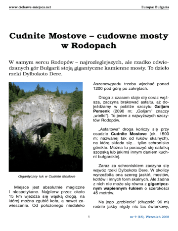 www.ciekawe-miejsca.net Europa: Bułgaria Cudnite Mostove – cudowne mosty w Rodopach W samym sercu Rodopów – najrozleglejszych, ale rzadko odwiedzanych gór Bułgarii stoją gigantyczne kamienne mosty. To dzieło rzeki Dylbokoto Dere. Aszenowgradu trzeba wjechać ponad 1200 pod górę po zakrętach. Droga z czasem staje się coraz węższa, zaczyna brakować asfaltu, aż dojeżdżamy w pobliże szczytu Goljam Persenk (2090 m; „Goljam” znaczy „wielki”). To jeden z najwyższych szczytów Rodopów. „Asfaltowa” droga kończy się przy osadzie Cudnite Mostove (ok. 1500 m; nazwanej tak od łuków skalnych), na którą składa się... tylko schronisko górskie. Można tu poraczyć się sałatką szopską lub jakimś innym daniem kuchni bułgarskiej. Zaraz za schroniskiem zaczyna się wąwóz rzeki Dylbokoto Dere. W okolicy wyrzeźbiła ona szereg jaskiń, mostów, kotłów i innych form skalnych. Ale żadna z nich nie może się równa z gigantycznym wapiennym łukiem o szerokości 45 metrów. Gigantyczny łuk w Cudnite Mostove Miejsce jest absolutnie magiczne i niespotykane. Najpierw przez około 15 km wjeżdża się wąską drogą, na której można zgubić koła, a nawet zawieszenie. Od położonego niedaleko Na jego „grzbiecie” (długość: 96 m) rośnie jakby nigdy nic las świerkowy, 1 nr 9 (18), Wrzesień 2008 www.ciekawe-miejsca.net Europa: Bułgaria obok znajduje się przepaść głęboka na 43 metry. most wyglądał kiedyś podobnie, ale został wydrążony na szerokość. We wnętrzu skalnego mostu Potężne świerki zdają się być niczym przy potędze skał Dołem płynie niewielka wspomniana rzeczka, która zaraz za mostem wchodzi w wąwóz. Można w nim dostrzec groty skalne oraz wejście do jaskini Goliamata Pesztera. Niestety, nie można zejść do wąwozu. Na obu mostach utworzono wspaniałe punkty widokowe, z których można podziwiać ogrom formacji skalnych – a także piękne lasy świerkowe. Krajobraz Rodopów w okolicach Cudnite Mostove Widok z góry Porastają one Rodopy do wysokości prawie 2000 metrów. Te olbrzymie góry ze skałami wapiennymi wyglądają jak nasze Pieniny. Za wąwozem zaczyna się drugi most skalny, który właściwie jest potężną, długą na 60 m i bardzo wysoką grotą. Wpadająca do niego rzeka wypływa dopiero 1,5 km dalej. Sąsiedni wielki 2 nr 9 (18), Wrzesień 2008 www.ciekawe-miejsca.net Europa: Bułgaria Cudnite Mostove nie są popularnym miejscem turystycznym. Spokojnie w okolicy można rozbić namiot (na dziko lub przy schronisku) i kontemplować niezwykłe dzieła przyrody. Informacje praktyczne: Do Cudnite Mostove najlepiej dojechać samochodem (z Aszenowgradu – 55 km lub ze Smoljana – 60 km; trzeba na to liczyć 1,30 h). Drogi bułgarskie nie są gorsze od polskich, ale ostatni odcinek jest bardzo wąski i miejscami o bardzo nierównej nawierzchni. Można również dotrzeć tu pieszo, wędrując po Rodopach. Zwiedzanie mostów jest bezpłatne. Można posłużyć się mapą Rodopów – Zachodnia Część, wyd. EOOD (skala 1:100 000). Tekst: Jakub Jagiełło; zdjęcia: Jakub Jagiełło, Danuta Maciejewska Przy ogromnych skałach człowiek wydaje się malutki... Internetowy Przewodnik Turystyczny www.ciekawe-miejsca.net 3 nr 9 (18), Wrzesień 2008