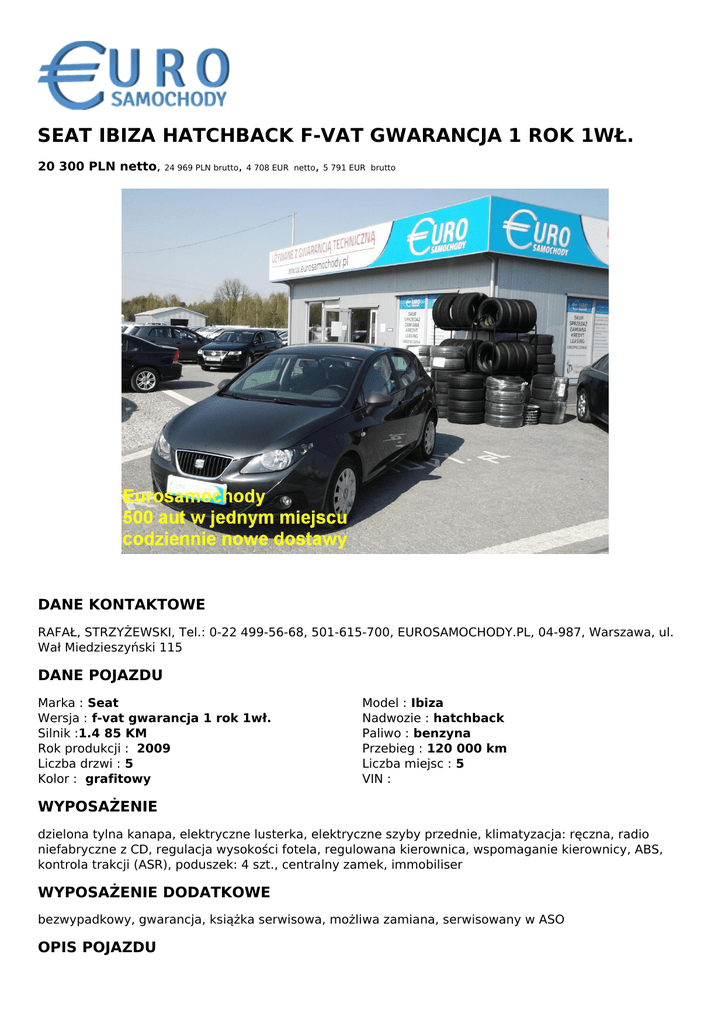 SEAT IBIZA HATCHBACK F-VAT GWARANCJA 1 ROK 1WŁ. 20 300 PLN netto, 24 969 PLN brutto, 4 708 EUR netto, 5 791 EUR brutto DANE KONTAKTOWE RAFAŁ, STRZYŻEWSKI, Tel.: 0-22 499-56-68, 501-615-700, EUROSAMOCHODY.PL, 04-987, Warszawa, ul. Wał Miedzieszyński 115 DANE POJAZDU Marka : Seat Wersja : f-vat gwarancja 1 rok 1wł. Silnik :1.4 85 KM Rok produkcji : 2009 Liczba drzwi : 5 Kolor : grafitowy Model : Ibiza Nadwozie : hatchback Paliwo : benzyna Przebieg : 120 000 km Liczba miejsc : 5 VIN : WYPOSAŻENIE dzielona tylna kanapa, elektryczne lusterka, elektryczne szyby przednie, klimatyzacja: ręczna, radio niefabryczne z CD, regulacja wysokości fotela, regulowana kierownica, wspomaganie kierownicy, ABS, kontrola trakcji (ASR), poduszek: 4 szt., centralny zamek, immobiliser WYPOSAŻENIE DODATKOWE bezwypadkowy, gwarancja, książka serwisowa, możliwa zamiana, serwisowany w ASO OPIS POJAZDU WITAMY W NAJWIĘKSZYM W POLSCE SALONIE SAMOCHODÓW UŻYWANYCH SUPER PROMOCJA GWARANCJA TECHNICZNA NA 12 MIESIĘCY lub KOMPLET OPON ZIMOWYCH lub LETNICH GRATIS*(do wyczerpania zapasów, możliwość rozszerzenia gwarancji do 36 miesięcy) - 500 AUT Z GWARANCJĄ w jednym miejscu / różne marki , modele , wersje wyposażenia/ - 8 dni na zamianę auta - Sprawdzone pochodzenie pojazdów - bezwypadkowe - Gwarancja przebiegu - Gwarancja pełnej historii serwisowej - Samochody od I właściciela - dla klientów zamiejscowych rezerwacja auta do czasu przyjazdu - udzielamy 12-miesięcznej gwarancji technicznej, możliwość przedłużenia do 36-miesięcy /bez limitu kilometrów, ważna na terenie całej Polski + assistance- darmowe holowanie , potwierdzenie certyfikatem / Kupującemu oferujemy: 1. Jazdę próbną 2. Bezpłatny przegląd przedsprzedażowy obejmujący: - kontrolę amortyzatorów - hamulców - podwozia samochodu - pomiar geometrii - diagnoza komputerowa - pomiar grubości powłoki lakierniczej - możliwość sprawdzenia przed zakupem w serwisie lub stacji diagnostycznej lub za pośrednictwem niezależnego rzeczoznawcy na zlecenie kupującego /dla klientów zamiejscowych bez konieczności przyjazdu/. - wszystkie nasze samochody posiadają komplet dokumentów wymaganych do zarejestrowania bądź przerejestrowania samochodu - przyjmujemy auta w rozliczeniu oraz kupujemy /bez ograniczeń wiekowych/ - Zajmujemy się sprzedażą detaliczną oraz hurtową / zapraszamy do współpracy osoby prywatne, firmy również z branży i instytucje / -Kupujący otrzymuje fakturę VAT 23% /nie ponosi opłaty PCC w wysokości 2%/ -kredyt 0% wpłaty własnej,raty dopasowane do własnych potrzeb -leasing bez zaświadczeń ,również dla widniejących w BIK szybka obsługa na miejscu "Niniejsze ogłoszenia są wyłącznie informacją handlową i nie stanowią oferty w myśl art. 66, § 1. Kodeksu Cywilnego. Sprzedający nie odpowiada za ewentualne błędy lub nieaktualność ogłoszenia." Zapis ten został zamieszczony ze względu na możliwość niezamierzonych pomyłek. Jeżeli zauważysz nieścisłość napisz do nas. Szukasz pewnego używanego auta ? Tylko u nas sprawdzone samochody z polskich salonów To nie komis to salon aut używanych z wieloletnim doświadczeniem Więcej informacji na eurosamochody . pl ZADZWOŃ TERAZ!!! Rafał 501 615 700 Tomasz 512 345 150 Marcin 505 416 300 Piotr 501 087 038 Mariusz 500 130 727 QR CODE DLA OGŁOSZENIA Powered by TCPDF (www.tcpdf.org)