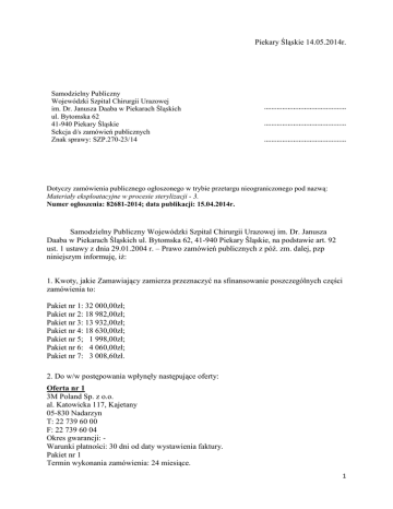 Piekary Śląskie 14.05.2014r. Samodzielny Publiczny Wojewódzki Szpital Chirurgii Urazowej im. Dr. Janusza Daaba w Piekarach Śląskich ul. Bytomska 62 41-940 Piekary Śląskie Sekcja d/s zamówień publicznych Znak sprawy: SZP.270-23/14 ……………………………………… ……………………………………… ……………………………………… Dotyczy zamówienia publicznego ogłoszonego w trybie przetargu nieograniczonego pod nazwą: Materiały eksploatacyjne w procesie sterylizacji - 3. Numer ogłoszenia: 82681-2014; data publikacji: 15.04.2014r. Samodzielny Publiczny Wojewódzki Szpital Chirurgii Urazowej im. Dr. Janusza Daaba w Piekarach Śląskich ul. Bytomska 62, 41-940 Piekary Śląskie, na podstawie art. 92 ust. 1 ustawy z dnia 29.01.2004 r. – Prawo zamówień publicznych z póź. zm. dalej, pzp niniejszym informuję, iŜ: 1. Kwoty, jakie Zamawiający zamierza przeznaczyć na sfinansowanie poszczególnych części zamówienia to: Pakiet nr 1: 32 000,00zł; Pakiet nr 2: 18 982,00zł; Pakiet nr 3: 13 932,00zł; Pakiet nr 4: 18 630,00zł; Pakiet nr 5; 1 998,00zł; Pakiet nr 6: 4 060,00zł; Pakiet nr 7: 3 008,60zł. 2. Do w/w postępowania wpłynęły następujące oferty: Oferta nr 1 3M Poland Sp. z o.o. al. Katowicka 117, Kajetany 05-830 Nadarzyn T: 22 739 60 00 F: 22 739 60 04 Okres gwarancji: Warunki płatności: 30 dni od daty wystawienia faktury. Pakiet nr 1 Termin wykonania zamówienia: 24 miesiące. 1 Cena: 13 824,00zł, po poprawieniu omyłki pisarskiej cena wynosi 33 696,00zł. Pakiet nr 2 Termin wykonania zamówienia: 12 miesięcy. Cena: 33 696,00zł, po poprawieniu omyłki pisarskiej cena wynosi 13 824,00zł. Oferta nr 2 Johnson&Johnson Poland Sp. z o.o. ul. IłŜecka 24 02-135 Warszawa T/F: 22 237 83 00 Okres gwarancji: Warunki płatności: 30 dni. Pakiet nr 6 Termin wykonania zamówienia: 24 miesiące. Cena: 4 060,80zł Oferta nr 3 Informer Med Sp. z o.o. ul. Winogrady 118 61-626 Poznań T/F: 22 237 83 00 Okres gwarancji: Warunki płatności: 30 dni. Pakiet nr 3 Termin wykonania zamówienia: 12 miesięcy. Cena: 14 785,20zł Pakiet nr 5 Termin wykonania zamówienia: 12 miesięcy. Cena: 1 134,00zł Pakiet nr 6 Termin wykonania zamówienia: 24 miesiące. Cena: 2 116,80zł Oferta nr 4 P.P.H.U. Drugaz Jacek Majewski ul. śeromskiego 44 22-800 Białobrzegi T/F: 22 446 85 10 Okres gwarancji: Warunki płatności: 30 dni. Pakiet nr 4 Termin wykonania zamówienia: 12 miesięcy. Cena: 15 390,00zł 3. Streszczenie i porównanie złoŜonych ofert: Nr pakietu 1. NR OFERTY/ OFERENT Oferta nr 1 3M Poland Sp. z o.o. PUNKTY W KRYTERIUM CENA PUNKTY RAZEM 100 100 2 2. 3. 4. 6. Oferta nr 1 3M Poland Sp. z o.o. Oferta nr 3 Informer Med Sp. z o.o. Oferta nr 4 P.P.H.U. Drugaz Jacek Majewski Oferta nr 2 Johnson&Johnson Poland Sp. z o.o. 100 100 100 100 100 100 100 100 4. Wybrano najkorzystniejszą ofertę: Pakiet 1 Oferta nr 1 3M Poland Sp. z o.o. al. Katowicka 117, Kajetany 05-830 Nadarzyn T: 22 739 60 00 F: 22 739 60 04 Okres gwarancji: Warunki płatności: 30 dni od daty wystawienia faktury. Pakiet nr 1 Termin wykonania zamówienia: 24 miesiące. Cena: 13 824,00zł, po poprawieniu omyłki pisarskiej cena wynosi 33 696,00zł. Uzasadnienie: Oferta spełnia warunki zawarte w siwz i uzyskała największą liczbę punktów w kryteriach oceny ofert a zatem na podstawie art. 91 ust 1 Pzp. oferta została uznana za najkorzystniejszą. Zamawiający podwyŜsza kwotę jaka zamierza przeznaczyć na sfinansowania zamówienia do ceny najkorzystniejszej oferty. Pakiet 2 Oferta nr 1 3M Poland Sp. z o.o. al. Katowicka 117, Kajetany 05-830 Nadarzyn T: 22 739 60 00 F: 22 739 60 04 Okres gwarancji: Warunki płatności: 30 dni od daty wystawienia faktury. Pakiet nr 2 Termin wykonania zamówienia: 12 miesięcy. Cena: 33 696,00zł, po poprawieniu omyłki pisarskiej cena wynosi 13 824,00zł. Uzasadnienie: Oferta spełnia warunki zawarte w siwz i uzyskała największą liczbę punktów w kryteriach oceny ofert a zatem na podstawie art. 91 ust 1 Pzp. oferta została uznana za najkorzystniejszą. Pakiet 3 Oferta nr 3 Informer Med Sp. z o.o. ul. Winogrady 118 61-626 Poznań T/F: 22 237 83 00 3 Okres gwarancji: Warunki płatności: 30 dni. Pakiet nr 3 Termin wykonania zamówienia: 12 miesięcy. Cena: 14 785,20zł Uzasadnienie: Oferta spełnia warunki zawarte w siwz i uzyskała największą liczbę punktów w kryteriach oceny ofert a zatem na podstawie art. 91 ust 1 Pzp. oferta została uznana za najkorzystniejszą. Zamawiający podwyŜsza kwotę jaka zamierza przeznaczyć na sfinansowania zamówienia do ceny najkorzystniejszej oferty. Pakiet 4 Oferta nr 4 P.P.H.U. Drugaz Jacek Majewski ul. śeromskiego 44 22-800 Białobrzegi T/F: 22 446 85 10 Okres gwarancji: Warunki płatności: 30 dni. Pakiet nr 4 Termin wykonania zamówienia: 12 miesięcy. Cena: 15 390,00zł Uzasadnienie: Oferta spełnia warunki zawarte w siwz i uzyskała największą liczbę punktów w kryteriach oceny ofert a zatem na podstawie art. 91 ust 1 Pzp. oferta została uznana za najkorzystniejszą. Pakiet 6 Oferta nr 2 Johnson&Johnson Poland Sp. z o.o. ul. IłŜecka 24 02-135 Warszawa T/F: 22 237 83 00 Okres gwarancji: Warunki płatności: 30 dni. Pakiet nr 6 Termin wykonania zamówienia: 24 miesiące. Cena: 4 060,80zł Uzasadnienie: Oferta spełnia warunki zawarte w siwz i uzyskała największą liczbę punktów w kryteriach oceny ofert a zatem na podstawie art. 91 ust 1 Pzp. oferta została uznana za najkorzystniejszą. Zamawiający podwyŜsza kwotę jaka zamierza przeznaczyć na sfinansowania zamówienia do ceny najkorzystniejszej oferty. 5. Nie wykluczono Ŝadnego wykonawcy: 6. Odrzucono następujące oferty: Pakiet 5 Oferta nr 3 Informer Med Sp. z o.o. ul. Winogrady 118 61-626 Poznań 4 T/F: 22 237 83 00 Okres gwarancji: Warunki płatności: 30 dni. Pakiet nr 5 Termin wykonania zamówienia: 12 miesięcy. Cena: 1 134,00zł Uzasadnienie: Wykonawca nie załączył do oferty, a na wezwanie zamawiającego w wymaganym termi