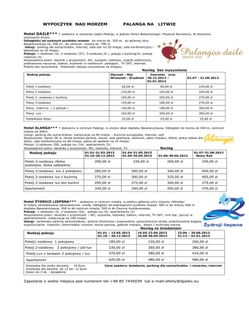 WYPOCZYEK NAD MORZEM PALANGA NA LITWIE Hotel DAILE*** - położony w zacisznej części Palangi, w poblizu Parku Botanicznego i Muzeum Bursztynu. W otoczeniu sosnowych drzew. Odległości od ważnych punktów miasta: do morza ok. 350 m, do glównej ulicy Basaneviciausa ok. 500 m , do centrum miasta ok. 700 m Usługi: parking dla samochodów, internet, kafe-bar na 50 miejsc, sala konferencyjna i bakietowa na 20 miejsc. Pokoje: 1-osobowe /4/, 2-osobowe /27/, 3-osobowe /6 /, pokoje z kuchnią/3/, pokoje rodzinne /3/. Wyposażenie pokoi: łazienki z prysznicem, WC, suszarki, lodówka, czajnik elektryczny, podstawowe naczynia, balkon, kuchenki w niektorych pokojach, TV SAT, internet. Pobyty bez wyzywienia. Mozliwość zakupu wyzywienia na miejscu. Nocleg bez wyzywienia Rodzaj pokoju Styczeń - Maj Wrzesień - Grudzień Czerwiec oraz 30.12.2013 – 01.01.2014 01.07 - 31.08.2013 Pokój 1-osobowy 65,00 zł 95,00 zł 145,00 zł Pokoj 2-osobowy 110,00 zł 165,00 zł 245,00 zł Pokój 2- osobowy z kuchnią 165,00 zł 205,00 zł 270,00 zł Pokoj 3-osobowy 125,00 zł 180,00 zł 270,00 zł Pokoj rodzinny / 2 pokoje / 135,00 zł 190,00 zł 300,00 zł Pokoj Lux 165,00 zł 205,00 zł 285,00 zł 25,00 zł 25,00 zł 25,00 zł Dodatkowe łóżko Hotel ALANGA*** - połozony w centrum Pałangi, w uliczce obok deptaku Basaneviciausa. Odległość do morza ok 450 m, centrum miasta ok.300m. Uslugi: parking dla samochodow, restauracja na 90 miejsc – kuchnia europejska, internet, sejf. Wypoczynek: basen 30 m, łaznia turecka parowa, sauna, sala sportowa, solarium, salon masazu, bilard, pokoj zabaw dla dzieci, sala konferencyjna na 60 miesjc, pokoj do spotkan na 15 miejsc. Pokoje; 2-osobowe /28/, pokoje lux /14/, apartamenty /5/. Wyposażenie pokoi: łazienka z prysznicem, WC, lodowka, internet, TV. Nocleg Rodzaj pokoju 01.01-31.03.2013 01.10-28.12.2013 Pokój 2-osobowy /łózka podwójne, łóżka oddzielne/ 200,00 zł Pokoj 2-osobowy lux 2 pokojowy 285,00 zł Pokoj 2-osobowy lux z kuchnią 01.04-31.05.2013 01.09-30.09.2013 01.06-30.06.2013 220,00 zl 01.07-31.08.2013 Nowy Rok 260,00 zł 340,00 zł 300,00 zł 340,00 zł 405,00 zł 275,00 zl 300,00 zl 325,00 zł 405,00 zł Pokój 2-osobowy lux bez kuchni 250,00 zł 275,00 zl 300,00 zl 375,00 zł Apartament 340,00 zl 350,00 zł 405,00 zl 470,00 zl Hotel ŻYDROJI LIEPSNA*** - połozony w centrum miasta, w poblizu głównej ulicy Vytauto /Witolda/. W hotelu zainstalowano panoramiczna windę. Odległość od ważniejszych punktów miasta: 900 m do morza, 600 m deptaka Basaneviciausa, 450 m do centrum miasta, 350 m do Dworca Autobusowego. Pokoje: 1-osobowe /3/, 2-osobowe /25/, pokoje lux /4/, apartamenty /2/ Wyposażenie pokoi: lazienka z prysznicem i WC, suszarka, lodowka, balkon, internet, TV SAT, mini bar, jacuzzi w apartamentach, restauracja na 100 miejsc Usługi: zamknięty parking samochodowy, pralnia chemiczna i prasowalnia, panoramiczna winda, przechowalnia bagażu, wypozyczalnia rowerów i samchodów, turecka łaznia parowa, gabinet masażu, basen I wichrowa wanna. Nocleg ze śniadaniem Rodzaj pokoju 01.01 – 15.05.2013 01.10 – 30.12.2013 16.05-22.06.2013 26.08-30.09.2013 23.06 – 26.08.2013 31.12 – 01.01.2013 Pokój1-osobowy 1 pokojowy 185,00 zł 220,00 zł 260,00 zł Pokoj 2-osobowy 330,00 zł 360,00 zł 380,00 zł Pokój Lux z tarasem 2 pokojowy / lux 370,00 zł 380,00 zł 410,00 zł Apartament 420,00 zł 480,00 zl 580,00 zł 2 pokojowy / pół lux Dostawka dla osoby dorosłej: 18 Euro Dostawka dla dziecka do 12 lat: 12 Euro Dzieci do 3 lat – bezpłatnie Cena zawiera: śniadanie, parking dla samochodów i rowerów, internet Zapytanie o wolne miejsca pod numerem tel:+48 85 7445039 lub e-mail:[email protected]
