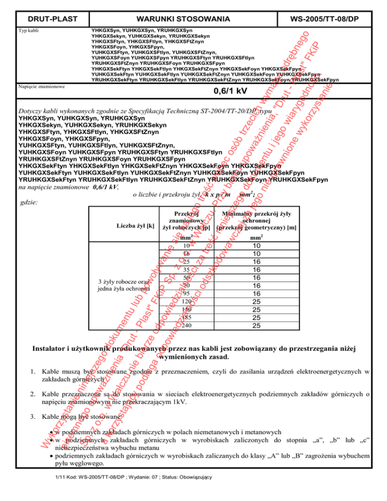 DRUT-PLAST WS-2005/TT-08/DP YHKGXSyn, YUHKGXSyn, YRUHKGXSyn YHKGXSekyn, YUHKGXSekyn, YRUHKGXSekyn YHKGXSFtyn, YHKGXSFtlyn, YHKGXSFtZnyn YHKGXSFoyn, YHKGXSFpyn, YUHKGXSFtyn, YUHKGXSFtlyn, YUHKGXSFtZnyn, YUHKGXSFoyn YUHKGXSFpyn YRUHKGXSFtyn YRUHKGXSFtlyn YRUHKGXSFtZnyn YRUHKGXSFoyn YRUHKGXSFpyn YHKGXSekFtyn YHKGXSekFtlyn YHKGXSekFtZnyn YHKGXSekFoyn YHKGXSekFpyn YUHKGXSekFtyn YUHKGXSekFtlyn YUHKGXSekFtZnyn YUHKGXSekFoyn YUHKGXSekFpyn YRUHKGXSekFtyn YRUHKGXSekFtlyn YRUHKGXSekFtZnyn YRUHKGXSekFoyn YRUHKGXSekFpyn rzy s em tani en n inie Sp ego .z up ow jszeg o.o a o ak . orz w W żnien doku a yst ia "D men ają łczu tu ru n cy po ie bie t - Pl lub p dle a ga rze o st" F owoł yw dp KiP od ow po Sp anie wie ied się zia . z o dz na ialn .o. lno ś w W jeg oś ci o ci za ałc o tre ds t ść zu zko reść . wo P nin do r z y b bec wa iejs os wc r ób ze zego aku u j za trz p d ec jeg okum owa ich ż on n e wy i ntu en ieu ma i a, i je pra ga " Dr go wn od wia ut ion Pla rębn ew ryg eg st" od yko n FK o oś rzy iP ć, sta nie . Typ kabli WARUNKI STOSOWANIA Napięcie znamionowe 0,6/1 kV Dotyczy kabli wykonanych zgodnie ze Specyfikacją Techniczną ST-2004/TT-20/DP, typu YHKGXSyn, YUHKGXSyn, YRUHKGXSyn YHKGXSekyn, YUHKGXSekyn, YRUHKGXSekyn YHKGXSFtyn, YHKGXSFtlyn, YHKGXSFtZnyn YHKGXSFoyn, YHKGXSFpyn, YUHKGXSFtyn, YUHKGXSFtlyn, YUHKGXSFtZnyn, YUHKGXSFoyn YUHKGXSFpyn YRUHKGXSFtyn YRUHKGXSFtlyn YRUHKGXSFtZnyn YRUHKGXSFoyn YRUHKGXSFpyn YHKGXSekFtyn YHKGXSekFtlyn YHKGXSekFtZnyn YHKGXSekFoyn YHKGXSekFpyn YUHKGXSekFtyn YUHKGXSekFtlyn YUHKGXSekFtZnyn YUHKGXSekFoyn YUHKGXSekFpyn YRUHKGXSekFtyn YRUHKGXSekFtlyn YRUHKGXSekFtZnyn YRUHKGXSekFoyn YRUHKGXSekFpyn na napięcie znamionowe 0,6/1 kV, o liczbie i przekroju żył. k x p / m gdzie: Liczba żył [k] 3 żyły robocze oraz jedna żyła ochronna mm2; Przekrój Minimalny przekrój żyły znamionowy ochronnej żył roboczych [p] (przekrój geometryczny) [m] mm2 10 16 25 35 50 70 95 120 150 185 240 mm2 10 10 16 16 16 16 16 25 25 25 25 Instalator i użytkownik produkowanych przez nas kabli jest zobowiązany do przestrzegania niżej wymienionych zasad. 1. Kable muszą być stosowane zgodnie z przeznaczeniem, czyli do zasilania urządzeń elektroenergetycznych w zakładach górniczych 2. Kable przeznaczone są do stosowania w sieciach elektroenergetycznych podziemnych zakładów górniczych o napięciu znamionowym nie przekraczającym 1kV. ko 3. Kable mogą być stosowane: pis Wy w podziemnych zakładach górniczych w polach niemetanowych i metanowych w podziemnych zakładach górniczych w wyrobiskach zaliczonych do stopnia „a”, „b” lub „c” niebezpieczeństwa wybuchu metanu podziemnych zakładach górniczych w wyrobiskach zaliczanych do klasy „A” lub „B” zagrożenia wybuchem pyłu węglowego. 1/11 Kod: WS-2005/TT-08/DP ; Wydanie: 07 ; Status: Obowiązujący rzy s em tani en n inie Sp ego .z up ow jszeg o.o a o ak . orz w W żnien doku a yst ia "D men ają łczu tu ru n cy po ie bie t - Pl lub p dle a ga rze o st" F owoł yw dp KiP od ow po Sp anie wie ied się zia . z o dz na ialn .o. lno ś w W jeg oś ci o ci za ałc o tre ds t ść zu zko reść . wo P nin do r z y b bec wa iejs os wc r ób ze zego aku u j za trz p d ec jeg okum owa ich ż on n e wy i ntu en ieu ma i a, i je pra ga " Dr go wn od wia ut ion Pla rębn ew ryg eg st" od yko n FK o oś rzy iP ć, sta nie . 4. Kable w pancerzu z drutów stalowych płaskich [Fp] lub okrągłych [Fo] są przeznaczone do instalowania w szybach oraz w wyrobiskach o nachyleniu do 45o i powyżej 45o. 5. Kable w pancerzu wykonane z taśm stalowych [Ft] i [Ftl] przeznaczone są do stosowania w wyrobiskach o nachyleniu do 45o. 6. Podłączenie kabla powinno być poprzedzone kontrolą braku jakichkolwiek skręceń. W tym celu należy przed montażem kabel rozciągnąć wzdłuż ściany i zlikwidować widoczne skręcenia. 7. Kable przeznaczone są do pracy w temperaturze otoczenia do +70 ºC 8. Najniższa dopuszczalna temperatura kabla przy układaniu bez podgrzewania wynosi -5°C. 9. Zginanie kabli. Przy układaniu kabli w wyrobiskach podziemnych zakładów górniczych należy unikać ich zginania ze zbyt małymi promieniami zgięcia. Dopuszcza się zginanie przy zachowaniu minimalnego promienia zgięcia równego: rg ≥ 12xdz (kable nieopancerzone) rg ≥ 15xdz (kable z pancerzem z drutów stalowych [Fo] i [Fp]) rg ≥ 20xdz (kable z pancerzem z taśm stalowych [Ft] i [Ftl]) gdzie: rg – minimalny promień zgięcia kabla [mm] dz – średnica zewnętrzna kabla [mm] 10. Mechaniczne układanie kabli Dopuszcza się mechaniczne układanie przy użyciu ciągarek wyposażonych w dynamometr, przy czym maksymalna siła ciągnąca nie może przekraczać wartości: Pmax = 50xS [N] - wszystkie rodzaje kabli przy zastosowaniu uchwytu do ciągnięcia bezpośrednio za żyły, Pmax = 50xS [N] - kable nieopancerzone lub w pancerzu z taśm stalowych przy zastosowaniu uchwytu zakładanego na powierzchnię kabla (np. pończocha), Pmax = 9xdz2 [N] - kable w pancerzu z drutów stalowych przy zastosowaniu uchwytu zakładanego na powierzchnię kabla (pończocha) gdzie: Pmax – maksymalna wartość siły ciągnącej [N] S – suma przekrojów żył roboczych kabla [mm2] dz – średnica zewnętrzna kabla [mm] Niezależnie od zastosowanego sposobu ciągnięcia kabla zaleca się stosowanie rolek prowadzących 11. Jeżeli kabel mocowany jest w wyrobiskach poziomych i o nachyleniu do 45°, zawiesza się go w odstępach nie większych niż 3 metry, na uchwytach lub wieszakach, które nie mogą powodować uszkodzenia ich opony lub zewnętrznej opony.* * Warunek wynika z punktu 7.3.10 Załącznika nr 4 do Rozporządzenia Ministra Gospodarki z 28.06.2002 roku, Dziennik Ustaw nr 139, poz. 1169 12. Jeżeli kabel mocowany jest w wyrobiskach pionowych i o nachyleniu ponad 45°, mocuje się go w uchwytach samozaciskowych rozmieszczonych w odstępach nie większych niż 6 metrów.* * Warunek wynika z punktu 7.3.11 Załącznika nr 4 do Rozpo