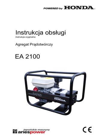 Instrukcja obsługi Instrukcja oryginalna Agregat Prądotwórczy EA 2100 2 SPIS TREŚCI WPROWADZENIE .................................................................................................................................. 4 1 ZALECENIA BEZPIECZEŃSTWA .................................................................................................... 5 2 OPIS URZĄDZENIA .......................................................................................................................... 6 2.1 2.2 Naklejki ostrzegawcze – treść i lokalizacja ............................................................................... 7 Tabliczka znamionowa – treść i lokalizacja .............................................................................. 8 3 IDENTYFIKACJA ELEMENTÓW STERUJĄCYCH .......................................................................... 9 3.1 3.2 Sterowanie silnika ..................................................................................................................... 9 Prądnica .................................................................................................................................. 10 4 EKSPLOATACJA AGREGATU ...................................................................................................... 11 4.1 4.2 4.3 4.4 4.5 Połączenie z instalacją elektryczną budynku.......................................................................... 11 Kontrola przed uruchomieniem ............................................................................................... 12 Uruchomienie agregatu ........................................................................................................... 14 Podłączanie odbiornika ........................................................................................................... 15 Wyłączanie agregatu .............................................................................................................. 16 5 PRZEGLĄDY I KONSERWACJA.................................................................................................... 16 5.1 5.2 5.3 5.4 5.5 5.6 Tabela przeglądów .................................................................................................................. 17 Wymiana oleju silnikowego ..................................................................................................... 17 Filtr powietrza .......................................................................................................................... 18 Czyszczenie osadnikowego filtra paliwa ................................................................................. 19 Świeca zapłonowa .................................................................................................................. 19 Transport i przechowywanie ................................................................................................... 20 6 DANE TECHNICZNE ....................................................................................................................... 22 7 WYPOSAŻENIE OPCJONALNE ..................................................................................................... 23 8 KATALOG CZĘŚCI ZAMIENNYCH ................................................................................................ 23 9 LISTA AUTORYZOWANYCH PUNKTÓW SERWISOWYCH ......................................................... 24 10 NOTATKI.......................................................................................................................................... 24 11 DEKLARACJA ZGODNOŚCI .......................................................................................................... 25 3 WPROWADZENIE Szanowny Kliencie!! Dziękując za okazane nam zaufanie, gratulujemy jednocześnie udanego zakupu i trafnego wyboru urządzenia z bogatej oferty naszych wyrobów. Zostałeś właścicielem agregatu prądotwórczego EA2100 z silnikiem HONDA. Mamy nadzieję, że użytkowanie tego nowego silnika spełni Twoje oczekiwania, przynosząc pełną satysfakcję. Ta instrukcja powstała abyś mógł bezproblemowo i bezawaryjnie użytkować agregat. Prosimy o jej dokładne przeczytanie przed pierwszym uruchomieniem maszyny, abyś był świadomy jakie środki ostrożności należy przedsięwziąć w trakcie jej użytkowania. Instrukcja zawiera także kompendium wiedzy przydatnej przy wykonywaniu okresowych przeglądów technicznych. Pragniemy zwrócić uwagę, że instrukcja stanowi integralną część Twojego urządzenia, powinna być zatem trzymana pod ręką, tak aby zawsze można było z niej skorzystać. Prosimy o przekazanie jej nowemu użytkownikowi w przypadku odsprzedaży urządzenia. Twój nowy agregat został zaprojektowany i wykonany zgodnie z wymaganiami bezpieczeństwa obowiązującymi w Unii Europejskiej, jednak niewłaściwie używany może powodować zagrożenia dla zdrowia i życia Użytkownika. Jeżeli używasz maszyny zgodnie z jej przeznaczeniem i informacjami zamieszczonymi w niniejszej Instrukcji Obsługi będzie on pracował wydajnie i bezawaryjnie. Proponujemy również zapoznać się z Warunkami Gwarancji, byś wiedział jakie przysługują Ci prawa i jakie są Twoje obowiązki jako Użytkownika. Karta Gwarancyjna jest osobnym dokumentem wydawanym przez Sprzedawcę w momencie sprzedaży. W przypadku niewłaściwego użytkowania wyrobu producent nie będzie ponosił odpowiedzialności z tytułu gwarancji za powstałe uszkodzenia. Wszystkie informacje zawarte w tej publikacji, oparte są na aktualnych danych o produkcie, dostępnych w chwili drukowania. ARIES Power Equipment Sp. z o.o. zastrzega sobie stałe prawo do wprowadzania zmian bez informowania o tym użytkownika i bez zaciągania jakichkolwiek zobowiązań. Żaden fragment tej publikacji nie może być powielany bez naszej pisemnej zgody. Bezpieczeństwo Twoje i innych jest dla nas sprawą priorytetową. W instrukcji i na urządzeniu 
