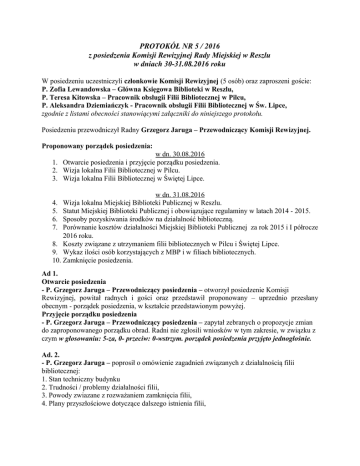 PROTOKÓŁ NR 5 / 2016 z posiedzenia Komisji Rewizyjnej Rady Miejskiej w Reszlu w dniach 30-31.08.2016 roku W posiedzeniu uczestniczyli członkowie Komisji Rewizyjnej (5 osób) oraz zaproszeni goście: P. Zofia Lewandowska – Główna Księgowa Biblioteki w Reszlu, P. Teresa Kitowska – Pracownik obsługii Filii Bibliotecznej w Pilcu, P. Aleksandra Dziemiańczyk - Pracownik obsługii Filii Bibliotecznej w Św. Lipce, zgodnie z listami obecności stanowiącymi załączniki do niniejszego protokołu. Posiedzeniu przewodniczył Radny Grzegorz Jaruga – Przewodniczący Komisji Rewizyjnej. Proponowany porządek posiedzenia: w dn. 30.08.2016 1. Otwarcie posiedzenia i przyjęcie porządku posiedzenia. 2. Wizja lokalna Filii Bibliotecznej w Pilcu. 3. Wizja lokalna Filii Bibliotecznej w Świętej Lipce. w dn. 31.08.2016 4. Wizja lokalna Miejskiej Biblioteki Publicznej w Reszlu. 5. Statut Miejskiej Biblioteki Publicznej i obowiązujące regulaminy w latach 2014 - 2015. 6. Sposoby pozyskiwania środków na działalność biblioteczną. 7. Porównanie kosztów działalności Miejskiej Biblioteki Publicznej za rok 2015 i I półrocze 2016 roku. 8. Koszty związane z utrzymaniem filii bibliotecznych w Pilcu i Świętej Lipce. 9. Wykaz ilości osób korzystających z MBP i w filiach bibliotecznych. 10. Zamknięcie posiedzenia. Ad 1. Otwarcie posiedzenia - P. Grzegorz Jaruga – Przewodniczący posiedzenia – otworzył posiedzenie Komisji Rewizyjnej, powitał radnych i gości oraz przedstawił proponowany – uprzednio przesłany obecnym - porządek posiedzenia, w kształcie przedstawionym powyżej. Przyjęcie porządku posiedzenia - P. Grzegorz Jaruga – Przewodniczący posiedzenia – zapytał zebranych o propozycje zmian do zaproponowanego porządku obrad. Radni nie zgłosili wniosków w tym zakresie, w związku z czym w głosowaniu: 5-za, 0- przeciw: 0-wstrzym. porządek posiedzenia przyjęto jednogłośnie. Ad. 2. - P. Grzegorz Jaruga – poprosił o omówienie zagadnień związanych z działalnością filii bibliotecznej: 1. Stan techniczny budynku 2. Trudności / problemy działalności filii, 3. Powody zwiazane z rozważaniem zamknięcia filii, 4. Plany przyszłościowe dotyczące dalszego istnienia filii, P. Zofia Lewnadowska wraz z P.Teresą Kitowską omówiły występujące trudności / problemy z prowadzeniem filii. Komisja uzyskała informację, że pomieszczenie było częściowo wyremontowane (malowanie) w ciągu ostatnich dwóch lat. Największym problemem jest nieszczelna stolarka okienna co jest dużym problemem w okresie zimowym. Ogrzewanie pomieszczenia odbywa się po przez piec kaflowy, który z powodu nieszczelności okien jest niewydajny. Kolejnym problemem jaki został przedstawiony to brak toalety oraz dostępu do wody. Po mimo tych trudności P. Teresa Kitowska poinformował, że filia powinna istnieć w przyszłości gdyż cieszy się dużym zainteresowaniem wśród dzieci szkoły podstawowej, które często po przyjeździe ze szkoły odrabiają lekcje / bawiają się, poza tym dzieci mogą korzystać z dostępu do internetu. Kilka razy do roku organizowane są zintegrowane zabawy, wycieczki rowerowe dla dzieci. Filia jest miejscem gdzie szczególnie dzieci spędzają swój czas wolny. Godziny pracy filii są: pn, śr, pt od 15.00-19.00 a wt, czt od 11.00-15.00. Po wysłuchaniu informacji Komisja dokonała oględzin stanu technicznego budynku. Komisja zwróciła uwagę na brak przeglądów sprzętu gaśniczego od 2008 roku. Klapa od piwnicy służacej na magazyniwanie opału jest niezabezpieczona przed otwarciem, jak również stwarza zagrożenie potencjalnie wypadkowe (potknięcie się o klapę źle zamkniętą lub wpadniecie osób jeśli nie zostanie klapa zamknięta) Komisja zwróciła uwagę na brak informacji dotyczącej godz. pracy filii. Ad. 3. P. Zofia Lewnadowska wraz z P. Aleksandrą Dziemiańczyk omówiły występujące trudności / problemy z prowadzeniem filii. Komisja uzyskała informację, że pomieszczenie było częściowo wyremontowane w ciągu ostatnich dwóch lat (toaleta). Największym problemem jest nieszczelna stolarka okienna co jest dużym problemem w okresie zimowym. Ogrzewanie pomieszczenia odbywa się panelami grzewczymi zamocowanymi pod oknami, ale z powodu nieszczelności okien takie ogrzewanie jest niewydajne oraz bardzo kosztowne. P. Zofia Lewandowska poinformowała, że koszty energii elektrycznej w ciągu roku są w granicach 4 tys. zł. P. Aleksandra Dziemiańczyk poinformowała, że filia pracuje w dni robocze w godz. 13:15-17:00. W okresie zimowym zdaża się, że mieszkańcy nie korzystają z oddziału z powodu niskich temperatur w pomieszczeniu. Komisja otrzymała również informacje że filia ponosi czynsz ponad 400zł miesiecznie. Po wysłuchaniu informacji Komisja dokonała oględzin stanu technicznego budynku. Komisja zwróciła uwagę na brak przeglądów sprzętu gaśniczego od 2008 roku. Komisja stwierdziła że wejście do biblioteki od tylnej części budynku w którym znajduje się filia jest nieoznakowane. Ad. 4. Komisja dokonała wizji lokalnej całego budynku biblioteki. Ad. 5. P. Zofia Lewandowska przekazała Komisji do wglądu statut Miejskiej Biblioteki Publicznej i obowiązujące regulaminy w latach 2014 - 2015. Następnie omówiła sposoby pozyskiwania środków na działalność biblioteczną. Ad. 6. Ad. 7. Ad. 8. Ad. 9. Komisja szczegółowo dokonała przeglądu kosztów zwiazanych z działalnością biblioteki oraz filii w Pilcu i w Św. Lipce w latach 2015 i za pierwsze półrocze 2016. Komisja poinformowana została o ilości osób korzystajacych z biblioteki. Ad. 10. Przewodniczący posiedzenia – podziękował obecnym za udział i zamknął posiedzenie Komisji. Na tym protokół zakończono. Protokołował: Grzegorz Jaruga Przewodniczący posiedzenia Grzegorz Jaruga
