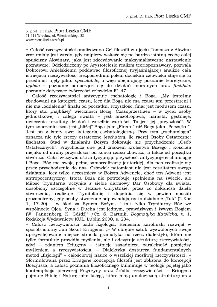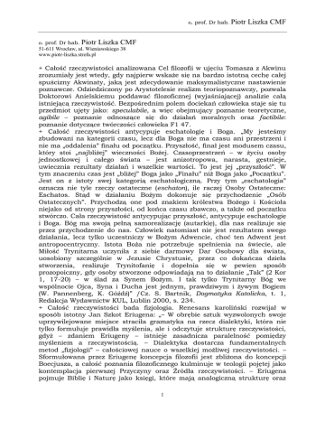 o. prof. Dr hab. Piotr Liszka CMF o. prof. Dr hab. Piotr Liszka CMF 51-611 Wrocław, ul. Wieniawskiego 38 www.piotr-liszka.strefa.pl + Całość rzeczywistości analizowana Cel filozofii w ujęciu Tomasza z Akwinu zrozumiały jest wtedy, gdy najpierw wskaże się na bardzo istotną cechę całej spuścizny Akwinaty, jaką jest zdecydowanie maksymalistyczne nastawienie poznawcze. Odziedziczony po Arystotelesie realizm teoriopoznawczy, pozwala Doktorowi Anielskiemu poddawać filozoficznej (wyjaśniającej) analizie całą istniejącą rzeczywistość. Bezpośrednim polem dociekań człowieka staje się tu przedmiot ujęty jako: speculabile, a więc obejmujący poznanie teoretyczne, agibile – poznanie odnoszące się do działań moralnych oraz factibile: poznanie dotyczące twórczości człowieka F1 47. + Całość rzeczywistości antycypuje eschatologię i Boga. „My jesteśmy zbudowani na kategorii czasu, lecz dla Boga nie ma czasu ani przestrzeni i nie ma „oddalenia” finału od początku. Przyszłość, finał jest modusem czasu, który stoi „najbliżej” wieczności Bożej. Czasoprzestrzeń – w życiu osoby jednostkowej i całego świata – jest anizotropowa, narasta, gęstnieje, uwiecznia rezultaty działań i wszelkie wartości. To jest jej „przyszłość”. W tym znaczeniu czas jest „bliżej” Boga jako „Finału” niż Boga jako „Początku”. Jest on z istoty swej kategorią eschatologiczną. Przy tym „eschatologia” oznacza nie tyle rzeczy ostateczne (eschaton), ile raczej Osoby Ostateczne: Eschatos. Stąd w działaniu Bożym dokonuje się przychodzenie „Osób Ostatecznych”. Przychodzą one pod znakiem królestwa Bożego i Kościoła niejako od strony przyszłości, od końca czasu zbawczo, a także od początku stwórczo. Cała rzeczywistość antycypując przyszłość, antycypuje eschatologię i Boga. Bóg ma swoją pełną samorealizację (autarkię), dla nas realizuje się przez przychodzenie do nas. Człowiek natomiast nie jest rezultatem swego działania, lecz tylko uczestniczy w Bożym Adwencie, choć ten Adwent jest antropocentryczny. Istota Boża nie potrzebuje spełnienia na świecie, ale Miłość Trynitarna uczyniła z siebie darmowy Dar Osobowy dla świata, uosobiony szczególnie w Jezusie Chrystusie, przez co dokańcza dzieła stworzenia, realizuje Trynitofanię i dopełnia się w pewien sposób prozopoiczny, gdy osoby stworzone odpowiadają na to działanie „Tak” (2 Kor 1, 17-20) – w ślad za Synem Bożym. I tak tylko Trynitarny Bóg we wspólnocie Ojca, Syna i Ducha jest jednym, prawdziwym i żywym Bogiem (W. Pannenberg, K. Góźdź)” /Cz. S. Bartnik, Dogmatyka Katolicka, t. 1, Redakcja Wydawnictw KUL, Lublin 2000, s. 234. + Całość rzeczywistości bada fizjologia. Renesans karoliński rozwijał w sposób istotny Jan Szkot Eriugena: „– W obrębie sztuk wyzwolonych swoje uprzywilejowane miejsce straciła gramatyka na rzecz dialektyki, która nie tylko formułuje prawidła myślenia, ale i odczytuje strukturę rzeczywistości, gdyż – zdaniem Eriugeny – istnieje zasadnicza paralelność pomiędzy myśleniem a rzeczywistością. – Dialektyka dostarcza fundamentalnych metod „fizjologii” – całościowej nauce o wszelkiej możliwej rzeczywistości. – Sformułowana przez Eriugenę koncepcja filozofii jest zbliżona do koncepcji Boecjusza, a całość poznania filozoficznego kulminuje w teologii pojętej jako kontemplacja pierwszej Przyczyny oraz Źródła rzeczywistości. – Eriugena pojmuje Biblię i Naturę jako księgi, które mają analogiczną strukturę oraz 1 o. prof. Dr hab. Piotr Liszka CMF odkrywane są w sposób analogiczny (fizyka, historia, etyka, teologia). – Eriugena uważa, że prawdziwy autorytet jest w swoich podstawach racjonalny, ma bowiem swoje źródło w Bożej Mądrości i dlatego właśnie żaden prawdziwy autorytet nie może przeciwstawiać się innemu prawdziwemu autorytetowi. – Eriugena wykazuje niezwykłą, jak na owe czasy, znajomość autorów starożytnych, chrześcijańskich oraz pogańskich, a dzięki swej pracy przekładowej udostępnia wiele pism Ojców greckich” /A. Kijewska, Eriugena jako czołowy przedstawiciel renesansu karolińskiego, w: Studia z filozoficznej tradycji chrześcijaństwa, red. M. Manikowski, Filozofia XXVIII, Wydawnictwo Uniwersytetu Wrocławskiego, Wrocław 1998, 111-132, s. 132. + Całość rzeczywistości Boga streszczona w formułach trynitarnych. Objawienie Trójcy Świętej. Pierwsze formuły trynitarne. Powstanie formuł. „Kościół pierwotny, przeniknięty objawieniem Jezusa Chrystusa, rozświetlony Jego Zmartwychwstaniem, ukształtował w sobie od razu trynitarny charakter świadomości zbiorowej i w efekcie dogmat trynitarny. Treści trynitologiczne zaczęły się wcześnie wyrażać w specjalnych formułach: katechetycznych, liturgicznych, pastoralnych, duchowościowych i innych. Wiara trynitarna nie mogła być wyczerpana w swej zawartości ontycznej i poznawczej. Była ona transcendentna, niezwykle żywa, porywająca, odsłaniająca najgłębsze tajemnice Boga, inaugurująca nową erę religijną i świecką, ale równocześnie nieporadnie trudna do wyrażenia, zwłaszcza na sposób intelektualny i językowy. Toteż rodzące się formuły na początku były przeważnie lakoniczne: Bóg (Ojciec), Syn Boży (Jezus Chrystus) i Duch Święty (same terminy jeszcze długo nie były do końca ustalone). Formuły te streszczały całą rzeczywistość Boga, stworzenia i odkupienia. Mówią one jednym tchem o wszystkich trzech odsłonach: Jahwe i przeszłość, Jezus Chrystus i teraźniejszość oraz Duch Święty (Duch Boży, Duch Jezusa) i przyszłość. A jednocześnie wszystko to oznacza jednego i tego samego Boga” /Cz. S. Bartnik, Dogmatyka katolicka, t. 1. Lublin 1999, s. 189. + Całość rzeczywistości Deus sensibilis, Mikołaj z Kuzy. Panteizm świat opisuje jako statyczny, językiem bardziej intuitywnym, mistycznymi, niż racjonal