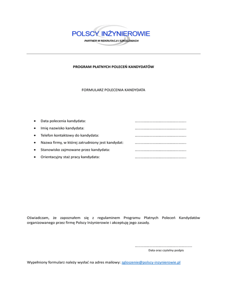 PROGRAM PŁATNYCH PŁ POLECEŃ KANDYDATÓW FORMULARZ POLECENIA KANDYDATA • Data polecenia kandydata: …………………………………………….. • Imię nazwisko kandydata: …………………………………………….. • Telefon kontaktowy do kandydata: …………………………………………….. • Nazwa firmy, my, w której zatrudniony jest kandydat: …………………………………………….. • Stanowisko zajmowane przez kandydata: …………………………………………….. • Orientacyjny staż pracy kandydata: …………………………………………….. Oświadczam, że zapoznałem się z regulaminem Programu Płatnych Poleceń Kandydatów organizowanego przez firmę Polscy Inżynierowie i akceptuję jego zasady. ………………………………………………….. Data oraz czytelny podpis Wypełniony formularz należy wysłać na adres mailowy: [email protected] inzynierowie.pl