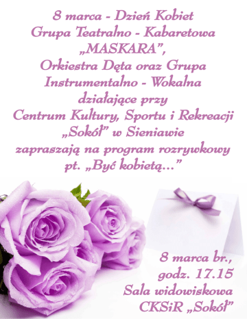 8 marca - Dzień Kobiet Grupa Teatralno - Kabaretowa „MASKARA”, Orkiestra Dęta oraz Grupa Instrumentalno - Wokalna działające przy Centrum Kultury, Sportu i Rekreacji „Sokół” w Sieniawie zapraszają na program rozrywkowy pt. „Być kobietą...” 8 marca br., godz. 17.15 Sala widowiskowa CKSiR „Sokół”
