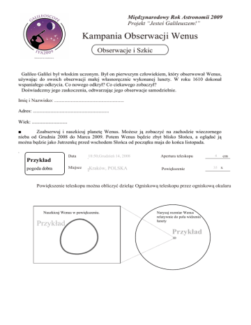 Międzynarodowy Rok Astronomii 2009 Projekt “Jesteś Galileuszem!” Kampania Obserwacji Wenus Obserwacje i Szkic Galileo Galilei był włoskim uczonym. Był on pierwszym człowiekiem, który obserwował Wenus, uŜywając do swoich obserwacji małej własnoręcznie wykonanej lunety. W roku 1610 dokonał wspaniałego odkrycia. Co nowego odkrył? Co ciekawego zobaczył? Doświadczmy jego zaskoczenia, odtwarzając jego obserwacje samodzielnie. Imię i Nazwisko: ....................................................... Adres: ............................................................ Wiek: ............................ ■ Zoabserwuj i naszkicuj planetę Wenus. MoŜesz ją zobaczyć na zachodzie wieczornego nieba od Grudnia 2008 do Marca 2009. Potem Wenus będzie zbyt blisko Słońca, a oglądać ją moŜna będzie jako Jutrzenkę przed wschodem Słońca od początku maja do końca listopada. . Przykład pogoda dobra Data 18:50,Grudzień 14, 2008 Apertura teleskopu Miejsce =Kraków, Powiększenie POLSKA 4 cm 35 x Powiększenie teleskopu moŜna obliczyć dzieląc Ogniskową teleskopu przez ogniskową okularu Naszkicuj Wenus w powiększeniu. Przykład Narysuj rozmiar Wenus relatywnie do pola widzenia lunety Przykład Pierwsza obserwacja Data Miejsce pogoda: Druga obserwacja pogoda: Apertura teleskopu cm x Powiększenie Data Apertura teleskopu Miejsce Powiększenie cm x Trzecia obserwacja pogoda: Data Miejsce Wykonaj tyle obserwacji ile zdołasz! ■ Opisz swoje obserwacje Wenus i zanotuj wszystkie zaobserwowane szczegóły. Apertura teleskopu Powiększenie cm x Karta pracy po obserwacji ■ Dlaczego widoczny kształt i rozmiar Wenus się zmienia? To zjawisko związane jest ze wzajemnym połoŜeniem Wenus, Słońca i Ziemi. Wenus i Ziemia krąŜą po swoich orbitach wokół Słońca. Narysuj widziany obraz Wenus w ramkach. Wenus widoczna wieczorem Wenus widoczna rano Wenus Wdziany rozmiar Wenus moŜe być mniejszy, poniewaŜ jest ona daleko od Ziemi. Słońce 2009.2.15 2009.3.28 Ziemia Widziany rozmiar Wenus moŜe być większy, poniewaŜ jest ona blisko Ziemi. MoŜesz zobaczyć odwrócony obraz w polu widzenia lunety ■ Podsumowanie. Czego się dowiedziałeś/aś?, co jeszcze chcesz wiedzieć? Co chcesz sprawdzić w przyszłości? Czy juŜ wiesz, co odkrył Galileusz? Jeśli tak to jesteś młodym Galileuszem! ■Czy odnotowałeś/łaś zmiany w rozmiarze i kształcie Wenus podczas swoich obserwacji? Oto Wenus w róŜnych dniach: Współczesne obserwacje i rysunki wykonane przez samego Galileusza ■Dlaczego, pozornie, rozmiar Wenus się zmienia? Pozornie wielkość tego samego obiektu zmienia się: Pomyśl o obserwowanym rozmiarze balonu: Jeśli jest blisko Jeśli jest daleko ■ Jak jest z wielkością Wenus? Kiedy Wenus jest większa, znajduje się __________________________________________ Kiedy Wenus jest mniejsza, znajduje się _________________________________________ Wypełnioną kartę przyślij na adres: z dopiskiem: Instytut Fizyki Uniwersytetu Pedagogicznego ul. PodchorąŜych 2 30-084 Kraków „Jestem Galileuszem” Dane osobowe podeane na karcie zostaną wykoŜystane tylko i wyłącznie do przygotowania i wysłania certyfikatu potwierdzającego, Ŝe zostałeś Galileuszem. Autorzy najlepszych prac obserwacyjnych na zakończenie Międzynarodowego Roku Astronomii, nagrodzeni zostaną nagrodami rzeczowymi (m. in. teleskop, ksiąŜki, mapy nieba)