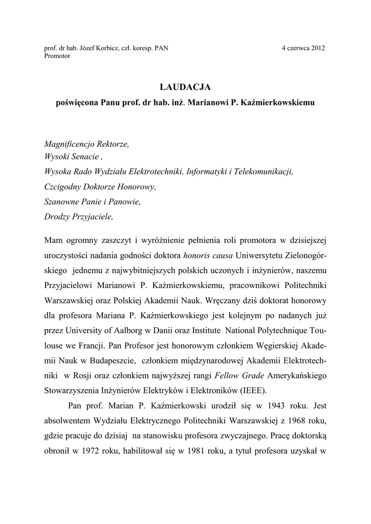 prof. dr hab. Józef Korbicz, czł. koresp. PAN Promotor 4 czerwca 2012 LAUDACJA poświęcona Panu prof. dr hab. inż. Marianowi P. Kaźmierkowskiemu Magnificencjo Rektorze, Wysoki Senacie , Wysoka Rado Wydziału Elektrotechniki, Informatyki i Telekomunikacji, Czcigodny Doktorze Honorowy, Szanowne Panie i Panowie, Drodzy Przyjaciele, Mam ogromny zaszczyt i wyróżnienie pełnienia roli promotora w dzisiejszej uroczystości nadania godności doktora honoris causa Uniwersytetu Zielonogórskiego jednemu z najwybitniejszych polskich uczonych i inżynierów, naszemu Przyjacielowi Marianowi P. Kaźmierkowskiemu, pracownikowi Politechniki Warszawskiej oraz Polskiej Akademii Nauk. Wręczany dziś doktorat honorowy dla profesora Mariana P. Kaźmierkowskiego jest kolejnym po nadanych już przez University of Aalborg w Danii oraz Institute National Polytechnique Toulouse we Francji. Pan Profesor jest honorowym członkiem Węgierskiej Akademii Nauk w Budapeszcie, członkiem międzynarodowej Akademii Elektrotechniki w Rosji oraz członkiem najwyższej rangi Fellow Grade Amerykańskiego Stowarzyszenia Inżynierów Elektryków i Elektroników (IEEE). Pan prof. Marian P. Kaźmierkowski urodził się w 1943 roku. Jest absolwentem Wydziału Elektrycznego Politechniki Warszawskiej z 1968 roku, gdzie pracuje do dzisiaj na stanowisku profesora zwyczajnego. Pracę doktorską obronił w 1972 roku, habilitował się w 1981 roku, a tytuł profesora uzyskał w 1991 roku. W 2007 roku został wybrany na członka korespondenta Polskiej Akademii Nauk. Pełni i pełnił szereg ważnych funkcji pochodzących z wyboru w krajowych i międzynarodowych instytucjach naukowych. Jest dziekanem Wydziału Nauk Technicznych PAN wybranym w 2011 roku. W latach 19992001 był zastępca prezydenta w Towarzystwie Elektroniki Przemysłowej Amerykańskiego Stowarzyszenia Inżynierów Elektryków i Elektroników. Od 1994 roku pełnił ważne funkcje w radzie programowej prestiżowego czasopisma amerykańskiego pt. IEEE Transactions on Industrial Electronics – był redaktorem naczelnym w latach 2004-2009. Jest członkiem międzynarodowej Rady pt. Power Electronics and Motion Control z siedzibą w Budapeszcie. W latach 1994-2007 był organizatorem i przewodniczącym wspólnego Oddziału Towarzystw Industrial Electronics oraz Power Electronics w Polskiej Sekcji IEEE. Ponadto w strukturach PAN od 1999 roku jest przewodniczącym Sekcji Energoelektroniki i Napędu Elektrycznego Komitetu Elektrotechniki. Jego aktywna działalność organizacyjna na Politechnice Warszawskiej to przede wszystkim kierowanie dużym Instytutem Sterowania i Elektroniki Przemysłowej w latach 1987-90 oraz 1993-2008. Aktualnie jest między innymi członkiem Senackiej Komisji ds. Organizacji Uczelni oraz przewodniczącym Komisji ds. Nauki na Wydziale Elektrycznym. Szanowni Państwo, Tematyka badawcza Profesora Mariana P. Kaźmierkowskiego sytuuje się na styku elektroniki przemysłowej, energoelektroniki oraz automatyki napędów elektrycznych. W swojej opinii Pan prof. Krzysztof Zawirski z Politechniki Poznańskiej odnotował, że „ Prof. Kaźmierkowski należy do grona światowych liderów, a w kraju energoelektronika””. jest Jego twórcą dyscypliny problematyka „Napęd obejmuje w elektryczny i szczególności zagadnienia sterowania wektorowego napędów przekształtnikowych, nowe 2 technologie przekształtników wielopoziomowych, zastosowania metod sztucznej inteligencji oraz sterowania predykcyjnego w energoelektronice, jak również zaawansowane metody sterowania sprzęgów energoelektronicznych źródeł odnawialnych z siecią energetyczną. W zakresie tej tematyki Pan Profesor wraz z zespołem otrzymał szereg oryginalnych wyników naukowych szeroko cytowanych i rozwijanych w kraju i na świecie. Jego pionierskie prace w zakresie teorii i realizacji układów sterowania wektorowego oraz falowników i prostowników tranzystorowych na bazie procesorów sygnałowych DSP stanowiły bazę naukową wdrożenia do produkcji seryjnej pierwszych w kraju przekształtników tranzystorowych ze sterowaniem wektorowym. Produkty te uzyskały szereg nagród między innymi w konkursie Siemensa (2007) oraz wyróżnienie Polski Produkt Przyszłości (2007). Pan Profesor Marian P. Kaźmierkowski jest uczonym o uznanym międzynarodowym autorytecie. Posiada bardzo bogaty dorobek naukowy zawierający monografie wydawane przez prestiżowe światowe wydawnictwa, jak Springer-Verlag, Academic Press (USA), CRC Taylor&Francis, czy PWNElsevier. Swoje artykuły publikował w wiodących czasopismach na świecie, głównie wydawanych przez Elektryków i Elektroników, Electronics, Amerykańskie Stowarzyszenie Inżynierów takich jak IEEE Transactions on Power on Industry Applications, on Industrial Electronics, czy IEEE Industrial Electronics Magazine. O wysokim uznaniu Jego pozycji naukowej na świecie świadczą liczne projekty międzynarodowe, których był kierownikiem w ostatnich latach. Między innymi kierował projektami realizowanymi w ramach 5. i 6. Programu Ramowego Unii Europejskiej, czy finansowanymi przez Fundację Marii Skłodowskiej-Curie w USA. Dużym wyróżnieniem i uznaniem dorobku naukowego w kraju było przyznanie Profesorowi Subsydium dla uczonych Fundacji Nauki Polskiej w grupie nauk technicznych w latach 20012004. Ponadto był kierownikiem wielu projektów badawczych finansowanych 3 przez Komitet Badań Naukowych, Ministerstwo Nauki i Szkolnictwa Wyższego, a ostatnio przez Narodowe Centrum Badań i Rozwoju. W Jego dorobku naukowo-badawczym duże znaczenie odgrywają projekty i wdrożenia przemysłowe realizowane wspólnie z firmami zagranicznymi np. German Company BBC Mannheim, czy krajowymi - fabryka APATOR i firma TWERD. Jest współautorem 16 patentów oraz wielu ekspertyz i raportów opracowanych dla różnych instytucji, jak np. dla Komitetu Elektrotechniki PAN, czy ostatnio dla Polskich Sieci Energetycznych S.A. W ostatnich latach Profesor zainicjował c