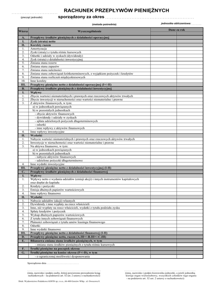 ............................ (pieczęć jednostki) RACHUNEK PRZEPŁYWÓW PIENIĘŻNYCH sporządzony za okres . . . . . . . . . . . . . . . . . . . . . . . . . . . . . . . . . . . . . . . . . . . . . . . . . . . . . . jednostka obliczeniowa: . . . . . . . (metoda pośrednia) Wiersz A. I. II. 1. 2. 3. 4. 5. 6. 7. 8. 9. 10. III. B. I. 1. 2. 3. 4. II. 1. 2. 3. 4. III. C. I. 1. 2. 3. 4. II. 1. 2. 3. 4. 5. 6. 7. 8. 9. III. D. E. F. G. Dane za rok Wyszczególnienie Przepływy środków pieniężnych z działalności operacyjnej Zysk (strata) netto Korekty razem Amortyzacja Zyski (straty) z tytułu różnic kursowych Odsetki i udziały w zyskach (dywidendy) Zysk (strata) z działalności inwestycyjnej Zmiana stanu rezerw Zmiana stanu zapasów Zmiana stanu należności Zmiana stanu zobowiązań krótkoterminowych, z wyjątkiem pożyczek i kredytów Zmiana stanu rozliczeń międzyokresowych Inne korekty Przepływy pieniężne netto z działalności operacyjnej (I+/-II) Przepływy środków pieniężnych z działalności inwestycyjnej Wpływy Zbycie wartości niematerialnych i prawnych oraz rzeczowych aktywów trwałych Zbycie inwestycji w nieruchomości oraz wartości niematerialne i prawne Z aktywów finansowych, w tym: a) w jednostkach powiązanych b) w pozostałych jednostkach - zbycie aktywów finansowych - dywidendy i udziały w zyskach - spłata udzielonych pożyczek długoterminowych - odsetki - inne wpływy z aktywów finansowych Inne wpływy inwestycyjne Wydatki Nabycie wartości niematerialnych i prawnych oraz rzeczowych aktywów trwałych Inwestycje w nieruchomości oraz wartości niematerialne i prawne Na aktywa finansowe, w tym: a) w jednostkach powiązanych b) w pozostałych jednostkach - nabycie aktywów finansowych - udzielone pożyczki długoterminowe Inne wydatki inwestycyjne Przepływy pieniężne netto z działalności inwestycyjnej (I-II) Przepływy środków pieniężnych z działalności finansowej Wpływy Wpływy netto z wydania udziałów (emisji akcji) i innych instrumentów kapitałowych oraz dopłat do kapitału Kredyty i pożyczki Emisja dłużnych papierów wartościowych Inne wpływy finansowe Wydatki Nabycie udziałów (akcji) własnych Dywidendy i inne wypłaty na rzecz właścicieli Inne, niż wypłaty na rzecz właścicieli, wydatki z tytułu podziału zysku Spłaty kredytów i pożyczek Wykup dłużnych papierów wartościowych Z tytułu innych zobowiązań finansowych Płatności zobowiązań z tytułu umów leasingu finansowego Odsetki Inne wydatki finansowe Przepływy pieniężne netto z działalności finansowej (I-II) Przepływy pieniężne netto, razem (A.III+/-B.III+/-C.III) Bilansowa zmiana stanu środków pieniężnych, w tym - zmiana stanu środków pieniężnych z tytułu różnic kursowych Środki pieniężne na początek okresu Środki pieniężne na koniec okresu (F+/-D), w tym - o ograniczonej możliwości dysponowania Sporządzono dnia . . . . . . . . . . . . . . . . . . . . . . . . . ......................................................... (imię, nazwisko i podpis osoby, której powierzono prowadzenie ksiąg rachunkowych – na podstawie art. 52 ust. 2 ustawy o rachunkowości) Druk: Wydawnictwo Podatkowe GOFIN sp. z o.o., 66-400 Gorzów Wlkp.. ul. Owocowa 8. ....................................................... (imię, nazwisko i podpis kierownika jednostki, a jeżeli jednostką kieruje organ wieloosobowy, wszystkich członków tego organu - na podstawie art. 52 ust. 2 ustawy o rachunkowości)