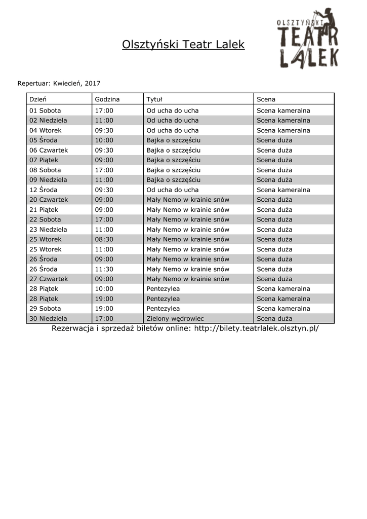 Olsztyński Teatr Lalek Repertuar: Kwiecień, 2017 Dzień Godzina Tytuł Scena 01 Sobota 17:00 Od ucha do ucha Scena kameralna 02 Niedziela 11:00 Od ucha do ucha Scena kameralna 04 Wtorek 09:30 Od ucha do ucha Scena kameralna 05 Środa 10:00 Bajka o szczęściu Scena duża 06 Czwartek 09:30 Bajka o szczęściu Scena duża 07 Piątek 09:00 Bajka o szczęściu Scena duża 08 Sobota 17:00 Bajka o szczęściu Scena duża 09 Niedziela 11:00 Bajka o szczęściu Scena duża 12 Środa 09:30 Od ucha do ucha Scena kameralna 20 Czwartek 09:00 Mały Nemo w krainie snów Scena duża 21 Piątek 09:00 Mały Nemo w krainie snów Scena duża 22 Sobota 17:00 Mały Nemo w krainie snów Scena duża 23 Niedziela 11:00 Mały Nemo w krainie snów Scena duża 25 Wtorek 08:30 Mały Nemo w krainie snów Scena duża 25 Wtorek 11:00 Mały Nemo w krainie snów Scena duża 26 Środa 09:00 Mały Nemo w krainie snów Scena duża 26 Środa 11:30 Mały Nemo w krainie snów Scena duża 27 Czwartek 09:00 Mały Nemo w krainie snów Scena duża 28 Piątek 10:00 Pentezylea Scena kameralna 28 Piątek 19:00 Pentezylea Scena kameralna 29 Sobota 19:00 Pentezylea Scena kameralna 30 Niedziela 17:00 Zielony wędrowiec Scena duża Rezerwacja i sprzedaż biletów online: http://bilety.teatrlalek.olsztyn.pl/