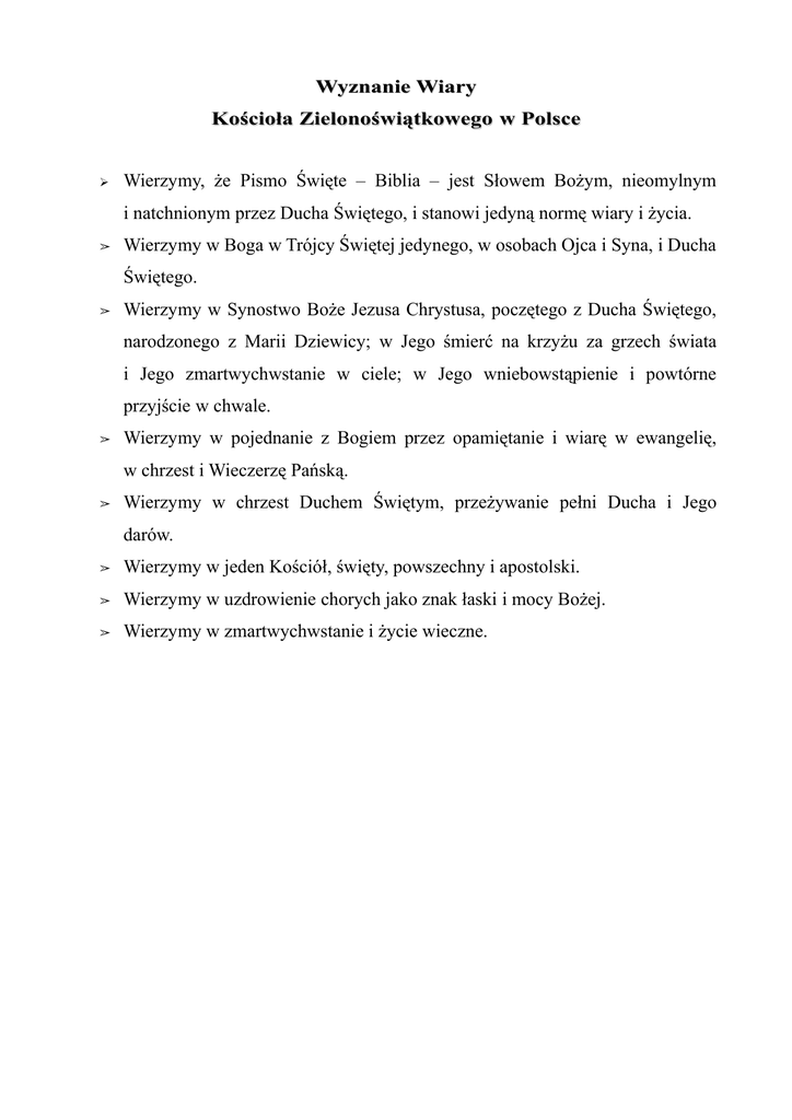 Wyznanie Wiary Kościoła Zielonoświątkowego w Polsce ➢ Wierzymy, że Pismo Święte – Biblia – jest Słowem Bożym, nieomylnym i natchnionym przez Ducha Świętego, i stanowi jedyną normę wiary i życia. ➢ Wierzymy w Boga w Trójcy Świętej jedynego, w osobach Ojca i Syna, i Ducha Świętego. ➢ Wierzymy w Synostwo Boże Jezusa Chrystusa, poczętego z Ducha Świętego, narodzonego z Marii Dziewicy; w Jego śmierć na krzyżu za grzech świata i Jego zmartwychwstanie w ciele; w Jego wniebowstąpienie i powtórne przyjście w chwale. ➢ Wierzymy w pojednanie z Bogiem przez opamiętanie i wiarę w ewangelię, w chrzest i Wieczerzę Pańską. ➢ Wierzymy w chrzest Duchem Świętym, przeżywanie pełni Ducha i Jego darów. ➢ Wierzymy w jeden Kościół, święty, powszechny i apostolski. ➢ Wierzymy w uzdrowienie chorych jako znak łaski i mocy Bożej. ➢ Wierzymy w zmartwychwstanie i życie wieczne.