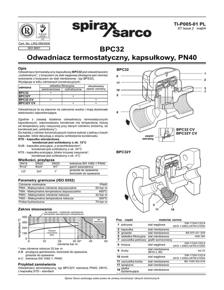 TI-P005-01 PL ST Issue 2 maj04 Cert. No. LRQ 0963008 BPC32 Odwadniacz termostatyczny, kapsu!kowy, PN40 ISO 9001 Opis Odwadniacz termostatyczny kapsu!kowy BPC32 jest odwadniaczem „rozbieralnym”, z korpusem ze stali w"glowej (dost"pne jest równie# wykonanie z korpusem ze stali nierdzewnej - typ BPS32). Wyst"puje w kilku odmianach konstrukcyjnych: wk!adka $ltracyjna wbudowany odmiana zawór zwrotny pier%cieniowa cylindryczna BPC32 • BPC32Y • BPC32 CV • • BPC32Y CV • • Odwadniacze te s& odporne na uderzenie wodne i maj& doskona!e w!a%ciwo%ci odpowietrzaj&ce. Zgodnie z zasad& dzia!ania odwadniaczy termostatycznych kapsu!kowych, odprowadzany kondensat ma temperatur" ni#sz& od temperatury pary nasyconej przy danym ci%nieniu (mówimy, #e kondensat jest „sch!odzony”). Do ka#dej z odmian konstrukcyjnych mo#na wybra' z jedn& z trzech kapsu!ek, które decyduj& o stopniu sch!odzenia kondensatu: STD - kapsu!ka standardowa, kondensat jest sch!odzony o ok. 12°C SUB - kapsu!ka pracuj&ca „z przech!odzeniem”, kondensat jest sch!odzony o ok. 24°C NTS - kapsu!ka pracuj&ca „blisko krzywej nasycenia”, kondensat jest sch!odzony o ok. 4°C BPC32 1 9 2 17 3 7 18 5 8 BPC32 CV BPC32Y CV zawór zwrotny BPC32Y Wielko#ci, przy!%cza DN15 R1/2” DN20 R3/4” DN25 R1” 1/2” 3/4” 1” ko!nierze EN 1092-1 PN40 gwint wewn"trzny gniazda do spawania, ko+cówki do spawania Parametry graniczne (ISO 6552) Ci%nienie nominalne PMA - Maksymalne ci%nienie dopuszczalne TMA - Maksymalna temperatura dopuszczalna PMO - Maksymalne ci%nienie robocze TMO - Maksymalna temperatura robocza Próba hydrauliczna PN40 50 bar m 400°C 32 bar m 300°C 75 bar m 5 Zakres stosowania 11 10 temperatura °C nie stosowa' - mo#liwo%' uszkodzenia elementów wewn"trznych odwadniacza nie stosowa' krzywa nasycenia pary ci%nienie bar m * max ci%nienie robocze 32 bar m A-B przy!&cza gwintowane, ko+cówki do spawania, gniazda do spawania A-C ko!nierze EN 1092-1, PN40 Przyk!ad zamówienia Odwadniacz termostatyczny, typ BPC32Y, ko!nierze PN40, DN15, z kapsu!k& STD - standard Poz. cz"#$ materia!, norma 1 pokrywa stal w"glowa 2 3 5 7 stal nierdzewna stal nierdzewna stal nierdzewna gra$t wzmocniony kapsu!ka gniazdo wk!adka $ltracyjna uszczelka pokrywy 8 korpus stal w"glowa 9 %ruby stal nierdzewna (M10 x 30) 10 korek stal w"glowa 11 uszczelka korka 17 spr"#yna 18 p!ytka dystansuj&ca stal nierdzewna stal nierdzewna stal nierdzewna Spirax Sarco zastrzega sobie prawo do zmiany konstrukcji i danych technicznych DIN 17243 C22.8 (W/S 1.0460) ASTM A105N BS 970 431 S29 AISI 304 DIN 17243 C22.8 (W/S 1.0460) ASTM A105N A2-70 DIN 17243 C22.8 (W/S 1.0460) ASTM A105N BS 1449 304 S16 Charakterystyki przepustowo#ci Wielko#ci, wymiary [mm], masy [kg] A A1 B C przep!yw kodensatu [kg/h] DN15 95 150 94 64 DN20 95 150 94 64 DN25 95 160 94 64 DN15 95 150 94 64 DN20 95 150 94 64 DN25 95 160 94 64 masa E F G gwint/gn. do spaw. BPC32 17 37 1,4 19 37 1,4 23 37 1,5 BPC32Y - 37 53 28 1,6 - 37 54 28 1,6 - 37 56 28 1,8 D E odst"p dla demonta#u ko!n. 2,9 3,5 4,1 3,1 3,7 4,4 B C ci%nienie ró#nicowe [bar] kondensat gor&cy D kondensat zimny F A A1 G odst"p dla demonta#u Normy, certy&katy Urz&dzenie spe!nia wymogi dyrektywy 97/23/WE Parlamentu Europejskiego, dotycz&cej urz&dze+ ci%nieniowych. Urz&dzenie mo#e by' dostarczone z certyfikatem zgodnym z EN 10204 3.1 B. Wymagania odno%nie certy$katów nale#y podawa' w zamówieniu. Cz"#ci zamienne Dost"pne cz"%ci zamienne pokazano ci&g!& lini& na rysunku obok. Dost"pne cz"#ci zamienne kapsu!ka i zespó! gniazda 2, 3, 17, 18 wk!adka $ltracyjna - pier%cieniowa (BPC32) (pakowana po 3 szt.) 5 wk!adka $ltracyjna - cylindryczna, z uszczelk& (BPC32Y) (1 kpl) 5, 11 uszczelka pokrywy (pakowana po 3 szt.) 7 uszczelka korka (pakowana po 3 szt.) 11 17 2 Przy zamawianiu cz"%ci prosimy u#ywa' okre%le+ podanych wy#ej, a tak#e poda' typ i wielko%' odwadniacza. Przyk!ad: Kapsu!ka - STD i zespó! gniazda do odwadniacza BPC32Y CV, DN15. 18 BPC32 3 7 5 Instalacja, konserwacja Odwadniacze mog& by' instalowane w poziomym lub pionowym ruroci&gu. W przypadku odprowadzania kondensatu do instalacji ci%nieniowej zalecamy zainstalowanie zaworu zwrotnego za odwadniaczem, lub stosowanie odwadniaczy odmiany CV. W przypadku odprowadzania kondensatu do atmosfery zalecamy zainstalowanie dyfuzora DF1. Dla u!atwienia konserwacji zalecamy zainstalowanie zaworów odcinaj&cych przed i za odwadniaczem. Momenty si!y zalecane przy skr"caniu lub Nm mm 3 9 10 gniazdo %ruby korek 24 A /F 17 A /F 27 A /F M10 x 30 BPC32Y 5 11 115 - 125 23 - 27 120 - 135 BPC32, Odwadniacz termostatyczny, kapsu!kowy, PN40 TI-P005-01 PL ST Issue 2 maj04