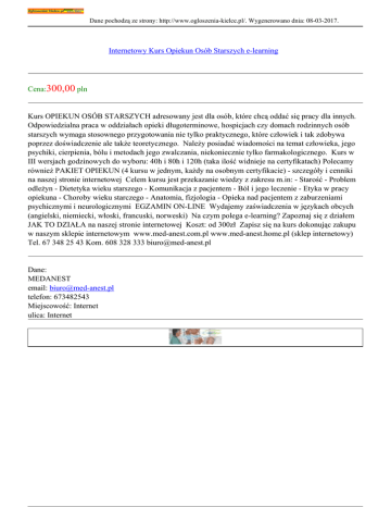 Dane pochodzą ze strony: http://www.ogloszenia-kielce.pl/. Wygenerowano dnia: 08-03-2017. Internetowy Kurs Opiekun Osób Starszych e-learning Cena:300,00 pln Kurs OPIEKUN OSÓB STARSZYCH adresowany jest dla osób, które chcą oddać się pracy dla innych. Odpowiedzialna praca w oddziałach opieki długoterminowe, hospicjach czy domach rodzinnych osób starszych wymaga stosownego przygotowania nie tylko praktycznego, które człowiek i tak zdobywa poprzez doświadczenie ale także teoretycznego. Należy posiadać wiadomości na temat człowieka, jego psychiki, cierpienia, bólu i metodach jego zwalczania, niekoniecznie tylko farmakologicznego. Kurs w III wersjach godzinowych do wyboru: 40h i 80h i 120h (taka ilość widnieje na certyfikatach) Polecamy również PAKIET OPIEKUN (4 kursu w jednym, każdy na osobnym certyfikacie) - szczegóły i cenniki na naszej stronie internetowej Celem kursu jest przekazanie wiedzy z zakresu m.in: - Starość - Problem odleżyn - Dietetyka wieku starszego - Komunikacja z pacjentem - Ból i jego leczenie - Etyka w pracy opiekuna - Choroby wieku starczego - Anatomia, fizjologia - Opieka nad pacjentem z zaburzeniami psychicznymi i neurologicznymi EGZAMIN ON-LINE Wydajemy zaświadczenia w językach obcych (angielski, niemiecki, włoski, francuski, norweski) Na czym polega e-learning? Zapoznaj się z działem JAK TO DZIAŁA na naszej stronie internetowej Koszt: od 300zł Zapisz się na kurs dokonując zakupu w naszym sklepie internetowym www.med-anest.com.pl www.med-anest.home.pl (sklep internetowy) Tel. 67 348 25 43 Kom. 608 328 333 [email protected] Dane: MEDANEST email: [email protected] telefon: 673482543 Miejscowość: Internet ulica: Internet