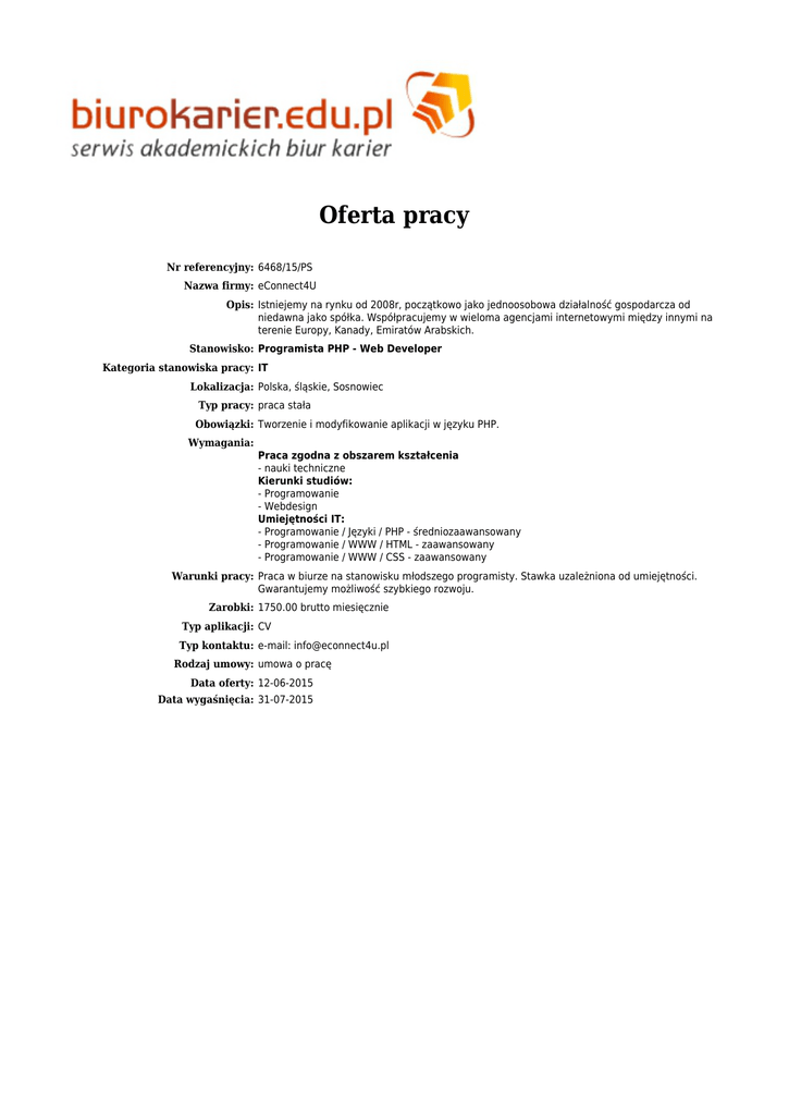 Oferta pracy Nr referencyjny: 6468/15/PS Nazwa firmy: eConnect4U Opis: Istniejemy na rynku od 2008r, początkowo jako jednoosobowa działalność gospodarcza od niedawna jako spółka. Współpracujemy w wieloma agencjami internetowymi między innymi na terenie Europy, Kanady, Emiratów Arabskich. Stanowisko: Programista PHP - Web Developer Kategoria stanowiska pracy: IT Lokalizacja: Polska, śląskie, Sosnowiec Typ pracy: praca stała Obowiązki: Tworzenie i modyfikowanie aplikacji w języku PHP. Wymagania: Praca zgodna z obszarem kształcenia - nauki techniczne Kierunki studiów: - Programowanie - Webdesign Umiejętności IT: - Programowanie / Języki / PHP - średniozaawansowany - Programowanie / WWW / HTML - zaawansowany - Programowanie / WWW / CSS - zaawansowany Warunki pracy: Praca w biurze na stanowisku młodszego programisty. Stawka uzależniona od umiejętności. Gwarantujemy możliwość szybkiego rozwoju. Zarobki: 1750.00 brutto miesięcznie Typ aplikacji: CV Typ kontaktu: e-mail: [email protected] Rodzaj umowy: umowa o pracę Data oferty: 12-06-2015 Data wygaśnięcia: 31-07-2015