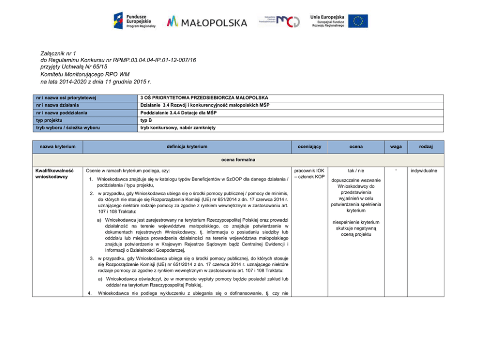 Załącznik nr 1 do Regulaminu Konkursu nr RPMP.03.04.04-IP.01-12-007/16 przyjęty Uchwałą Nr 65/15 Komitetu Monitorującego RPO WM na lata 2014-2020 z dnia 11 grudnia 2015 r. nr i nazwa osi priorytetowej 3 OŚ PRIORYTETOWA PRZEDSIEBIORCZA MAŁOPOLSKA nr i nazwa działania Działanie 3.4 Rozwój i konkurencyjność małopolskich MŚP nr i nazwa poddziałania Poddziałanie 3.4.4 Dotacje dla MŚP typ projektu typ B tryb wyboru / ścieŜka wyboru tryb konkursowy, nabór zamknięty nazwa kryterium definicja kryterium oceniający ocena waga pracownik IOK – członek KOP tak / nie - rodzaj ocena formalna Kwalifikowalność wnioskodawcy Ocenie w ramach kryterium podlega, czy: 1. Wnioskodawca znajduje się w katalogu typów Beneficjentów w SzOOP dla danego działania / poddziałania / typu projektu, 2. w przypadku, gdy Wnioskodawca ubiega się o środki pomocy publicznej / pomocy de minimis, do których nie stosuje się Rozporządzenia Komisji (UE) nr 651/2014 z dn. 17 czerwca 2014 r. uznającego niektóre rodzaje pomocy za zgodne z rynkiem wewnętrznym w zastosowaniu art. 107 i 108 Traktatu: a) Wnioskodawca jest zarejestrowany na terytorium Rzeczypospolitej Polskiej oraz prowadzi działalność na terenie województwa małopolskiego, co znajduje potwierdzenie w dokumentach rejestrowych Wnioskodawcy, tj. informacja o posiadaniu siedziby lub oddziału lub miejsca prowadzenia działalności na terenie województwa małopolskiego znajduje potwierdzenie w Krajowym Rejestrze Sądowym bądź Centralnej Ewidencji i Informacji o Działalności Gospodarczej, 3. w przypadku, gdy Wnioskodawca ubiega się o środki pomocy publicznej, do których stosuje się Rozporządzenie Komisji (UE) nr 651/2014 z dn. 17 czerwca 2014 r. uznającego niektóre rodzaje pomocy za zgodne z rynkiem wewnętrznym w zastosowaniu art. 107 i 108 Traktatu: a) Wnioskodawca oświadczył, Ŝe w momencie wypłaty pomocy będzie posiadał zakład lub oddział na terytorium Rzeczypospolitej Polskiej, 4. Wnioskodawca nie podlega wykluczeniu z ubiegania się o dofinansowanie, tj. czy nie dopuszczalne wezwanie Wnioskodawcy do przedstawienia wyjaśnień w celu potwierdzenia spełnienia kryterium niespełnienie kryterium skutkuje negatywną oceną projektu indywidualne zachodzą przesłanki określone w: a) art. 207 ust. 4 ustawy z dn. 27 sierpnia 2009 r. o finansach publicznych (j.t. Dz.U. z 2013 r., poz. 885, z późn. zm.), b) art. 12 ust. 1 pkt 1 ustawy z dn. 15 czerwca 2012 r. o skutkach powierzania wykonywania pracy cudzoziemcom przebywającym wbrew przepisom na terytorium Rzeczypospolitej Polskiej (Dz.U. z 2012 r., poz. 769), c) art. 9 ust. 1 pkt 2a ustawy z dn. 28 października 2002 r. o odpowiedzialności podmiotów zbiorowych za czyny zabronione pod groźbą kary (j.t. Dz. U. z 2015 r. poz.1212). Ocena w ramach kryterium odbywa się w oparciu o oświadczenia przedstawione przez Wnioskodawcę. Kwalifikowalność projektu Ocenie w ramach kryterium podlega, czy: pracownik IOK – członek KOP 1. projekt jest zgodny z celami danego działania / poddziałania, 2. projekt wpisuje się w typy projektów wskazane dla danego działania / poddziałania, zgodnie z SzOOP i regulaminem konkursu, 3. projekt jest zgodny z przepisami art. 65 ust. 6 i art. 125 ust. 3 lit. e) i f) Rozporządzenia Parlamentu Europejskiego i Rady (UE) nr 1303/2013 z dn. 17 grudnia 2013 r. tj. Wnioskodawca złoŜył oświadczenie, Ŝe: projekt nie został zakończony w rozumieniu art. 65 ust. 6, nie rozpoczął realizacji projektu przed dniem złoŜenia wniosku o dofinansowanie albo, Ŝe realizując projekt przed dniem złoŜenia wniosku, przestrzegał obowiązujących przepisów prawa dotyczących danej operacji (art. 125 ust. 3 lit. e), projekt nie obejmuje przedsięwzięć będących częścią operacji, które zostały objęte lub powinny były zostać objęte procedurą odzyskiwania zgodnie z art. 71 (trwałość operacji) w następstwie przeniesienia działalności produkcyjnej poza obszar objęty programem, tak / nie - indywidualne - indywidualne dopuszczalne wezwanie Wnioskodawcy do przedstawienia wyjaśnień w celu potwierdzenia spełnienia kryterium niespełnienie kryterium skutkuje negatywną oceną projektu 4. projekt (lub jego część) nie otrzymał dofinansowania z innych środków, Ocena odbywa się w oparciu o oświadczenia przedstawione przez Wnioskodawcę. 5. projekt jest realizowany na terenie województwa małopolskiego, 6. okres realizacji projektu jest zgodny z wymaganiami określonymi w regulaminie konkursu. Specyficzne warunki wstępne W ramach kryterium badane będzie, czy: 1. Wnioskodawca jest mikro-, małym lub średnim przedsiębiorcą w rozumieniu Załącznika nr 1 do rozporządzenia Komisji (UE) Nr 651/2014 uznającego niektóre rodzaje pomocy za zgodne z rynkiem wewnętrznym w zastosowaniu art. 107 i 108 Traktatu, 2. Wnioskodawca jest mikro-, małym lub średnim przedsiębiorcą działającym na rynku dłuŜej niŜ 24 m-ce, według stanu na dzień złoŜenia wniosku o dofinansowanie (zgodnie z definicją określającą sposób wyznaczania okresu działania na rynku dłuŜej niŜ 24 m-ce, zawartą w SzOOP), 3. maksymalna wartość wydatków kwalifikowanych projektu jest zgodna z limitem określonym dla danego typu projektu w SzOOP i regulaminie konkursu. 4. jeśli projekt dotyczy produkcji kotłów biomasowych o mocy poniŜej 1MW - czy w przypadku 2 pracownik IOK – członek KOP tak / nie dopuszczalne wezwanie Wnioskodawcy do przedstawienia wyjaśnień w celu potwierdzenia spełnienia kryterium niespełnienie kryterium wspierania produkcji urządzeń wytwarzających energię elektryczną i/lub ciepło z biomasy wsparcie dotyczy produkcji urządzeń do ogrzewania charakteryzujących się obowiązującym od końca 2020 r. minimalnym poziomem efektywności energetycznej i normami emisji zanieczyszczeń, które zostały określone w środkach wykonawczych do Dyrektywy 2009/125/WE z dnia 21 października 2009 r. ustanawiającej ogólne zasa
