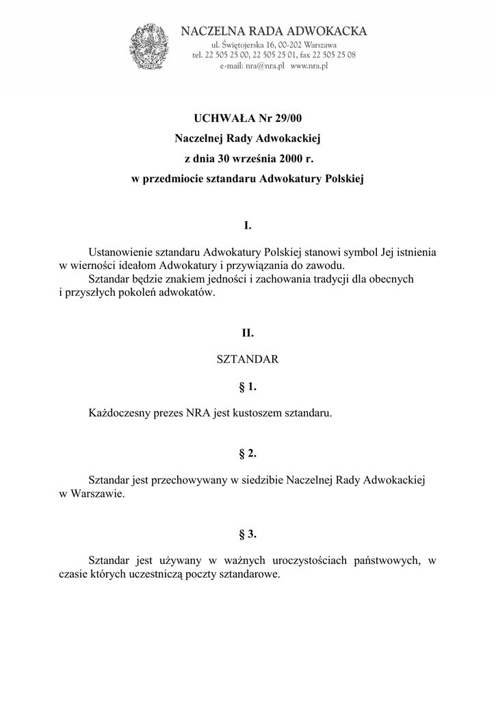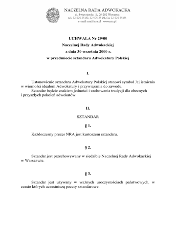 UCHWAŁA Nr 29/00 Naczelnej Rady Adwokackiej z dnia 30 września 2000 r. w przedmiocie sztandaru Adwokatury Polskiej I. Ustanowienie sztandaru Adwokatury Polskiej stanowi symbol Jej istnienia w wierności ideałom Adwokatury i przywiązania do zawodu. Sztandar będzie znakiem jedności i zachowania tradycji dla obecnych i przyszłych pokoleń adwokatów. II. SZTANDAR § 1. Każdoczesny prezes NRA jest kustoszem sztandaru. § 2. Sztandar jest przechowywany w siedzibie Naczelnej Rady Adwokackiej w Warszawie. § 3. Sztandar jest używany w ważnych uroczystościach państwowych, w czasie których uczestniczą poczty sztandarowe. § 4. Sztandar jest używany w ważnych wydarzeniach korporacyjnych jak Krajowy Zjazd Adwokatury, rocznice i uroczystości, organizowane przez Adwokaturę. § 5. Sztandar jest używany w ważnych uroczystościach żałobnych. § 6. Sztandar jest przybrany kokardą w przypadku: 1. uroczystości państwowych w barwach narodowych; 2. uroczystości korporacyjnych w barwie ciemno- zielonej; 3. uroczystości żałobnych w barwie czarnej. Poczet sztandarowy nosi szarfy odpowiedniej barwy. § 7. Za zgodą Kustosza sztandar może być użyczony wnioskującej Okręgowej Radzie Adwokackiej w związku ze szczególnie ważnymi uroczystościami lub wydarzeniami w danej Izbie Adwokackiej. § 8. Na czas użyczenia kustodię sprawuje nad sztandarem właściwy dziekan ORA. III. POCZET SZTANDAROWY § 9. Poczet sztandarowy stanowi osoba dzierżąca sztandar (chorąży) asysta składająca się z dwóch osób oraz § 10. Poczet sztandarowy wyznacza każdorazowo Kustosz (§ 1 i § 8) spośród szczególnie godnych adwokatów i aplikantów adwokackich. Fakt uczestniczenia w poczcie sztandarowym uwidocznia się w aktach osobowych. § 11. Poczet sztandarowy jest odpowiedzialny za powierzony mu sztandar i okazanie mu należnego szacunku. IV. POSTĘPOWANIE § 12. Podczas uroczystości organizowanych przez Adwokaturę zebrani powstają z miejsc w czasie wkraczania pocztu sztandarowego oraz w czasie opuszczania zgromadzenia przez tenże poczet. § 13. W przypadku użyczenia sztandaru Okręgowej Radzie Adwokackiej sztandar jest przewożony przez delegowanego w tym celu członka właściwej rady. § 14. Ustępujący Prezes NRA w sposób uroczysty przekazuje sztandar nowo wybranemu Prezesowi NRA. V. Uchwała wchodzi w życie z dniem jej uchwalenia.