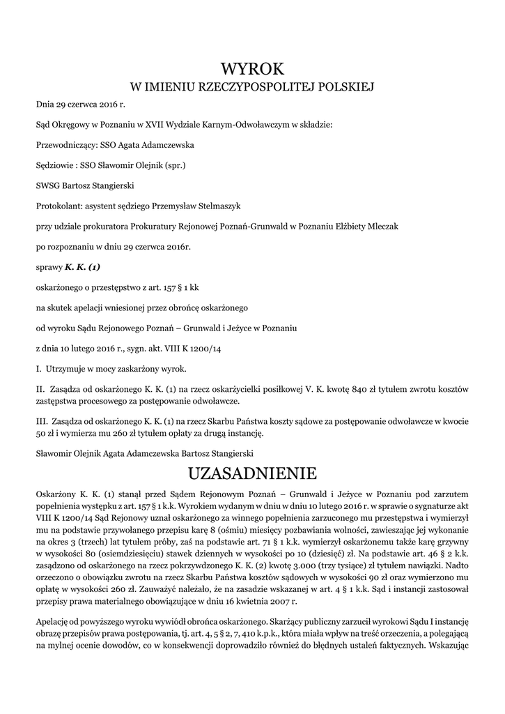 WYROK W IMIENIU RZECZYPOSPOLITEJ POLSKIEJ Dnia 29 czerwca 2016 r. Sąd Okręgowy w Poznaniu w XVII Wydziale Karnym-Odwoławczym w składzie: Przewodniczący: SSO Agata Adamczewska Sędziowie : SSO Sławomir Olejnik (spr.) SWSG Bartosz Stangierski Protokolant: asystent sędziego Przemysław Stelmaszyk przy udziale prokuratora Prokuratury Rejonowej Poznań-Grunwald w Poznaniu Elżbiety Mleczak po rozpoznaniu w dniu 29 czerwca 2016r. sprawy K. K. (1) oskarżonego o przestępstwo z art. 157 § 1 kk na skutek apelacji wniesionej przez obrońcę oskarżonego od wyroku Sądu Rejonowego Poznań – Grunwald i Jeżyce w Poznaniu z dnia 10 lutego 2016 r., sygn. akt. VIII K 1200/14 I. Utrzymuje w mocy zaskarżony wyrok. II. Zasądza od oskarżonego K. K. (1) na rzecz oskarżycielki posiłkowej V. K. kwotę 840 zł tytułem zwrotu kosztów zastępstwa procesowego za postępowanie odwoławcze. III. Zasądza od oskarżonego K. K. (1) na rzecz Skarbu Państwa koszty sądowe za postępowanie odwoławcze w kwocie 50 zł i wymierza mu 260 zł tytułem opłaty za drugą instancję. Sławomir Olejnik Agata Adamczewska Bartosz Stangierski UZASADNIENIE Oskarżony K. K. (1) stanął przed Sądem Rejonowym Poznań – Grunwald i Jeżyce w Poznaniu pod zarzutem popełnienia występku z art. 157 § 1 k.k. Wyrokiem wydanym w dniu w dniu 10 lutego 2016 r. w sprawie o sygnaturze akt VIII K 1200/14 Sąd Rejonowy uznał oskarżonego za winnego popełnienia zarzuconego mu przestępstwa i wymierzył mu na podstawie przywołanego przepisu karę 8 (ośmiu) miesięcy pozbawiania wolności, zawieszając jej wykonanie na okres 3 (trzech) lat tytułem próby, zaś na podstawie art. 71 § 1 k.k. wymierzył oskarżonemu także karę grzywny w wysokości 80 (osiemdziesięciu) stawek dziennych w wysokości po 10 (dziesięć) zł. Na podstawie art. 46 § 2 k.k. zasądzono od oskarżonego na rzecz pokrzywdzonego K. K. (2) kwotę 3.000 (trzy tysiące) zł tytułem nawiązki. Nadto orzeczono o obowiązku zwrotu na rzecz Skarbu Państwa kosztów sądowych w wysokości 90 zł oraz wymierzono mu opłatę w wysokości 260 zł. Zauważyć należało, że na zasadzie wskazanej w art. 4 § 1 k.k. Sąd i instancji zastosował przepisy prawa materialnego obowiązujące w dniu 16 kwietnia 2007 r. Apelację od powyższego wyroku wywiódł obrońca oskarżonego. Skarżący publiczny zarzucił wyrokowi Sądu I instancję obrazę przepisów prawa postępowania, tj. art. 4, 5 § 2, 7, 410 k.p.k., która miała wpływ na treść orzeczenia, a polegającą na mylnej ocenie dowodów, co w konsekwencji doprowadziło również do błędnych ustaleń faktycznych. Wskazując na powyższe uchybienia, apelujący wniósł o zmianę zaskarżonego wyroku poprzez uniewinnienie oskarżonego, a ewentualnie o uchylenie zaskarżonego wyroku i przekazanie sprawy do ponownego rozpoznania Sądowi I instancji. Sąd Okręgowy zważył co następuje: Apelacja okazała się niezasadna, zaś żaden z postawionych zarzutów nie mógł doprowadzić do uchylenia bądź zmiany zaskarżonego wyroku. Na wstępie należało poczynić kilka uwag o charakterze teoretycznoprawnych, gdyż skarżący wspiera praktycznie każdy zarzut skierowany do oceny dowodów dokonanej przez Sąd Rejonowy, obrazą art. 4, 7 i 410 k.p.k., zaś naruszenie art. 5 § 2 k.p.k. miało być jedynie skutkiem uchybienia wszystkim powyższym przepisów karnoprocesowych. Skuteczne posłużenie się przez skarżącego zarzutem naruszenia art. 5 § 2 k.p.k. może przynieść oczekiwany efekt jedynie wówczas, gdy zostanie wykazane, że orzekający w sprawie sąd rzeczywiście miał wątpliwości o takim charakterze i rozstrzygnął je na niekorzyść oskarżonego. Dla zasadności tego zarzutu nie wystarczy zaś zaprezentowanie przez stronę własnych wątpliwości co do stanu dowodów. Cytowany przepis wprost odnosi się do istnienia wątpliwości przy ustalaniu stanu faktycznego po stronie sądu orzekającego, a takie w przedmiotowej sprawie nie wystąpiły. Zgromadzony w toku postępowania materiał dowodowy wystarczył do skazania oskarżonego, gdyż ustawa procesowa nie daje podstaw do preferowania lub dyskwalifikowania dowodu według kryterium, czy jest on korzystny, czy też obciążający dla oskarżonego. O wartości dowodu decyduje bowiem jego treść, to znaczy wewnętrzna spójność, konsekwencja oraz przewaga w konfrontacji z innymi dowodami. Każdy dowód musi być oceniony na tle wszystkich pozostałych dowodów zebranych w sprawie. Sąd meriti ma również uprawnienie do odmówienia wiarygodności wyjaśnieniom oskarżonego. Reasumując, nie wolno korzystać z rozwiązania wskazanego w art. 5 § 2 k.p.k., gdy nasuwające się wątpliwości mogą być usunięte przy zastosowaniu oceny zebranego materiału dowodowego zgodnie ze standardami wytyczonymi przez zasadę z art. 7 k.p.k. Ocena materiału dowodowego została przeprowadzona zgodnie z zasadą swobodnej oceny dowodów, albowiem została poprzedzona ujawniona ujawnieniem całokształtu okoliczności sprawy, stanowiła wyraz rozważenia zarówno okoliczności przemawiających na korzyść, jak i niekorzyść oskarżonego oraz była zgodna ze wskazaniami wiedzy i doświadczenia życiowego. Z kolei przepis art. 4 k.p.k. definiuje jedynie jedną z podstawowych zasad procesowych, zasadę obiektywizmu. Jako taki nie może stać się bezpośrednim przedmiotem zarzutu odwoławczego z art. 438 pkt 2 k.p.k. Dla skutecznego dowiedzenia naruszenia przez sąd tejże zasady konieczne jest wskazanie obrazy konkretnych przepisów procedury karnej, których przestrzeganie prowadzi do realizacji zasady obiektywizmu. Tymczasem skarżący wiąże zarzut naruszenia tego przepisu z naruszeniem art. 7 i 410 k.p.k., których uchybienia Sąd Okręgowy nie stwierdził. Nie można mówić też o naruszeniu przepisu art. 410 k.p.k., gdy apelujący kwestionuje faktycznie ocenę dowodów przeprowadzonego lub ujawnionego na rozprawie, gdyż takiej oceny dotyczy art. 7 k.p.