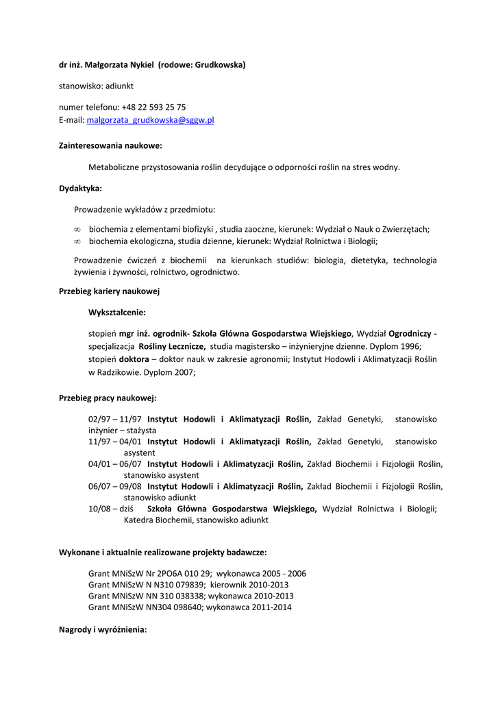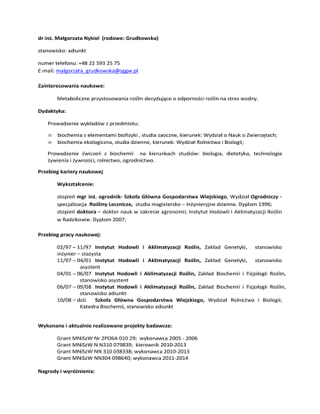 dr inż. Małgorzata Nykiel (rodowe: Grudkowska) stanowisko: adiunkt numer telefonu: +48 22 593 25 75 E-mail: [email protected] Zainteresowania naukowe: Metaboliczne przystosowania roślin decydujące o odporności roślin na stres wodny. Dydaktyka: Prowadzenie wykładów z przedmiotu: • • biochemia z elementami biofizyki , studia zaoczne, kierunek: Wydział o Nauk o Zwierzętach; biochemia ekologiczna, studia dzienne, kierunek: Wydział Rolnictwa i Biologii; Prowadzenie ćwiczeń z biochemii na kierunkach studiów: biologia, dietetyka, technologia żywienia i żywności, rolnictwo, ogrodnictwo. Przebieg kariery naukowej Wykształcenie: stopień mgr inż. ogrodnik- Szkoła Główna Gospodarstwa Wiejskiego, Wydział Ogrodniczy specjalizacja Rośliny Lecznicze, studia magistersko – inżynieryjne dzienne. Dyplom 1996; stopień doktora – doktor nauk w zakresie agronomii; Instytut Hodowli i Aklimatyzacji Roślin w Radzikowie. Dyplom 2007; Przebieg pracy naukowej: 02/97 – 11/97 Instytut Hodowli i Aklimatyzacji Roślin, Zakład Genetyki, stanowisko inżynier – stażysta 11/97 – 04/01 Instytut Hodowli i Aklimatyzacji Roślin, Zakład Genetyki, stanowisko asystent 04/01 – 06/07 Instytut Hodowli i Aklimatyzacji Roślin, Zakład Biochemii i Fizjologii Roślin, stanowisko asystent 06/07 – 09/08 Instytut Hodowli i Aklimatyzacji Roślin, Zakład Biochemii i Fizjologii Roślin, stanowisko adiunkt 10/08 – dziś Szkoła Główna Gospodarstwa Wiejskiego, Wydział Rolnictwa i Biologii; Katedra Biochemii, stanowisko adiunkt Wykonane i aktualnie realizowane projekty badawcze: Grant MNiSzW Nr 2PO6A 010 29; wykonawca 2005 - 2006 Grant MNiSzW N N310 079839; kierownik 2010-2013 Grant MNiSzW NN 310 038338; wykonawca 2010-2013 Grant MNiSzW NN304 098640; wykonawca 2011-2014 Nagrody i wyróżnienia: • • • Nagroda rektora Szkoły Głównej Gospodarstwa Wiejskiego w Warszawie. Zespołowa Stopnia II za osiągnięcia naukowe. 2012. Nagroda rektora Szkoły Głównej Gospodarstwa Wiejskiego w Warszawie. Indywidualna III za osiągnięcia naukowe. 2011. Nagroda rektora Szkoły Głównej Gospodarstwa Wiejskiego w Warszawie. Zespołowa Stopnia I za osiągnięcia naukowe. 2010 Publikacje: 1. 2. 3. 4. 5. 6. 7. 8. 9. Grudkowska M., Madej L.2001. Struktura plonu wybranych linii wsobnych żyta ozimego. Biul. IHAR 218/219. Grudkowska M, Wiśniewski K., Zagdańska B. 2002. Aktywność endoproteinaz cysteinowych wskaźnikiem odporności pszenicy na mróz i suszę. Biul. IHAR 223/224, 45-8-55. Grudkowska M, Zagdańska B. 2002. Roślinne Endoproteinazy cysteinowe i ich różnorodne funkcje fizjologiczne. Biul. IHAR 223/224, 33-43. Grudkowska M, Zagdańska B, Rybka B. 2003. Odporność pszenicy jarej na suszę glebową w fazie kłoszenia. Biul. IHAR 228, 51-59 Grudkowska M, Zagdańska B. 2004. Multifunctional role of plant cysteine proteinases. Acta Biochim. Polon. 51, 609-624. Boguszewska D, Grudkowska M, Zagdańska B. 2009. Plant Biochemistry. S.S.Narwal (Series Editor), R. Bogatek, B. Zagdańska, D.A. Sampietro, M. A. Vattuone (co-editors), Studium Press, LLC. ISBN 1-933699-43-4, str. 69-98. Grudkowska M., Zagdańska B. 2010. Acclimation to frost alters proteolytic response of wheat seedlings to drought. J. Plant Physiol. 167:1321-1327 Boguszewska D., Grudkowska M., Zagdańska B. 2010. Drought-responsive antioxidant enzymes in potato (Solanum tuberosum L. ). Pot. Res. 53:373-382 Grudkowska M, Lisik P., Rybka K. 2013. Two-dimensional zymography in detection of proteolytic enzymes in wheat leaves. Acta Physiologiae Plantarum (po recenzjach) Udział w konferencjach: 1. 2. 3. 4. 5. 6. Grudkowska M., Madej L. 2001. Struktura plonu wybranych linii wsobnych żyta ozimego. Zimowe spotkania grup problemowych ds. hodowli pszenicy, pszenżyta, żyta, jęczmienia, owsa i kukurydzy. ,,Nauka dla hodowli zbóż”. Biul. IHAR 218/219. Grudkowska M, Wiśniewski K., Zagdańska B. 2002. Aktywność endoproteinaz cysteinowych wskaźnikiem odporności pszenicy na mróz i suszę. XXXVII Zjazd PTBioch. Toruń. 2001. Grudkowska M, Zagdańska B. 2004. Cysteine endoproteinases in wheat leaves upon water deficit. Book of Abstract. Acta Physiol. Plant. 26(3), 194-195. 14th Congress of the Federation of European Societies of Plant Biology (FESPB). Kraków Grudkowska M, Zagdańska B. 2005. Cysteine proteinases in wheat leaves upon water deficit. INTERDROUGHT II. Rzym. Grudkowska M, Zagdańska B. 2005. Involvement of cysteine proteinase in acclimation of wheat to water deficiency. II Konferencja Polskiego Towarzystwa Biologii Eksperymentalnej Roślin Boguszewska D, Grudkowska M, Zagdańska B, 2008. Peroxidase isoenzymes pattern and total activity in tubers of potato cultivars differing in dehydratation tolerance. Physiologia Plantarum. Special Issue: Redox Sugnal Integration. Vol. 133. Issue 3: Abstract P09-39 7. Boguszewska D, Grudkowska M, Zagdańska B. 2009. Antioxidant responses in tubers of potato cultivars in dehydratation tolerance. Mat konf. 4th Conference of Polish Society of Experimental Plant Biology, 21-25 Wrzesień; Acta Biologia Cracoviensia s.51 8. Boguszewska D, Grudkowska M, Zagdańska B. 2009. Superoxide dismutases isoenzymes pattern and total activity in tubers of potato cultivars differing in dehydratation tolerance. Mat konf. XLIV Annual Meeting of the Polish Biochemical Society, Łódź 16-19 Wrzesień; Acta Biochemica Polonica s.93. 9. Boguszewska D., Grudkowska M, Zagdańska B, 2010 Drought responsive antioxidant enzymes in potato (Solanum tuberosum L), Mat konf. Potato AgroPhysiology Proceedings of the international symposium on agronomy and physiology of potato, 20-24 wrzesień, 2010, Nevsehir, Turcja, s.130. 10. Boguszewska D., Grudkowska M, Zagdańska B, 2010. Zmiany ekspresji białek w warunkach odwodnienia. Konferencja naukowa „Tradycja i nowoczesność w produkcji ziemniaka”, Jadwisin, 7- 9.07.2010, Mat. Konf s.31 11. Boguszewska D., Grudkowska M, Zagdańska B, 2010. Potential redox in potato (Solanum t