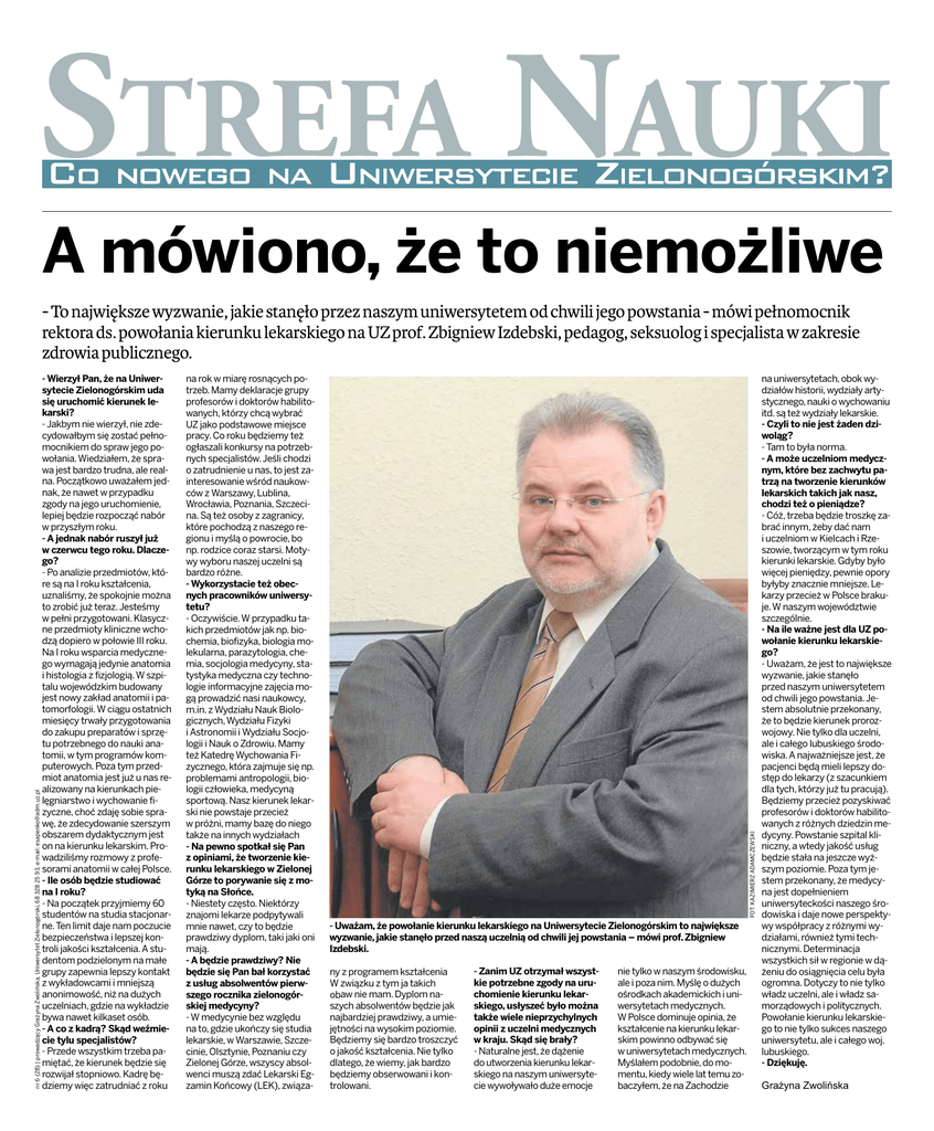 A mówiono, że to niemożliwe - Wierzył Pan, że na Uniwersytecie Zielonogórskim uda się uruchomić kierunek lekarski? - Jakbym nie wierzył, nie zdecydowałbym się zostać pełnomocnikiem do spraw jego powołania. Wiedziałem, że sprawa jest bardzo trudna, ale realna. Początkowo uważałem jednak, że nawet w przypadku zgody na jego uruchomienie, lepiej będzie rozpocząć nabór w przyszłym roku. - A jednak nabór ruszył już w czerwcu tego roku. Dlaczego? - Po analizie przedmiotów, które są na I roku kształcenia, uznaliśmy, że spokojnie można to zrobić już teraz. Jesteśmy w pełni przygotowani. Klasyczne przedmioty kliniczne wchodzą dopiero w połowie III roku. Na I roku wsparcia medycznego wymagają jedynie anatomia i histologia z fizjologią. W szpitalu wojewódzkim budowany jest nowy zakład anatomii i patomorfologii. W ciągu ostatnich miesięcy trwały przygotowania do zakupu preparatów i sprzętu potrzebnego do nauki anatomii, w tym programów komputerowych. Poza tym przedmiot anatomia jest już u nas realizowany na kierunkach pielęgniarstwo i wychowanie fizyczne, choć zdaję sobie sprawę, że zdecydowanie szerszym obszarem dydaktycznym jest on na kierunku lekarskim. Prowadziliśmy rozmowy z profesorami anatomii w całej Polsce. - Ile osób będzie studiować na I roku? - Na początek przyjmiemy 60 studentów na studia stacjonarne. Ten limit daje nam poczucie bezpieczeństwa i lepszej kontroli jakości kształcenia. A studentom podzielonym na małe grupy zapewnia lepszy kontakt z wykładowcami i mniejszą anonimowość, niż na dużych uczelniach, gdzie na wykładzie bywa nawet kilkaset osób. - A co z kadrą? Skąd weźmiecie tylu specjalistów? - Przede wszystkim trzeba pamiętać, że kierunek będzie się rozwijał stopniowo. Kadrę będziemy więc zatrudniać z roku na rok w miarę rosnących potrzeb. Mamy deklaracje grupy profesorów i doktorów habilitowanych, którzy chcą wybrać UZ jako podstawowe miejsce pracy. Co roku będziemy też ogłaszali konkursy na potrzebnych specjalistów. Jeśli chodzi o zatrudnienie u nas, to jest zainteresowanie wśród naukowców z Warszawy, Lublina, Wrocławia, Poznania, Szczecina. Są też osoby z zagranicy, które pochodzą z naszego regionu i myślą o powrocie, bo np. rodzice coraz starsi. Motywy wyboru naszej uczelni są bardzo różne. - Wykorzystacie też obecnych pracowników uniwersytetu? - Oczywiście. W przypadku takich przedmiotów jak np. biochemia, biofizyka, biologia molekularna, parazytologia, chemia, socjologia medycyny, statystyka medyczna czy technologie informacyjne zajęcia mogą prowadzić nasi naukowcy, m.in. z Wydziału Nauk Biologicznych, Wydziału Fizyki i Astronomii i Wydziału Socjologii i Nauk o Zdrowiu. Mamy też Katedrę Wychowania Fizycznego, która zajmuje się np. problemami antropologii, biologii człowieka, medycyną sportową. Nasz kierunek lekarski nie powstaje przecież w próżni, mamy bazę do niego także na innych wydziałach - Na pewno spotkał się Pan z opiniami, że tworzenie kierunku lekarskiego w Zielonej Górze to porywanie się z motyką na Słońce. - Niestety często. Niektórzy znajomi lekarze podpytywali mnie nawet, czy to będzie prawdziwy dyplom, taki jaki oni mają. - A będzie prawdziwy? Nie będzie się Pan bał korzystać z usług absolwentów pierwszego rocznika zielonogórskiej medycyny? - W medycynie bez względu na to, gdzie ukończy się studia lekarskie, w Warszawie, Szczecinie, Olsztynie, Poznaniu czy Zielonej Górze, wszyscy absolwenci muszą zdać Lekarski Egzamin Końcowy (LEK), związa- FOT. KAZIMIERZ ADAMCZEWSKI nr 6 (28) | prowadzący Grażyna Zwolińska, Uniwersytet Zielonogórski, 68 328 25 93, e-mail: [email protected] - To największe wyzwanie, jakie stanęło przez naszym uniwersytetem od chwili jego powstania - mówi pełnomocnik rektora ds. powołania kierunku lekarskiego na UZ prof. Zbigniew Izdebski, pedagog, seksuolog i specjalista w zakresie zdrowia publicznego. - Uważam, że powołanie kierunku lekarskiego na Uniwersytecie Zielonogórskim to największe wyzwanie, jakie stanęło przed naszą uczelnią od chwili jej powstania – mówi prof. Zbigniew Izdebski. ny z programem kształcenia W związku z tym ja takich obaw nie mam. Dyplom naszych absolwentów będzie jak najbardziej prawdziwy, a umiejętności na wysokim poziomie. Będziemy się bardzo troszczyć o jakość kształcenia. Nie tylko dlatego, że wiemy, jak bardzo będziemy obserwowani i kontrolowani. - Zanim UZ otrzymał wszystkie potrzebne zgody na uruchomienie kierunku lekarskiego, usłyszeć było można także wiele nieprzychylnych opinii z uczelni medycznych w kraju. Skąd się brały? - Naturalne jest, że dążenie do utworzenia kierunku lekarskiego na naszym uniwersytecie wywoływało duże emocje nie tylko w naszym środowisku, ale i poza nim. Myślę o dużych ośrodkach akademickich i uniwersytetach medycznych. W Polsce dominuje opinia, że kształcenie na kierunku lekarskim powinno odbywać się w uniwersytetach medycznych. Myślałem podobnie, do momentu, kiedy wiele lat temu zobaczyłem, że na Zachodzie na uniwersytetach, obok wydziałów historii, wydziały artystycznego, nauki o wychowaniu itd. są też wydziały lekarskie. - Czyli to nie jest żaden dziwoląg? - Tam to była norma. - A może uczelniom medycznym, które bez zachwytu patrzą na tworzenie kierunków lekarskich takich jak nasz, chodzi też o pieniądze? - Cóż, trzeba będzie troszkę zabrać innym, żeby dać nam i uczelniom w Kielcach i Rzeszowie, tworzącym w tym roku kierunki lekarskie. Gdyby było więcej pieniędzy, pewnie opory byłyby znacznie mniejsze. Lekarzy przecież w Polsce brakuje. W naszym województwie szczególnie. - Na ile ważne jest dla UZ powołanie kierunku lekarskiego? - Uważam, że jest to największe wyzwanie, jakie stanęło przed naszym uniwersytetem od chwili jego powstania. Jestem absolutnie przekonany, że to będzie kierunek prorozwojowy. Nie tylko dla u