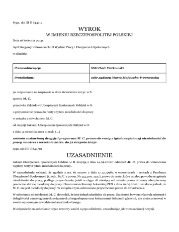 Sygn. akt III U 644/12 WYROK W IMIENIU RZECZYPOSPOLITEJ POLSKIEJ Dnia 16 kwietnia 2013r. Sąd Okręgowy w Suwałkach III Wydział Pracy i Ubezpieczeń Społecznych w składzie: Przewodniczący: SSO Piotr Witkowski Protokolant: sekr.sądowy Marta Majewska-Wronowska po rozpoznaniu na rozprawie w dniu 16 kwietnia 2013r. w S. sprawy M. C. przeciwko Zakładowi Ubezpieczeń Społecznych Oddział w O. o przywrócenie prawa do renty z tytułu niezdolności do pracy w związku z odwołaniem M. C. od decyzji Zakładu Ubezpieczeń Społecznych Oddział w O. z dnia 14 września 2012 r. znak (...) zmienia zaskarżoną decyzję i przywraca M. C. prawo do renty z tytułu częściowej niezdolności do pracy na okres 1 września 2012r. do 31 sierpnia 2013r. sygn. akt III U 644/12 UZASADNIENIE Zakład Ubezpieczeń Społecznych Oddział w B. decyzją z dnia 14.09.2012r. odmówił M. C. prawa do wznowienia wypłaty renty z tytułu niezdolności do pracy. W uzasadnieniu wskazał, że zgodnie z art. 61 ustawy z dnia 17.12.1998r. o emeryturach i rentach z Funduszu Ubezpieczeń Społecznych (t. jedn. Dz.U. z 2009r. Nr 153, poz. 1227), prawo do renty, które ustało z powodu ustąpienia niezdolności do pracy, podlega przywróceniu, jeżeli w ciągu 18 miesięcy od ustania prawa do renty ubezpieczony ponownie stał się niezdolny do pracy. Orzeczeniem Komisji Lekarskiej ZUS z dnia 10.09.2012r. ustalono jednak, że M. C. nie jest niezdolny do pracy. W związku z tym odmówiono przywrócenia prawa do świadczenia. W odwołaniu od tej decyzji M. C. dowodził, że jest jednak niezdolny do pracy. Na skutek bowiem różnych schorzeń i dolegliwości neurologicznych związanych z kręgosłupem oraz kończynami dolnymi i górnymi, nie może pracować w swoim wyuczonym zawodzie malarza budowlanego. W odpowiedzi na odwołanie organ rentowy wniósł o jego oddalenie, uzasadniając jak w zaskarżonej decyzji. Sąd Okręgowy w Suwałkach ustalił i zważył, co następuje: Odwołanie należało uznać za uzasadnione. Prawo do renty, które ustało z powodu ustąpienia niezdolności do pracy, podlega zgodnie z art. 61 ustawy o emeryturach i rentach z FUS przywróceniu, jeżeli w ciągu 18 miesięcy od jego ustania ubezpieczony ponownie stał się niezdolny do pracy. Odwołującego zaś należało uznać za nadal częściowo niezdolnego do pracy. Na potrzeby Zakładu Ubezpieczeń Społecznych oceny niezdolności do pracy, stosownie do art. 14 ust. 1, 2a i 2e ustawy o emeryturach i rentach z FUS, dokonuje w formie orzeczenia lekarz orzecznik Zakładu, a gdy osoba zainteresowana wniesie od tego orzeczenia sprzeciw – komisja lekarska Zakładu. Na potrzeby natomiast postępowania sądowego stosownej oceny niezdolności do pracy dokonują na podstawie art. 278 kpc biegli lekarze sądowi. Dwa zespoły ;biegłych sądowych uznało natomiast, że stwierdzone u odwołującego się schorzenia i stopień ich nasilenia klinicznego powodują u niego częściową niezdolność do pracy zarobkowej od 1.09.2012r. do 31.08.2013r. (jeden rok). Pierwszy zespół biegłych lekarzy sądowych z listy Sądu Okręgowego w Suwałkach w osobach K. J. z zakresu neurologii i G. K. z zakresu ortopedii rozpoznał u odwołującego się przepuklinę krążka międzykręgowego L5S1 oraz dyskopatię wielopoziomową L2-L3, L3-L4 i L4-L5, stenozę kanału kręgowego na poziomie L4-L5 operowaną w 2000r., zespół bólowy korzeniowy z objawami ubytkowymi okolicy L-S, przepuklinę krążka międzykręgowego C3C4 i C4-C5, pourazową artrozę łokcia prawego z niewielkim ograniczeniem funkcji, zagojone złamanie prawej rzepki bez ograniczeń funkcji oraz stan po operacji prawej stopy końsko-szpotawej. Drugi zespół biegłych sądowych z listy Sądu Okręgowego w Białymstoku w osobach T. P. z zakresu neurologii i C. K. z zakresu ortopedii i traumatologii, rozpoznał u odwołującego się przepuklinę krezka L5/S1 z objawami rwy kulszowej lewostronnej i wielopoziomową dyskopatię lędźwiową, przebytą operację stenozy kanału kręgowego L4/L5 w roku 2000, dyskopatię szyjną C3/C4, C4/C5 z zespołem bólowym i ograniczeniem ruchomości w odcinku szyjnym, przykurcz stawu łokciowego prawego po przebytym złamaniu nasady dolnej kości ramieniowej prawej, ucisk nerwu łokciowego na poziomie łokcia prawego i wygojone złamanie rzepki. Rozpoznane schorzenia przez dwa zespoły biegłych są tożsame bądź bardzo podobne. Tak jednak pierwszy, jak i drugi zespół biegłych lekarzy nie miał wątpliwości, że odwołujący się jest nadal częściowo niezdolny do pracy zarobkowej, a jego stan zdrowia nie uległ poprawie w stosunku do badań z 2009r. Wbrew więc stanowisku organu rentowego nie można odwołującego się uznać za zdolnego do pracy. Organ rentowy za pośrednictwem Przewodniczącego Komisji Lekarskich ZUS podnosił w sprawie, że stwierdzone u odwołującego się schorzenia nie dają podstaw do uznania go za długotrwale niezdolnego do pracy, ponieważ już dawno nie pracuje w wyuczonym zawodzie malarza budowlanego, a od ośmiu lat jako ochroniarz. Pracę zaś zmienił z powodu rynku pracy, a nie z przyczyn zdrowotnych. Stąd z uwagi na wykonywanie innej pracy, do której został dopuszczony przez lekarza medycyny pracy, opinii biegłych lekarzy podzielić nie można. Stanowiska takiego jednak uwzględnić nie można było, gdyż w takim samym stanie faktycznym odwołujący się w 2009r. otrzymał prawo do renty z tytułu niezdolności do pracy. Od tego zaś czasu nic w stanie zdrowia odwołującego nie zmieniło się. Jego stan zdrowia nie uległ poprawie. Uznanie więc obecnie, żę odwołujący się jest zdolny do pracy, byłoby zupełnie odmienną oceną stanu rzeczy w sprawie, czego czynić nie można, zwłaszcza że dwa zespoły biegłych lekarzy sądowych uznały odwołującego się za częściowo niezdolnego do pracy. Jak natomiast wypowiedział się Sąd Najwyższy, choćby w wyroku z dnia 14.03.2007r. III U 130/06 (LEX 368973), ustaleń w sp