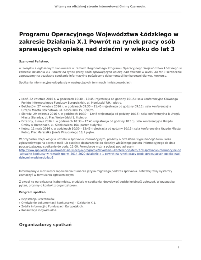 Witamy na oficjalnej stronie internetowej Gminy Czarnocin. Programu Operacyjnego Województwa Łódzkiego w zakresie Działania X.1 Powrót na rynek pracy osób sprawujących opiekę nad dziećmi w wieku do lat 3 Szanowni Państwo, w związku z ogłoszonym konkursem w ramach Regionalnego Programu Operacyjnego Województwa Łódzkiego w zakresie Działania X.1 Powrót na rynek pracy osób sprawujących opiekę nad dziećmi w wieku do lat 3 serdecznie zapraszamy na bezpłatne spotkanie informacyjne poświęcone dokumentacji konkursowej dla ww. konkursu. Spotkania informacyjne odbędą się w następujących terminach i miejscowościach: ● ● ● ● ● Łódź, 22 kwietnia 2016 r. w godzinach 10:30 – 12:45 (rejestracja od godziny 10:15); sala konferencyjna Głównego Punktu Informacyjnego Funduszy Europejskich, ul. Moniuszki 7/9, I piętro, Bełchatów, 27 kwietnia 2016 r. w godzinach 09:30 – 11:45 (rejestracja od godziny 09:15); sala konferencyjna Urzędu Miasta Bełchatowa, ul. Kościuszki 15, I piętro, Sieradz, 29 kwietnia 2016 r. w godzinach 10:30 – 12:45 (rejestracja od godziny 10:15); sala konferencyjna B Urzędu Miasta Sieradza, ul. Plac Wojewódzki 1, II piętro, Brzeziny, 9 maja 2016 r. w godzinach 10:30 – 12:45 (rejestracja od godziny 10:15); sala konferencyjna Urzędu Gminy w Brzezinach, ul. Sienkiewicza 16a, parter budynku, Kutno, 11 maja 2016 r. w godzinach 10:30 – 12:45 (rejestracja od godziny 10:15); sala konferencyjna Urzędu Miasta Kutno, Plac Marszałka Józefa Piłsudskiego 18, I piętro. W przypadku chęci wzięcia udziału w spotkaniu informacyjnym, prosimy o przesłanie wypełnionego formularza zgłoszeniowego na adres e-mail lub osobiste dostarczenie do siedziby właściwego punktu informacyjnego do dnia poprzedzającego spotkanie do godz. 12:00. Formularze można pobrać pod adresem http://www.rpo.lodzkie.pl/dowiedz-sie-wiecej-o-programie/szkolenia-i-konferencje/item/770-spotkanie-informacyjne-pn -aktualne-konkursy-w-ramach-rpo-wl-2014-2020-dzialanie-x-1-powrot-na-rynek-pracy-osob-sprawujacych-opieke-naddziecmi-w-wieku-do-lat-3 Informujemy o możliwości zapewnienia tłumacza języka migowego podczas spotkania. Potrzebę taką wystarczy zaznaczyć w formularzu zgłoszeniowym. Z uwagi na ograniczoną liczbę miejsc, o udziale w spotkaniu, decydować będzie kolejność zgłoszeń. W przypadku pytań, prosimy o kontakt z organizatorem. Program spotkań ● ● ● ● Rejestracja uczestników. Omówienie dokumentacji konkursowej – Działanie X.1. Źródła informacji o Funduszach Europejskich. Konsultacje indywidualne. Organizatorzy spotkań 1 Witamy na oficjalnej stronie internetowej Gminy Czarnocin. Organizator spotkania w Łodzi: GPI w Łodzi 1. Moniuszki 7/9, 90-101 Łódź tel.: 42 663 31 07, 42 663 34 05, 42 291 97 60 e-mail: [email protected] Organizator spotkania w Bełchatowie: LPI w Bełchatowie 1. Kościuszki 17, 97-400 Bełchatów Tel.: 44 633 05 13; 44 633 34 63 e- mail: [email protected] Organizator spotkania w Brzezinach: LPI w Brzezinach 1. Sienkiewicza 16, 95-060 Brzeziny Tel.: 46 874 31 54; 46 816 68 17 e-mail: [email protected] Organizator spotkania w Kutnie: LPI w Łowiczu 1. Świętojańska 1, 99-400 Łowicz Tel.: 46 837 52 67, 46 837 72 29 e- mail: [email protected] Organizator spotkania w Sieradzu: LPI w Sieradzu 2 Witamy na oficjalnej stronie internetowej Gminy Czarnocin. 1. Kościuszki 6 98-200 Sieradz Tel.: 43 678 40 80; 43 822 89 25 e-mail: [email protected] 3