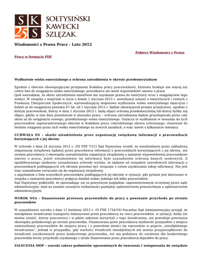 Wiadomości z Prawa Pracy - Lato 2012 Pobierz Wiadomości z Prawa Pracy w formacie PDF Wydłużenie wieku emerytalnego a ochrona zatrudnienia w okresie przedemerytalnym Zgodnie z obecnie obowiązującymi przepisami Kodeksu pracy pracownikowi, któremu brakuje nie więcej niż cztery lata do osiągnięcia wieku emerytalnego, pracodawca nie może wypowiedzieć umowy o pracę (pod warunkiem, że okres zatrudnienia umożliwia mu uzyskanie prawa do emerytury wraz z osiągnięciem tego wieku). W związku z wejściem w życie z dniem 1 stycznia 2013 r. nowelizacji ustawy o emeryturach i rentach z Funduszu Ubezpieczeń Społecznych, wprowadzającej stopniowe wydłużanie wieku emerytalnego mężczyzn i kobiet aż do osiągnięcia poziomu 67 lat, od 1 stycznia 2013 r. będzie obowiązywał przepis przejściowy, zgodnie z którym pracownikom, którzy w dniu 1 stycznia 2013 r. będą objęci ochroną przedemerytalną lub którzy byliby nią objęci, gdyby w tym dniu pozostawali w stosunku pracy – ochrona zatrudnienia będzie przysługiwała przez cały okres aż do osiągnięcia nowego, przedłużonego wieku emerytalnego. Oznacza to wydłużenie w stosunku do tych pracowników zagwarantowanego obecnie w Kodeksie pracy czteroletniego okresu ochronnego, stosownie do terminu osiągania przez nich wieku emerytalnego na nowych zasadach, a więc nawet o kilkanaście miesięcy. UCHWAŁA SN – skutki nieudzielenia przez organizację związkową informacji o pracownikach korzystających z jej obrony W uchwale z dnia 24 stycznia 2012 r. (III PZP 7/11) Sąd Najwyższy orzekł, że nieudzielenie przez zakładową organizację związkową żądanej przez pracodawcę informacji o pracownikach korzystających z jej obrony, nie zwalnia pracodawcy z obowiązku zawiadomienia organizacji związkowej o zamiarze wypowiedzenia pracownikowi umowy o pracę, jeżeli nieudzielenie tej informacji było uzasadnione ochroną danych osobowych. Z opublikowanego niedawno uzasadnienia uchwały wynika, że żądanie od związków zawodowych informacji o pracownikach podlegających ich obronie powinno być związane z celem uzyskiwania takiej informacji. Nie jest więc uzasadnione zwracanie się do organizacji związkowej z zapytaniem o listę wszystkich pracowników podlegających jej obronie w sytuacji, gdy pytanie jest kierowane w związku z zamiarem pracodawcy podjęcia działań wobec jednego lub kilku pracowników. Sąd Najwyższy podkreślił, że opowiadając się za powyższym poglądem, zaprezentowanym wcześniej przez sądy administracyjne, miał na uwadze usunięcie rozbieżności pomiędzy sądownictwem powszechnym a sądownictwem administracyjnym. WYROK NSA – finansowanie przewozu pracowników do pracy a powstanie przychodu po stronie pracowników W uzasadnieniu wyroku z dnia 11 kwietnia 2012 r. (II FSK 1724/10) Naczelny Sąd Administracyjny przyjął, że nieodpłatne świadczenie transportu dokonywane przez pracodawcę na rzecz pracowników, w sytuacji, kiedy nie można ustalić, którzy pracownicy i w jakim zakresie korzystali z tego świadczenia, nie powoduje powstania obowiązku podatkowego po stronie pracownika. Finansowana przez pracodawcę możliwość przejazdów z miejsca zamieszkania pracowników do miejsca pracy i z powrotem mieści się wprawdzie w pojęciu „nieodpłatnego świadczenia”, jednak w przypadku, gdy wartości świadczeń nieodpłatnych nie można przyporządkować do świadczeń uzyskiwanych przez konkretnego pracownika, nie ma podstawy do ustalenia dla konkretnego pracownika kwoty przychodu uzyskanego z tytułu finansowania przez pracodawcę dojazdów do pracy. ZALECENIA MOP – szeroki zakres podmiotów uprawnionych do tworzenia i wstępowania do związków zawodowych W związku ze złożoną w 2011 roku skargą Komisji Krajowej związku zawodowego NSZZ „Solidarność” Komitet Wolności Związkowych Międzynarodowej Organizacji Pracy (MOP) wydał stosowne zalecenia dla państwa polskiego. W zaleceniach zażądano od państwa polskiego, aby, między innymi, zastosowało środki konieczne do tego, by wszystkie osoby zatrudnione, w tym osoby prowadzące indywidualną działalność gospodarczą oraz wykonujące pracę na podstawie umów cywilnoprawnych, mogły korzystać z prawa zakładania i wstępowania do organizacji wskazanych w art. 10 Konwencji MOP Nr 87 (tj. wszelkich organizacji osób zatrudnionych lub pracodawców, mających na celu popieranie i ochronę interesów osób zatrudnionych lub pracodawców). Komitet zwrócił też uwagę na konieczność zapewnienia odpowiedniej ochrony przed wszelkimi aktami dyskryminacji ze względu na przynależność związkową, niezależnie od tego, czy osoba zatrudniona jest pracownikiem w rozumieniu Kodeksu pracy, czy nie. Zalecenia nie mają mocy wiążącej. Z nieoficjalnych informacji uzyskanych w Ministerstwie Pracy i Polityki Społecznej wynika, że podjęto wstępne prace nad nowelizacją art. 2 ustawy o związkach zawodowych, który definiuje osoby uprawnione do tworzenia i wstępowania do związków zawodowych, oraz że na razie prace te dotyczą jedynie osób wykonujących pracę nakładczą. W doktrynie zaprezentowano pogląd, że ze względu na treść obowiązujących w polskim porządku prawnym konwencji MOP osoby prowadzące indywidualną działalność gospodarczą lub wykonujące pracę na podstawie umów cywilnoprawnych mogą wstępować do związków związkowych, a nawet rejestrować własne związki zawodowe. Wymierzanie opłaty dodatkowej płatnikom będącym osobami fizycznymi 31 maja 2012 r. weszła w życie nowelizacja przepisów ustawy o systemie ubezpieczeń społecznych. Zgodnie ze znowelizowanymi przepisami w razie prawomocnego skazania płatnika będącego osobą fizyczną za przestępstwo lub wykroczenie polegające na nieopłaceniu składek lub opłaceniu ich w zaniżonej wysokości ZUS nie będzie już mógł wymierzyć opłaty dodatkowej płatnikowi za ten czyn, a jeżeli taką opłatę już wymierzył, d
