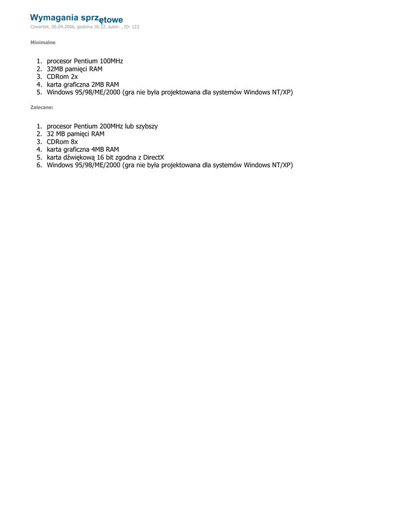 Wymagania sprzętowe Czwartek, 06.04.2006, godzina 16:12, autor: , ID: 123 Minimalne 1. 2. 3. 4. 5. procesor Pentium 100MHz 32MB pamięci RAM CDRom 2x karta graficzna 2MB RAM Windows 95/98/ME/2000 (gra nie była projektowana dla systemów Windows NT/XP) Zalecane: 1. 2. 3. 4. 5. 6. procesor Pentium 200MHz lub szybszy 32 MB pamięci RAM CDRom 8x karta graficzna 4MB RAM karta dźwiękową 16 bit zgodna z DirectX Windows 95/98/ME/2000 (gra nie była projektowana dla systemów Windows NT/XP)