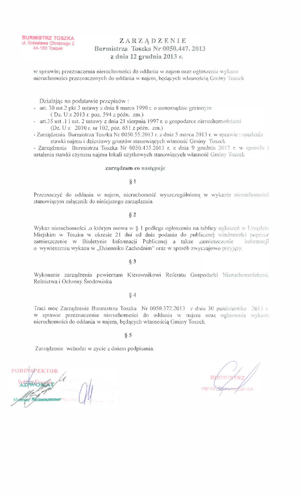 Trac i moe Zarz'ldzenie I3urmistrza Toszka N r 0050 .3 72,2013 '{ dnia 30 paz(l/i cm ib ~ O ll r
