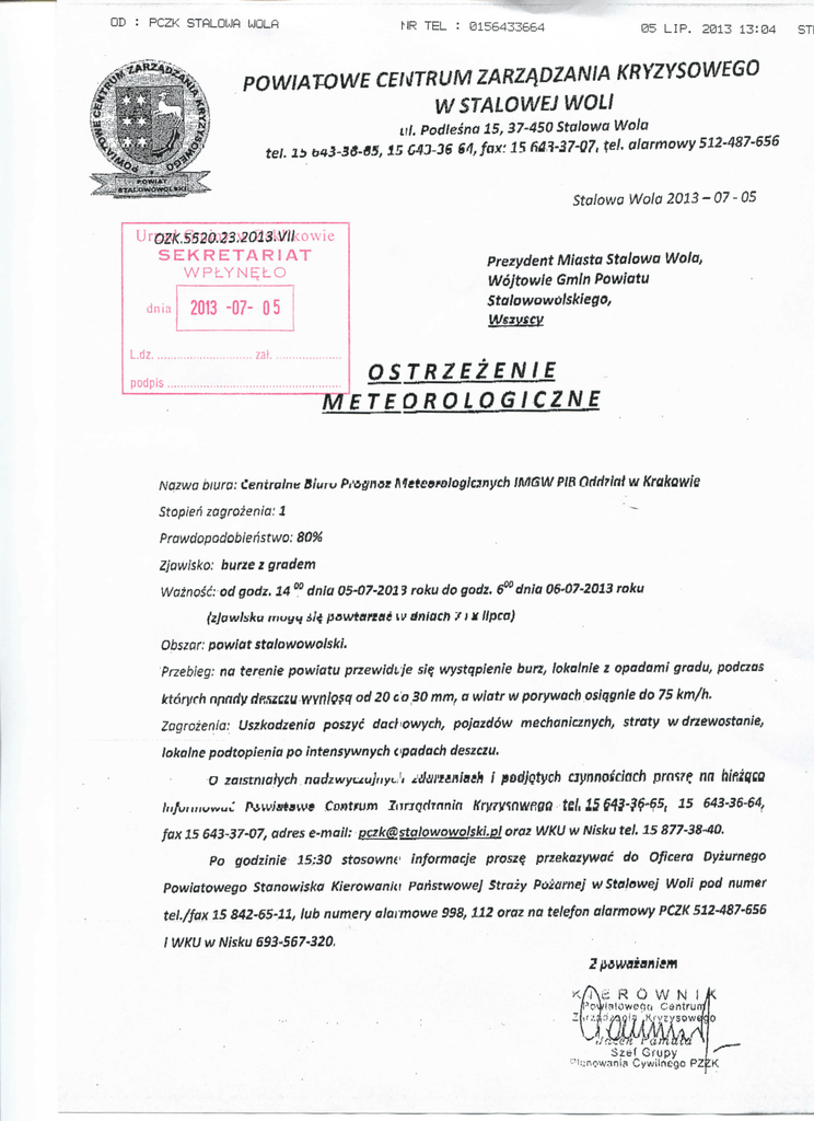 OD : PCZK STPLOUfl UQLfi MR TEL : 0156433664 05 LIP. 2013 13:04 P0\N\fKTO\NE CENTRUM ZARZJ\DZANIA KRYZYSOWEG W STALOWEJ WOLI vl. Podlesna 15,37-450 Stalowa Wola tel. li> bit3-3e-65,15 043-36 64, fax: 15 MH-27-07, Xei alarmowy S12-487-6S6 Stahwa Wola 2013 SEKRETARl AT WPLYN^LO dnia 2013 Prezydent Miasta Stalowa Wola, Wdjtovjie Gmin Powiatu Stalowowolskiego, Wssvicy -07- 05 L.dz. -07-05 73t OSTRZEZENIE podpis Nazwa biura: Centraht; Bfurv Pi'd^noz Meteewloglanych IMGW PIB Oridrlnl w Krakawie Stopieii zagroienia: 1 Prawdopodobienstwo: 80% Zjawisko: burze z gradem Waznosc: od godz. 14 dnla 05-07-2013 roku do godz. 6°° dnia 06^7-2013 roku (zjawlsku muytf ili powianae i v dniach / i u llpca) Obszar: powlat stalowowolskl. Przebieg: na terenie powiatu przewldij'e si^ wystqptenie burz, lokalnie z opadami gradu, podcz ktoryrh npndy dp,siC£U wvnlQ?q od 20 c d 30 mWf a wlatr w porywach psiqgnle do 75 km/h. Zagroienia: Uszkodzenia poszyc dadowych, pojazddw mechanicznych, straty wdrzewostanie, lokalne podtopienia po intensywnych cpadach deszczu. o zaistniaiych nadzwytjcujnyi.'i ^ilmeniash i jiodjQtych aynnoiclach prmri; nn biftiQCQ J P^.wiat8W9 Contrum InriQdTnnin Kryrysnwpga tQh 15 Q^S-^^'^5, 15 643-36-64^ fax 15 643-37-07, adres e-mail: [email protected] oraz WKU w Nisku tel. 15 877-38-^0. Po godzinie 15:30 stosowne informacje prosz^ przekazywac do Oficera Dyiurnego Powiatowego Stanowiska Kierowaniti PaiistwoweJ Strazy Poiarnej wStahwej Woli pod numer tel./fax 15 842-65-11, lub numery alaimowe 998,112 oraz na telefon alarmowy PCZK512-487-6 I WKU w Nisku 693-567-320. 2^&woianism Kfi\c R O W N I yk rpwlniowofjti Cantrum Grupy I Cywilncgo PZIK S2:ef •"•i.'.;now-inici