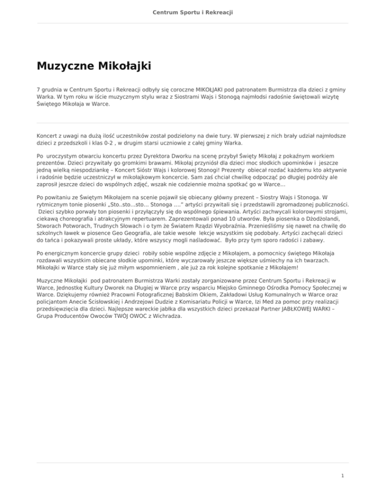Centrum Sportu i Rekreacji Muzyczne Mikołajki 7 grudnia w Centrum Sportu i Rekreacji odbyły się coroczne MIKOŁJAKI pod patronatem Burmistrza dla dzieci z gminy Warka. W tym roku w iście muzycznym stylu wraz z Siostrami Wajs i Stonogą najmłodsi radośnie świętowali wizytę Świętego Mikołaja w Warce. Koncert z uwagi na dużą ilość uczestników został podzielony na dwie tury. W pierwszej z nich brały udział najmłodsze dzieci z przedszkoli i klas 0-2 , w drugim starsi uczniowie z całej gminy Warka. Po uroczystym otwarciu koncertu przez Dyrektora Dworku na scenę przybył Święty Mikołaj z pokaźnym workiem prezentów. Dzieci przywitały go gromkimi brawami. Mikołaj przyniósł dla dzieci moc słodkich upominków i jeszcze jedną wielką niespodziankę – Koncert Sióstr Wajs i kolorowej Stonogi! Prezenty obiecał rozdać każdemu kto aktywnie i radośnie będzie uczestniczył w mikołajkowym koncercie. Sam zaś chciał chwilkę odpocząć po długiej podróży ale zaprosił jeszcze dzieci do wspólnych zdjęć, wszak nie codziennie można spotkać go w Warce… Po powitaniu ze Świętym Mikołajem na scenie pojawił się obiecany główny prezent – Siostry Wajs i Stonoga. W rytmicznym tonie piosenki „Sto..sto…sto… Stonoga ….” artyści przywitali się i przedstawili zgromadzonej publiczności. Dzieci szybko porwały ton piosenki i przyłączyły się do wspólnego śpiewania. Artyści zachwycali kolorowymi strojami, ciekawą choreografia i atrakcyjnym repertuarem. Zaprezentowali ponad 10 utworów. Była piosenka o Dżodżolandi, Stworach Potworach, Trudnych Słowach i o tym że Światem Rządzi Wyobraźnia. Przenieśliśmy się nawet na chwilę do szkolnych ławek w piosence Geo Geografia, ale takie wesołe lekcje wszystkim się podobały. Artyści zachęcali dzieci do tańca i pokazywali proste układy, które wszyscy mogli naśladować. Było przy tym sporo radości i zabawy. Po energicznym koncercie grupy dzieci robiły sobie wspólne zdjęcie z Mikołajem, a pomocnicy świętego Mikołaja rozdawali wszystkim obiecane słodkie upominki, które wyczarowały jeszcze większe uśmiechy na ich twarzach. Mikołajki w Warce stały się już miłym wspomnieniem , ale już za rok kolejne spotkanie z Mikołajem! Muzyczne Mikołajki pod patronatem Burmistrza Warki zostały zorganizowane przez Centrum Sportu i Rekreacji w Warce, Jednostkę Kultury Dworek na Długiej w Warce przy wsparciu Miejsko Gminnego Ośrodka Pomocy Społecznej w Warce. Dziękujemy również Pracowni Fotograficznej Babskim Okiem, Zakładowi Usług Komunalnych w Warce oraz policjantom Anecie Ścisłowskiej i Andrzejowi Dudzie z Komisariatu Policji w Warce, Izi Med za pomoc przy realizacji przedsięwzięcia dla dzieci. Najlepsze wareckie jabłka dla wszystkich dzieci przekazał Partner JABŁKOWEJ WARKI – Grupa Producentów Owoców TWÓJ OWOC z Wichradza. 1