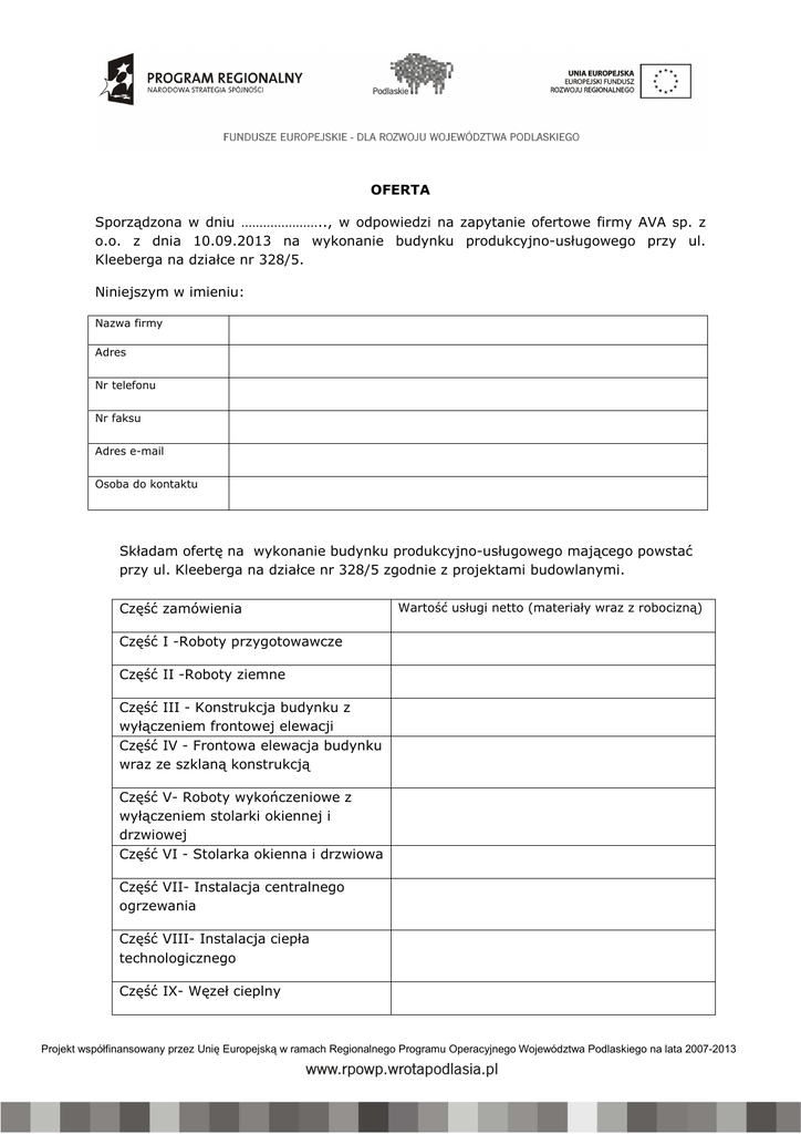 OFERTA Sporządzona w dniu ………………….., w odpowiedzi na zapytanie ofertowe firmy AVA sp. z o.o. z dnia 10.09.2013 na wykonanie budynku produkcyjno-usługowego przy ul. Kleeberga na działce nr 328/5. Niniejszym w imieniu: Nazwa firmy Adres Nr telefonu Nr faksu Adres e-mail Osoba do kontaktu Składam ofertę na wykonanie budynku produkcyjno-usługowego mającego powstać przy ul. Kleeberga na działce nr 328/5 zgodnie z projektami budowlanymi. Część zamówienia Wartość usługi netto (materiały wraz z robocizną) Część I -Roboty przygotowawcze Część II -Roboty ziemne Część III - Konstrukcja budynku z wyłączeniem frontowej elewacji Część IV - Frontowa elewacja budynku wraz ze szklaną konstrukcją Część V- Roboty wykończeniowe z wyłączeniem stolarki okiennej i drzwiowej Część VI - Stolarka okienna i drzwiowa Część VII- Instalacja centralnego ogrzewania Część VIII- Instalacja ciepła technologicznego Część IX- Węzeł cieplny Projekt współfinansowany przez Unię Europejską w ramach Regionalnego Programu Operacyjnego Województwa Podlaskiego na lata 2007-2013 Część X- Instalacja wodno kanalizacyjna Część XI– Zewnętrzne doziemne instalacje sanitarne Część XII– Przyłącze cieplne Część XIII– Instalacja elektryczna Część XIV– Instalacja wentylacji mechanicznej i klimatyzacji Część XV – Instalacja teletechniczna Część XVII– Zasilenie budynku Część XVIII - Zagospodarowanie terenu SUMA Termin realizacji ……………………….. Termin związania oferta wynosi 60 dni. Projekt współfinansowany przez Unię Europejską w ramach Regionalnego Programu Operacyjnego Województwa Podlaskiego na lata 2007-2013