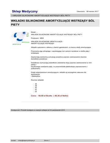 Sklep Medyczny Utworzono : 08 marzec 2017 > WKŁADKI SILIKONOWE AMORTYZUJĄCE WSTRZĄSY BÓL PIETY WKŁADKI SILIKONOWE AMORTYZUJĄCE WSTRZĄSY BÓL PIETY Model : WKŁADKI SILIKONOWE AMORTYZUJĄCE WSTRZĄSY BÓL PIETY Producent : MDH WKŁADKI SILIKONOWE WENTYLUJĄCE� AMORTYZUJĄCE WSTRZĄSY Wkładki wykonane z silikonu o dwóch gęstościach, co tworzy strefy amortyzujące. Przynoszą ulgę odciążając i zapobiegając tym samym naciskowi w strefie pięty i śródstopia. Zapewniają swobodną cyrkulację powietrza poprzez zastosowanie otworów (kanalików powietrza). Dodatkowo wymuszają prawidłowe ustawienie stopy poprzez zastosowanie w nich peloty i korytkowego osadzenia pięty, co przeciwdziała płaskostopiu poprzecznemu i podłużnemu. Dzięki właściwościom amortyzującym, wkładki są szczególnie zalecane dla sportowców i diabetyków. Rozmiar wkładek: � 36 � 38 � 40 � 42 � 44 Cena : 59,00 zł Brutto ( 48,36 zł Netto) Dostępność: Produkt dostępny w naszym sklepie od 22 październik 2010 kontakt : - [email protected] Strona 1