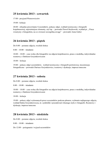 25 kwietnia 2013 - czwartek 17:00 - przyjazd Plenerowiczów 19:00 - kolacja 20:00 - oficjalne przywitanie Uczestników, pokazy zdjęć, wykład teoretyczny z fotografii krajobrazowej, najważniejsze elementy, styl itp. – prowadzi Paweł Strykowski, wykład pt. „ Praca wizażysty z fotografem, na co zwracać szczególną uwagę” – prowadzi Anna Gabor 26 kwietnia 2013 - piątek Do 8:00 – poranne zdjęcia, wschód słońca 8:00 – 10:00 – śniadanie 10:00 – 18:00 – czas wolny dla fotografów na zdjęcia krajobrazowe, praca z modelką, indywidualne rozmowy z Darkiem Grzymkiewiczem 18:00 – kolacja 19:00 – pokazy zdjęć uczestników, wykład teoretyczny z fotografii portretowej, inscenizacja fotograficzna – prowadzi Dariusz Grzymkiewicz, rozmowy i dyskusje, impreza taneczna 27 kwietnia 2013 - sobota Do 8:00 – poranne zdjęcia, wschód słońca 8:00 – 10:00 – śniadanie 10:00 – 18:00 – czas wolny dla fotografów na zdjęcia krajobrazowe, praca z modelką, indywidualne rozmowy z Darkiem Grzymkiewiczem 18:00 – kolacja 19:00 – pokazy zdjęć wykonanych przez uczestników podczas pleneru, wybranie najlepszego zdjęcia, wykład Darka Grzymkiewocza, nt. symboliki i poszukiwań własnego stylu w fotografii. Rozmowy i dyskusje, impreza taneczna 28 kwietnia 2013 - niedziela Do 8:00 – poranne zdjęcia, wschód słońca 8:00 – 10:00 – śniadanie Do 12:00 – pożegnania i wyjazd uczestników