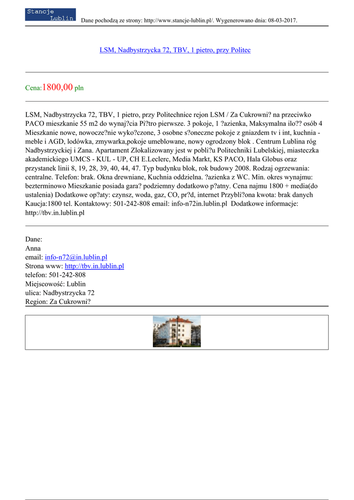 Dane pochodzą ze strony: http://www.stancje-lublin.pl/. Wygenerowano dnia: 08-03-2017. LSM, Nadbystrzycka 72, TBV, 1 pietro, przy Politec Cena:1800,00 pln LSM, Nadbystrzycka 72, TBV, 1 pietro, przy Politechnice rejon LSM / Za Cukrowni? na przeciwko PACO mieszkanie 55 m2 do wynaj?cia Pi?tro pierwsze. 3 pokoje, 1 ?azienka, Maksymalna ilo?? osób 4 Mieszkanie nowe, nowocze?nie wyko?czone, 3 osobne s?oneczne pokoje z gniazdem tv i int, kuchnia meble i AGD, lodówka, zmywarka,pokoje umeblowane, nowy ogrodzony blok . Centrum Lublina róg Nadbystrzyckiej i Zana. Apartament Zlokalizowany jest w pobli?u Politechniki Lubelskiej, miasteczka akademickiego UMCS - KUL - UP, CH E.Leclerc, Media Markt, KS PACO, Hala Globus oraz przystanek linii 8, 19, 28, 39, 40, 44, 47. Typ budynku blok, rok budowy 2008. Rodzaj ogrzewania: centralne. Telefon: brak. Okna drewniane, Kuchnia oddzielna. ?azienka z WC. Min. okres wynajmu: bezterminowo Mieszkanie posiada gara? podziemny dodatkowo p?atny. Cena najmu 1800 + media(do ustalenia) Dodatkowe op?aty: czynsz, woda, gaz, CO, pr?d, internet Przybli?ona kwota: brak danych Kaucja:1800 tel. Kontaktowy: 501-242-808 email: info-n72in.lublin.pl Dodatkowe informacje: http://tbv.in.lublin.pl Dane: Anna email: [email protected] Strona www: http://tbv.in.lublin.pl telefon: 501-242-808 Miejscowość: Lublin ulica: Nadbystrzycka 72 Region: Za Cukrowni?