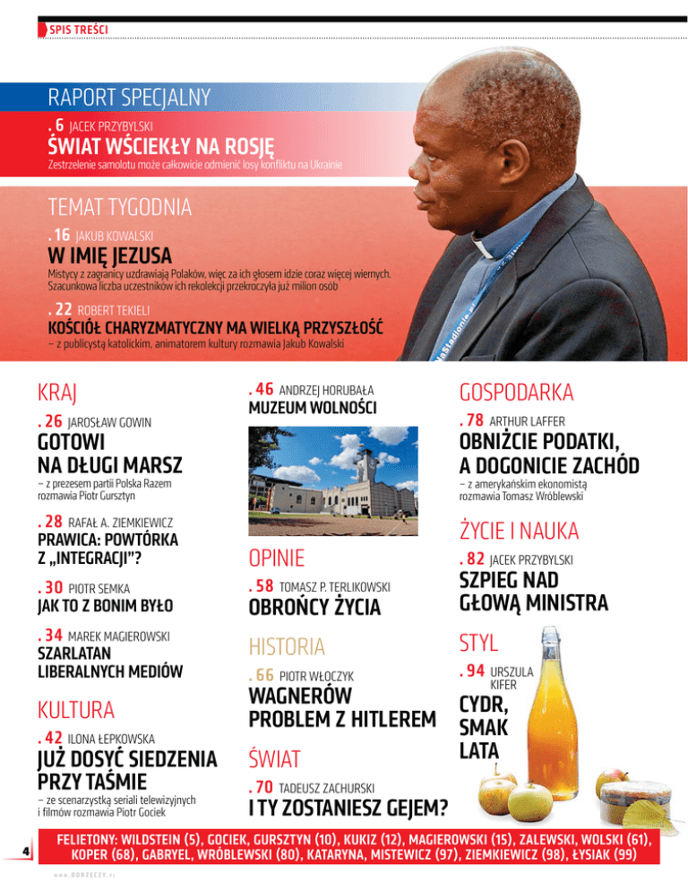 SPIS TREŚCI RAPORT SPECJALNY . 6 JACEK PRZYBYLSKI ŚWIAT WŚCIEKŁY NA ROSJĘ Zestrzelenie samolotu może całkowicie odmienić losy konfliktu na Ukrainie TEMAT TYGODNIA . 16 JAKUB KOWALSKI W IMIĘ JEZUSA Mistycy z zagranicy uzdrawiają Polaków, więc za ich głosem idzie coraz więcej wiernych. Szacunkowa liczba uczestników ich rekolekcji przekroczyła już milion osób . 22 ROBERT TEKIELI KOŚCIÓŁ CHARYZMATYCZNY MA WIELKĄ PRZYSZŁOŚĆ – z publicystą katolickim, animatorem kultury rozmawia Jakub Kowalski KRAJ . 26 JAROSŁAW GOWIN . 46 ANDRZEJ HORUBAŁA MUZEUM WOLNOŚCI – z prezesem partii Polska Razem rozmawia Piotr Gursztyn – z amerykańskim ekonomistą rozmawia Tomasz Wróblewski ŻYCIE I NAUKA OPINIE . 82 JACEK PRZYBYLSKI . 30 PIOTR SEMKA JAK TO Z BONIM BYŁO . 58 TOMASZ P. TERLIKOWSKI OBROŃCY ŻYCIA SZPIEG NAD GŁOWĄ MINISTRA . 34 MAREK MAGIEROWSKI SZARLATAN LIBERALNYCH MEDIÓW HISTORIA STYL KULTURA . 42 ILONA ŁEPKOWSKA JUŻ DOSYĆ SIEDZENIA PRZY TAŚMIE – ze scenarzystką seriali telewizyjnych i filmów rozmawia Piotr Gociek 4 . 78 ARTHUR LAFFER OBNIŻCIE PODATKI, A DOGONICIE ZACHÓD GOTOWI NA DŁUGI MARSZ . 28 RAFAŁ A. ZIEMKIEWICZ PRAWICA: POWTÓRKA Z „INTEGRACJI”? GOSPODARKA . 66 PIOTR WŁOCZYK . 94 URSZULA KIFER WAGNERÓW CYDR, PROBLEM Z HITLEREM SMAK LATA ŚWIAT . 70 TADEUSZ ZACHURSKI I TY ZOSTANIESZ GEJEM? FELIETONY: WILDSTEIN (5), GOCIEK, GURSZTYN (10), KUKIZ (12), MAGIEROWSKI (15), ZALEWSKI, WOLSKI (61), KOPER (68), GABRYEL, WRÓBLEWSKI (80), KATARYNA, MISTEWICZ (97), ZIEMKIEWICZ (98), ŁYSIAK (99) WWW.DORZECZY.PL