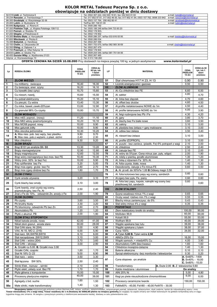 KOLOR METAL Tadeusz Pacyna Sp. z o.o. obowiązuje na oddziałach poniżej w dniu dostawy 92-518 Łódź, ul. Techniczna 6 35-234 Rzeszów, ul. Trembeckiego 7 86-300 Grudziądz, ul. Waryńskiego 32-36 20-469 Lublin, ul. Budowlana 14 85-846 Bydgoszcz, ul. Równa 6 97-300 Piotrków Tryb., ul. Wojska Polskiego 108/112 61-023 Poznań, ul. Średzka 18 67-200 Głogów, ul Południowa 8 43-300 Bielsko Biała, ul. Korczaka34 87-800 Włocławek, ul. Płocka 6 15-399 Białystok, ul. Handlowa 22-100 Chełm, ul. Okszowska 39 82-300 Elbląg, ul. Dębowa 1 a 37-700 Przemyśl, ul. Ofiar Katynia 16 28-835 Lublin, ul. Głuska 71a 66-400 Gorzów Wlkp. ul. Myśliborska 21/23 Gdynia ul. Hryniewieckiego 10 Tel. 0502 307 222, 042 649 18 61, fax: 042 643 01 60 e-mail: [email protected] Tel. 017 852 97 81, 017 852 46 50, fax: 017 852 41 84, 0503 157 762, 0698 333 842 e-mail: [email protected] Tel. 0503 157 764, 056 462 60 41 e-mail: [email protected] Tel/Fax 081 748 91 09 e-mail: [email protected] Tel. 0500 286 192 Tel. 0505 188 248 tel/fax 044 733 60 20 Tel. 0502 178 903, Tel. 0502 178 902 Tel. 0500 286 257, tel/fax 033 816 05 95 e-mail: [email protected] Tel. 0500 286 034 Tel. 0502 267 496 Tel. 0501 753 070, tel/fax 082 565 36 69 e-mail: [email protected] Tel. 0502 267 479 Tel. 0502 178 904 Tel. 0509 254 549, tel/fax 081 751 84 06 Tel. 0502 267 485 Tel. 0 513 146 282 OFERTA CENOWA NA DZIEŃ 10.08.09D Przy dostawach na miejsce powyżej 100 kg. w jednym asortymencie Lp RODZAJ ZŁOMU CENA PRZELEW 14 dni CENA do 60 tyś, lub 1 dzień przelewu LP www.kolormetal.pl MATERIAŁ CENA PRZELEW 14 dni CENA do 60 tyś, lub 1 dzień przelewu I ZŁOM MIEDZI 51 Stal chromowa H17 H 23, H 13 0,90 0,90 1 2 3 Cu millberry, świecąca Cu świecąca, ener. szyny Cu kawałki (bez cyny) 16,40 16,20 15,70 16,30 16,10 15,60 52 VII 53 Liczniki energetyczne i gazowe ZŁOM ALUMINIUM Al.-Cu chłodnice bez FE 0,50 0,50 Cu niesort, nawój, 15,60 15,50 54 Al. sektor 6,60 4,80 6,50 4 5 6 7 Cu pobiał elektryczny Cu piecyki, Cu wióra Cu mika, baweł.,cewki-20%zan 15,20 13,40 13,00 15,10 13,30 12,90 55 56 57 Al. linka bez złączek Al. offset bez drutów Al.profile nielakierowane NOWE do 1m 4,60 4,50 4,40 8 Cu granulat 98% Cu czysty 15,80 15,70 58 Al. profile lakierowane NOWE do 1m 4,70 4,60 4,50 4,00 II 9 10 11 12 13 ZŁOM MOSIĄDZU Mos m63, poprod., (nowy) Mos M63 włosy poamortyzacyjny Mos MO58 poprod. nowy Mos gatunek żółty Mos otoczka jednorodne A. Mos nies. pob. bez węży, bez plastiku B. Mos nies. pob.z wężami, z plast. stchni Mos chłodnice ZŁOM BRĄZU Brąz B101 po analizie B6, B8 Brązy niemagnetyczne Brązy magnetyczne Brąz wióry niemagnetycz bez mos. bez FE Wióry (min. 50% br bez Fe) Pyły szlifierskie bez Fe Brąz mos zgary grube bez Fe Brąz mos zgary drobne bez Fe 59 60 61 62 63 64 Al..felgi rozbrojone bez Pb i Fe Al. gary Al. blachy bez Fe białe nowe Al. cekiny Al. plastyka bez żelaza + gary malowane Al. odlew bez żelaza 4,30 3,80 3,60 3,10 3,10 3,50 4,20 3,70 3,50 3,00 3,00 3,40 65 Al. niesort bez żelaza 3,10 3,00 Al. profile IZOPROFIL Al. puszki - bez zaniecz. (plastik, Fe)-5% potrąceń z wagi Al. chłodnice Al. żaluzje bez FE Al. wióry do 5%zan. Cena minus zan. pyły, wilgoć Al. rolety z pianką, grzałki aluminiowe Al. linka z rdzeniem Fe 30% Al. Al. folia czysta, biała, nowa Dezodoranty, żaluzje z Fe minus FE A. Al. pl.odl. do 30%Fe 1,00 B.Odlewy magn 3,50 3,10 2,10 2,50 2,10 2,00 1,30 1,40 1,40 0,60 3,00 2,00 2,40 2,00 1,90 1,20 1,30 1,30 0,50 14 15 III 16 17 18 19 20 21 22 23 11,20 10,20 10,00 10,00 10,30 9,80 2,40 9,30 11,10 10,10 9,90 9,90 10,20 9,70 2,30 9,20 13,30 12,90 12,60 10,40 10,00 5,20 2,80 1,80 13,20 12,80 12,50 10,30 9,90 5,00 2,70 1,70 66 67 68 69 70 71 72 73 74 75 4,70 3,90 IV ZŁOM CYNKU 76 Al. folia kolorowa bez papy wg oceny, sandwich 0,60 0,60 24 Cynk anoda używana 3,20 3,10 77 Cynk blachy bez smoły 3,10 3,00 78 0,60 0,60 0,60 25 Al.zgary bez pyłu, Fe, piany Al. folia bez papy, kapsle, nakrętki wg oceny bez plastikowej foli, sandwich 27 V 28 29 30 31 32 VI 33 34 35 36 37 38 39 40 41 42 43 44 Cynk twardy, znal czysty-wg oceny, poprodukcyjny, bez Fe, Al Znal z Fe do 10%, odważniki Zn, anody z Fe ZŁOM OŁOWIU Pb czysty Pb brudny tłusty Pb bitumiczny ,odważniki Pb bez Zn Akumulatory Pb Płytki z akumul. PB ZŁOM STALI STOPOWYCH Nikiel katoda anoda, nowa Nikiel złom granul., anoda stara Stal CrNi stara, Ni (304) VA4, Ni 10, MO 2, (316) Stal narz. SK,SW7M,SW18 Stal narzędziowa ,SW12,SW9 Stal CrNi – wióra (304) Stal CrNi – skrzepy A. Grzałki cu 5,00, B. Grzałki mos 3,00 Grzałki CrNi, czajniki Stal Ni 18% Cr 23 Stal narz. - wióry 45 Stal łączona 46 47 48 Silniki Elek., rozrusz. , wirniki Płytki elekt.,układy scal. Bez FE Płyta główna z komputerów 49 50 50a 26 2,50 2,40 VIII ZŁOM STALOWY 2,00 1,90 3,60 3,30 2,80 1,20 2,00 3,50 3,20 2,70 1,20 1,90 42,00 30,00 5,00 6,00 6,10 3,10 3,70 3,00 41,00 29,00 4,90 5,90 6,00 3,00 3,60 2,90 1,80 9,00 3,50 1,70 8,90 3,30 79 80 81 82 IX 83 84 85 86 87 88 89 90 91 92 93 94 95 96 Szyna wsadowa minus 1% z wagi Gruby wsad +żeliwo min.1% z wagi Blachy minus zaniemczysz. do 5% Stal wióry minus 4% z wagi POZOSTAŁE Złom katalizatory środki do analizy Molibden 99,9 Kobalt 99,9 Wolfram 99,9 Węgliki spiekane bez lutu Węgliki spiekane z lutem Cyna 100% A.Tytan 5,00 B. Tytan wióra 2,50 AlNiCo 25% Co Wiązki samoch, + miedz40% Cu Akumulatory CdNi (bez kwasu) Chłodnice mosiężno-żelazne Baterie alkaiczne Sprzęt elektroniczny -bez monitorów i telewizorów 2,50 2,40 2,00 1,70 15,00 98 99 100 Procesory plastyczne miękkie 2,10 1,70 15,00 40,00 39,00 101 Agregaty z lod. suche 1,60 1,50 102 Procesory ceramiczne twarde Małe silniki, małe transformatory 1,40 1,30 103 FeMo60% - 40,00; FeV80 – 40,00 FeW70 – 30,00 SW 50% 97 0,60 0,65 0,55 0,43 0,35 0,65 0,55 0,43 0,35 100,00 60,00 55,00 40,00 39,00 38,00 34,00 90,00 60,00 53,00 39,00 38,00 37,00 32,00 16,00 15,00 4,00 3,90 1,60 1,60 1,40 1,30 0,10 0,10 0.30 0,20 A. Sn60% - 1400 Cyna st