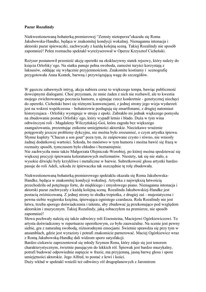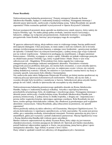 Pazur Rozalindy Niekwestionowaną bohaterką premierowej “Zemsty nietoperza"okazała się Roma Jakubowska-Handke, będąca w znakomitej kondycji wokalnej. Nienaganna intonacja i aktorski pazur śpiewaczki, zachwycały z każdą kolejną sceną. Takiej Rozalindy nie sposób zapomnieć! Pełen rozmachu spektakl wyreżyserował w Operze Krzysztof Cicheński. Reżyser postanowił przenieść akcję operetki na ekskluzywny statek rejsowy, który należy do księcia Orlofsky`ego. Na statku panuje pełna swoboda, zamożni turyści korzystają z luksusów, oddając się wyłącznie przyjemnościom. Znakomite kostiumy i scenografię przygotowała Anna Kontek, barwną i przywiązującą wagę do szczegółów. W gąszczu zabawnych intryg, akcja nabiera coraz to większego tempa, bawiąc publiczność dowcipnymi dialogami. Choć przyznam, że mnie żaden z nich nie rozbawił, ale to kwestia mojego zwichrowanego poczucia humoru, a ujmując rzecz konkretnie - genetycznej niechęci do operetki. Cicheński bawi się różnymi konwencjami, z jednej strony jego wizja wydarzeń jest na wskroś współczesna – bohaterowie posługują się smartfonami, z drugiej natomiast historyzujaca - Orlofsky występuje w stroju z epoki. Zabrakło mi jednak większego pomysłu na zbudowanie postaci Orlofsky`ego, który wypadł letnio i blado. Duża w tym wina odtwórczyni roli - Magdaleny Wilczyńskiej-Goś, która zagrała bez większego zaangażowania, prezentując znikome umiejętności aktorskie. Nieciekawe wrażenie potęgowały jeszcze problemy dykcyjne, nie można było zrozumieć, o czym artystka śpiewa. Słynne kuplety "Chacun a son gout" poza tym, że zaśpiewane czysto i równo, nie wniosły żadnej dodatkowej wartości. Szkoda, bo mnóstwo w tym humoru i można bawić się frazą w rozmaity sposób, tymczasem było chłodno i beznamiętnie. Nie zachwyciła mnie także Małgorzata Olejniczak-Worobiej, po której można spodziewać się większej precyzji śpiewania koloraturowych melizmatów. Niestety, tak się nie stało, a wysokie dźwięki były krzykliwe i metaliczne w barwie. Subretkowość głosu artystki bardzo pasuje do roli Adeli, szkoda że śpiewaczka tak oszczędnie tę rolę zbudowała. Niekwestionowaną bohaterką premierowego spektaklu okazała się Roma JakubowskaHandke, będąca w znakomitej kondycji wokalnej. Artystka z największą łatwością przechodziła od potężnego forte, do miękkiego i zmysłowego piano. Nienaganna intonacja i aktorski pazur zachwycały z każdą kolejną sceną. Rozalinda Jakubowskiej-Handke jest postacią zróżnicowaną. Z jednej strony to słodka trzpiotka, z drugiej zaś - majestatyczna i pewna siebie węgierska księżna, śpiewająca ognistego czardasza. Rola Rozalindy nie jest łatwa, trzeba sporego doświadczenia i talentu, aby zbudować ją przekonująco pod względem aktorskim i muzycznym. Takiej Rozalindy, jaką zobaczyłem na premierze, nie sposób zapomnieć! Słowa pochwały należą się także odtwórcy roli Eisensteina, Maciejowi Ogórkiewiczowi. To artysta doświadczony w repertuarze operetkowym, co było zauważalne. Na scenie jest pewny siebie, gra z naturalną swobodą, różnorodnymi emocjami. Świetnie sprawdza się przy tym w ansamblach, gdzie jest wyrazisty i potrafi znakomicie parnerować. Maciej Ogórkiewicz wraz z Romą Jakubowską-Handkę dali widzom sporo satysfakcji. Bardzo ciekawie zaprezentował się młody Szymon Rona, który zdaje się jest tenorem charakterystycznym, świetnie pasującym do lekkich ról. Śpiewak jest bardzo muzykalny, potrafi budować odpowiednie napięcie w frazie, ma przyjemną, jasną barwę głosu i spore umiejętności aktorskie. Jego Alfred, to postać z krwi i kości. Duży wkład w spektakl wnieśli też odtwórcy ról drugoplanowych z Jaromirem Trafankowskim na czele, a obok niego - Karolem Bocheńskim i Rafałem Korpikiem. Panowie stworzyli ciekawe, skrzące się dowcipem role. Jak zwykle, świetnie wypadli chórzyści. Bardzo dobrze brzmiała orkiestra pod batutą Michała Klauzy, grała subtelnie i pięknym dźwiękiem. Autor: Adam Olaf Gibowski Teatr Wielki w Poznaniu, “Zemsta nietoperza” Johanna Straussa (syna), reż. Krzysztof Cicheński. Premiera 30 grudnia 2016 roku. Najbliższe spektakle: 3, 4 i 5 stycznia 2017 o godz. 19