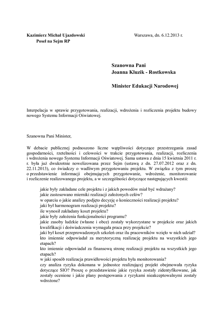 Kazimierz Michał Ujazdowski Poseł na Sejm RP Warszawa, dn. 6.12.2013 r. Szanowna Pani Joanna Kluzik - Rostkowska Minister Edukacji Narodowej Interpelacja w sprawie przygotowania, realizacji, wdrożenia i rozliczenia projektu budowy nowego Systemu Informacji Oświatowej. Szanowna Pani Minister, W debacie publicznej podnoszono liczne wątpliwości dotyczące przestrzegania zasad gospodarności, rzetelności i celowości w trakcie przygotowania, realizacji, rozliczenia i wdrożenia nowego Systemu Informacji Oświatowej. Sama ustawa z dnia 15 kwietnia 2011 r. r. była już dwukrotnie nowelizowana przez Sejm (ustawą z dn. 27.07.2012 oraz z dn. 22.11.2013), co świadczy o wadliwym przygotowaniu projektu. W związku z tym proszę o przedstawienie informacji obejmujących przygotowanie, wdrożenie, monitorowanie i rozliczenie realizowanego projektu, a w szczególności dotyczące następujących kwestii: jakie były zakładane cele projektu i z jakich powodów miał być wdrażany? jakie zastosowano mierniki realizacji założonych celów? w oparciu o jakie analizy podjęto decyzję o konieczności realizacji projektu? jaki był harmonogram realizacji projektu? ile wynosił zakładany koszt projektu? jakie były założenia funkcjonalności programu? jakie zasoby ludzkie (własne i obce) zostały wykorzystane w projekcie oraz jakich kwalifikacji i doświadczenia wymagała praca przy projekcie? jaki był koszt przeprowadzonych szkoleń oraz ilu pracowników wzięło w nich udział? kto imiennie odpowiadał za merytoryczną realizację projektu na wszystkich jego etapach? kto imiennie odpowiadał za finansową stronę realizacji projektu na wszystkich jego etapach? w jaki sposób realizacja prawidłowości projektu była monitorowania? czy analiza ryzyka dokonana w jednostce realizującej projekt obejmowała ryzyka dotyczące SIO? Proszę o przedstawienie jakie ryzyka zostały zidentyfikowane, jak zostały ocenione i jakie plany postępowania z ryzykami nieakceptowalnymi zostały wdrożone? czy w trakcie realizacji projektu były zgłaszane przez realizujących (pracowników i wykonawców) projekt uwagi lub informacje dotyczące nieprawidłowości czy opóźnień? Kto je zgłaszał i jaka była reakcja kierownika projektu? czy w trakcie realizacji projektu były dokonywane zmiany dotyczące harmonogramu, kosztów i funkcjonalności programu? Jeżeli tak to na czyj wniosek? Kto podjął decyzje i w jakim zakresie? czy projekt został ukończony zgodnie z harmonogramem? Jeżeli nie to dlaczego? czy projekt został zrealizowany w ramach zaplanowanych środków? Jeżeli nie to w jakim zakresie? czy wszystkie założone cele zostały zrealizowane? Jeżeli nie to których nie udało się zrealizować i dlaczego? czy wszystkie funkcjonalności zostały wdrożone? Jeżeli nie to jakie i dlaczego? czy projekt został finalnie rozliczony? Jeżeli tak, to kto podpisał się pod rozliczeniem ze strony jednostki realizującej projekt? Kto w MEN przyjął rozliczenie projektu? kiedy program osiągnie pełną funkcjonalność i w jaki sposób prace to umożliwiające będą finansowane? kiedy wszyscy planowani użytkownicy programu będą mogli z niego korzystać? czy prawdziwe są informacje o możliwości kolejnego przesunięcia terminu wykorzystania programu do naliczania subwencji oświatowej? Z poważaniem /-/ Kazimierz Michał Ujazdowski