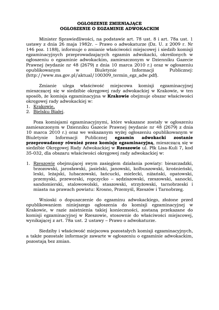 OGŁOSZENIE ZMIENIAJĄCE OGŁOSZENIE O EGZAMINIE ADWOKACKIM Minister Sprawiedliwości, na podstawie art. 78 ust. 8 i art. 78a ust. 1 ustawy z dnia 26 maja 1982r. – Prawo o adwokaturze (Dz. U. z 2009 r. Nr 146 poz. 1188), informuje o zmianie właściwości miejscowej i siedzib komisji egzaminacyjnych przeprowadzających egzamin adwokacki, określonych w ogłoszeniu o egzaminie adwokackim, zamieszczonym w Dzienniku Gazecie Prawnej (wydanie nr 48 (2679) z dnia 10 marca 2010 r.) oraz w ogłoszeniu opublikowanym w Biuletynie Informacji Publicznej: (http://www.ms.gov.pl/aktual/100309_termin_egz_adw.pdf). Zmianie ulega właściwość miejscowa komisji egzaminacyjnej mieszczącej się w siedzibie okręgowej rady adwokackiej w Krakowie, w ten sposób, Ŝe komisja egzaminacyjna w Krakowie obejmuje obszar właściwości okręgowej rady adwokackiej w: 1. Krakowie, 2. Bielsku Białej. Poza komisjami egzaminacyjnymi, które wskazane zostały w ogłoszeniu zamieszczonym w Dzienniku Gazecie Prawnej (wydanie nr 48 (2679) z dnia 10 marca 2010 r.) oraz we wskazanym wyŜej ogłoszeniu opublikowanym w Biuletynie Informacji Publicznej egzamin adwokacki zostanie przeprowadzony równieŜ przez komisję egzaminacyjną, mieszczącą się w siedzibie Okręgowej Rady Adwokackiej w Rzeszowie ul. Płk Lisa-Kuli 7, kod 35-032, dla obszaru właściwości okręgowej rady adwokackiej w: 1. Rzeszowie obejmującej swym zasięgiem działania powiaty: bieszczadzki, brzozowski, jarosławski, jasielski, janowski, kolbuszowski, krośnieński, leski, leŜajski, lubaczowski, łańcucki, mielecki, niŜański, opatowski, przemyski, przeworski, ropczycko – sędziszowski, rzeszowski, sanocki, sandomierski, stalowowolski, staszowski, strzyŜowski, tarnobrzeski i miasta na prawach powiatu: Krosno, Przemyśl, Rzeszów i Tarnobrzeg. Wnioski o dopuszczenie do egzaminu adwokackiego, złoŜone przed opublikowaniem niniejszego ogłoszenia do komisji egzaminacyjnej w Krakowie, w razie zaistnienia takiej konieczności, zostaną przekazane do komisji egzaminacyjnej w Rzeszowie, stosownie do właściwości miejscowej, wynikającej z art. 78a ust. 2 ustawy – Prawo o adwokaturze. Siedziby i właściwość miejscowa pozostałych komisji egzaminacyjnych, a takŜe pozostałe informacje zawarte w ogłoszeniu o egzaminie adwokackim, pozostają bez zmian.