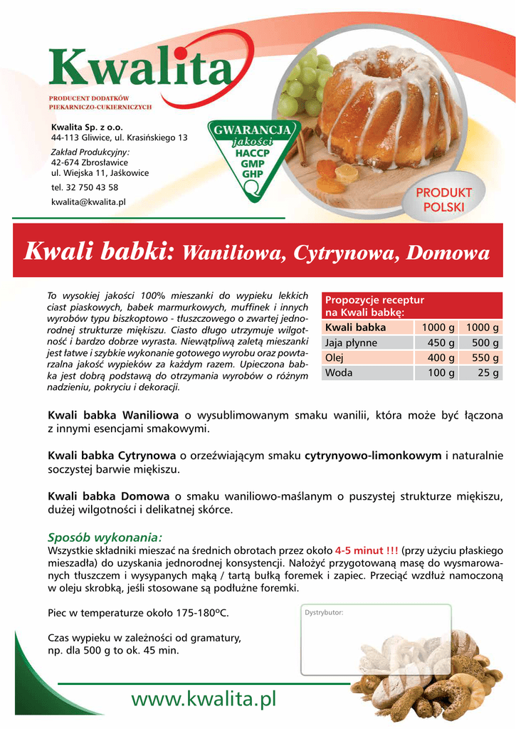 Kwalita Sp. z o.o. 44-113 Gliwice, ul. Krasińskiego 13 Zakład Produkcyjny: 42-674 Zbrosławice ul. Wiejska 11, Jaśkowice tel. 32 750 43 58 [email protected] Kwali babki: Waniliowa, Cytrynowa, Domowa To wysokiej jakości 100% mieszanki do wypieku lekkich ciast piaskowych, babek marmurkowych, muffinek i innych wyrobów typu biszkoptowo - tłuszczowego o zwartej jednorodnej strukturze miękiszu. Ciasto długo utrzymuje wilgotność i bardzo dobrze wyrasta. Niewątpliwą zaletą mieszanki jest łatwe i szybkie wykonanie gotowego wyrobu oraz powtarzalna jakość wypieków za każdym razem. Upieczona babka jest dobrą podstawą do otrzymania wyrobów o różnym nadzieniu, pokryciu i dekoracji. Propozycje receptur na Kwali babkę: 1000 g Kwali babka Jaja płynne 450 g Olej 400 g Woda 100 g 1000 g 500 g 550 g 25 g Kwali babka Waniliowa o wysublimowanym smaku wanilii, która może być łączona z innymi esencjami smakowymi. Kwali babka Cytrynowa o orzeźwiającym smaku cytrynyowo-limonkowym i naturalnie soczystej barwie miękiszu. Kwali babka Domowa o smaku waniliowo-maślanym o puszystej strukturze miękiszu, dużej wilgotności i delikatnej skórce. Sposób wykonania: Wszystkie składniki mieszać na średnich obrotach przez około 4-5 minut !!! (przy użyciu płaskiego mieszadła) do uzyskania jednorodnej konsystencji. Nałożyć przygotowaną masę do wysmarowanych tłuszczem i wysypanych mąką / tartą bułką foremek i zapiec. Przeciąć wzdłuż namoczoną w oleju skrobką, jeśli stosowane są podłużne foremki. Piec w temperaturze około 175-180ºC. Czas wypieku w zależności od gramatury, np. dla 500 g to ok. 45 min. www.kwalita.pl Dystrybutor: