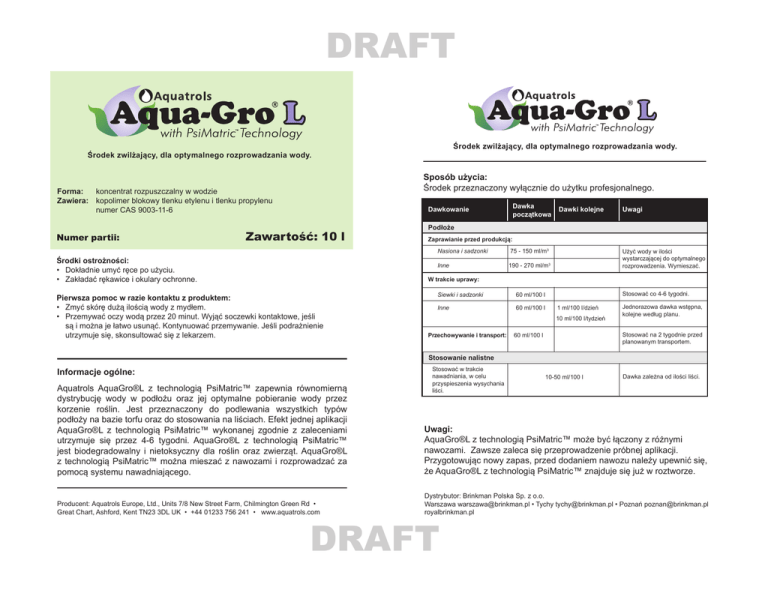 DRAFT Środek zwilżający, dla optymalnego rozprowadzania wody. Środek zwilżający, dla optymalnego rozprowadzania wody. Sposób użycia: Środek przeznaczony wyłącznie do użytku profesjonalnego. Forma: koncentrat rozpuszczalny w wodzie Zawiera: kopolimer blokowy tlenku etylenu i tlenku propylenu numer CAS 9003-11-6 Numer partii: Dawka początkowa Dawkowanie Zawartość: 10 l Środki ostrożności: • Dokładnie umyć ręce po użyciu. • Zakładać rękawice i okulary ochronne. Dawki kolejne Uwagi Podłoże Zaprawianie przed produkcją: Nasiona i sadzonki 75 - 150 ml/m3 Inne 190 - 270 ml/m Użyć wody w ilości wystarczającej do optymalnego rozprowadzenia. Wymieszać. 3 W trakcie uprawy: Pierwsza pomoc w razie kontaktu z produktem: • Zmyć skórę dużą ilością wody z mydłem. • Przemywać oczy wodą przez 20 minut. Wyjąć soczewki kontaktowe, jeśli są i można je łatwo usunąć. Kontynuować przemywanie. Jeśli podrażnienie utrzymuje się, skonsultować się z lekarzem. Siewki i sadzonki 60 ml/100 l Inne 60 ml/100 l Stosować co 4-6 tygodni. 1 ml/100 l/dzień 10 ml/100 l/tydzień Przechowywanie i transport: Jednorazowa dawka wstępna, kolejne według planu. Stosować na 2 tygodnie przed planowanym transportem. 60 ml/100 l Stosowanie nalistne Informacje ogólne: Stosować w trakcie nawadniania, w celu przyspieszenia wysychania liści. 10-50 ml/100 l Dawka zależna od ilości liści. Aquatrols AquaGro®L z technologią PsiMatric™ zapewnia równomierną dystrybucję wody w podłożu oraz jej optymalne pobieranie wody przez korzenie roślin. Jest przeznaczony do podlewania wszystkich typów podłoży na bazie torfu oraz do stosowania na liściach. Efekt jednej aplikacji AquaGro®L z technologią PsiMatric™ wykonanej zgodnie z zaleceniami utrzymuje się przez 4-6 tygodni. AquaGro®L z technologią PsiMatric™ jest biodegradowalny i nietoksyczny dla roślin oraz zwierząt. AquaGro®L z technologią PsiMatric™ można mieszać z nawozami i rozprowadzać za pomocą systemu nawadniającego. Uwagi: AquaGro®L z technologią PsiMatric™ może być łączony z różnymi nawozami. Zawsze zaleca się przeprowadzenie próbnej aplikacji. Przygotowując nowy zapas, przed dodaniem nawozu należy upewnić się, że AquaGro®L z technologią PsiMatric™ znajduje się już w roztworze. Producent: Aquatrols Europe, Ltd., Units 7/8 New Street Farm, Chilmington Green Rd • Great Chart, Ashford, Kent TN23 3DL UK • +44 01233 756 241 • www.aquatrols.com Dystrybutor: Brinkman Polska Sp. z o.o. Warszawa [email protected] • Tychy [email protected] • Poznań [email protected] royalbrinkman.pl DRAFT