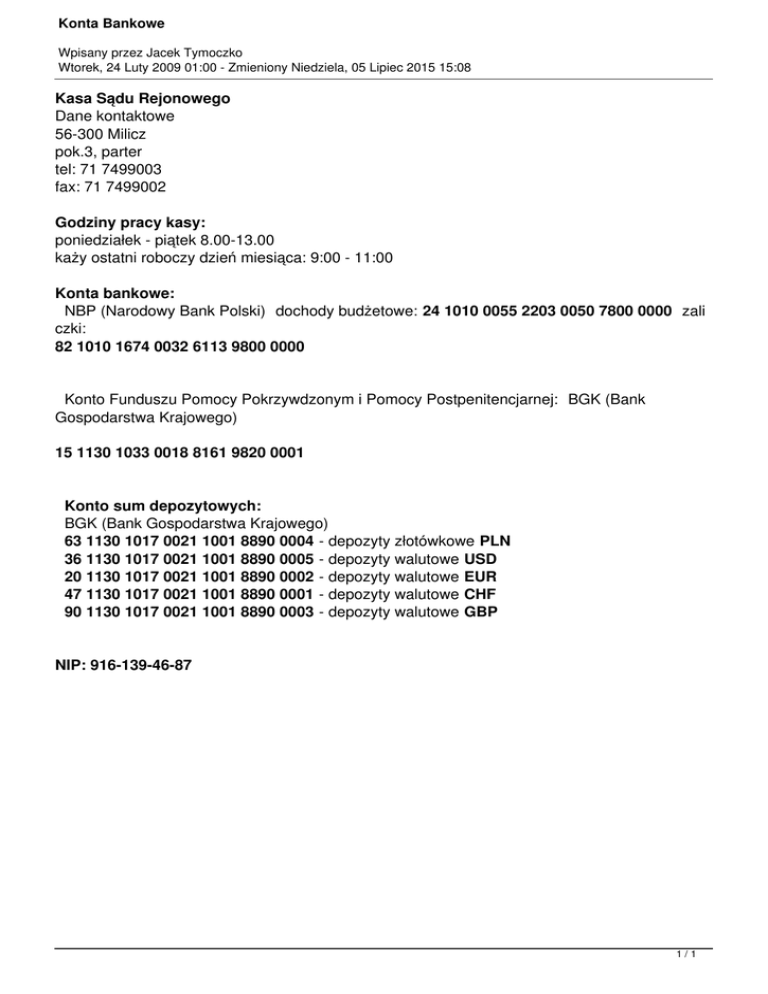 Konta Bankowe Wpisany przez Jacek Tymoczko Wtorek, 24 Luty 2009 01:00 - Zmieniony Niedziela, 05 Lipiec 2015 15:08 Kasa Sądu Rejonowego Dane kontaktowe 56-300 Milicz pok.3, parter tel: 71 7499003 fax: 71 7499002 Godziny pracy kasy: poniedziałek - piątek 8.00-13.00 każy ostatni roboczy dzień miesiąca: 9:00 - 11:00 Konta bankowe: NBP (Narodowy Bank Polski) dochody budżetowe: 24 1010 0055 2203 0050 7800 0000 zali czki: 82 1010 1674 0032 6113 9800 0000 Konto Funduszu Pomocy Pokrzywdzonym i Pomocy Postpenitencjarnej: BGK (Bank Gospodarstwa Krajowego) 15 1130 1033 0018 8161 9820 0001 Konto sum depozytowych: BGK (Bank Gospodarstwa Krajowego) 63 1130 1017 0021 1001 8890 0004 - depozyty złotówkowe PLN 36 1130 1017 0021 1001 8890 0005 - depozyty walutowe USD 20 1130 1017 0021 1001 8890 0002 - depozyty walutowe EUR 47 1130 1017 0021 1001 8890 0001 - depozyty walutowe CHF 90 1130 1017 0021 1001 8890 0003 - depozyty walutowe GBP NIP: 916-139-46-87 1/1