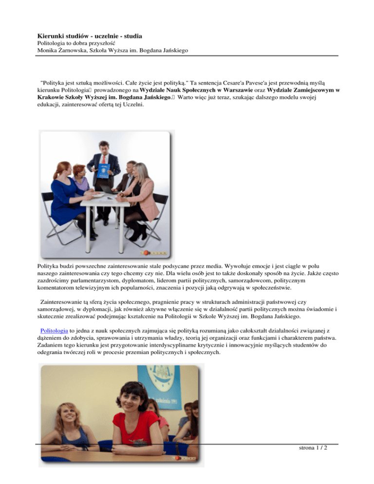 Kierunki studiów - uczelnie - studia Politologia to dobra przyszłość Monika Żarnowska, Szkoła Wyższa im. Bogdana Jańskiego "Polityka jest sztuką możliwości. Całe życie jest polityką." Ta sentencja Cesare'a Pavese'a jest przewodnią myślą kierunku Politologia prowadzonego na Wydziale Nauk Społecznych w Warszawie oraz Wydziale Zamiejscowym w Krakowie Szkoły Wyższej im. Bogdana Jańskiego. Warto więc już teraz, szukając dalszego modelu swojej edukacji, zainteresować ofertą tej Uczelni. Polityka budzi powszechne zainteresowanie stale podsycane przez media. Wywołuje emocje i jest ciągle w polu naszego zainteresowania czy tego chcemy czy nie. Dla wielu osób jest to także doskonały sposób na życie. Jakże często zazdrościmy parlamentarzystom, dyplomatom, liderom partii politycznych, samorządowcom, politycznym komentatorom telewizyjnym ich popularności, znaczenia i pozycji jaką odgrywają w społeczeństwie. Zainteresowanie tą sferą życia społecznego, pragnienie pracy w strukturach administracji państwowej czy samorządowej, w dyplomacji, jak również aktywne włączenie się w działalność partii politycznych można świadomie i skutecznie zrealizować podejmując kształcenie na Politologii w Szkole Wyższej im. Bogdana Jańskiego. Politologia to jedna z nauk społecznych zajmująca się polityką rozumianą jako całokształt działalności związanej z dążeniem do zdobycia, sprawowania i utrzymania władzy, teorią jej organizacji oraz funkcjami i charakterem państwa. Zadaniem tego kierunku jest przygotowanie interdyscyplinarne krytycznie i innowacyjnie myślących studentów do odegrania twórczej roli w procesie przemian politycznych i społecznych. strona 1 / 2 Kierunki studiów - uczelnie - studia Politologia to dobra przyszłość Monika Żarnowska, Szkoła Wyższa im. Bogdana Jańskiego Głównym celem studiów politologicznych w Szkole Wyższej im. Bogdana Jańskiego jest wykształcenie specjalistów posiadających odpowiednią wiedzę i umiejętności z zakresu zagadnień prawnych, ustrojowych, stosunków międzynarodowych i integracji europejskiej, a także socjologii i marketingu politycznego. W trakcie studiów na kierunku Politologia studenci zdobędą umiejętności praktyczne związane z przyszłą pracą zawodową w administracji państwowej, organach samorządowych, organizacjach gospodarczych i społecznych oraz instytucjach organizacjach międzynarodowych. Absolwent Politologii będzie posiadał umiejętności diagnozowania problemów politycznych i społecznych, kierowania organami administracji publicznej i samorządowej, a także umiejętność kreowania wizerunku organizacji, prowadzenia kampanii wyborczych, zarządzania w instytucjach międzynarodowych, analizowania i podejmowania decyzji politycznych, zbierania i hierarchizowania informacji, dokonywania samodzielnej, pogłębionej i naukowo uargumentowanej analizy zjawisk oraz procesów zachodzących w życiu publicznym. Będzie więc profesjonalnym politykiem, który będzie mógł zmieniać na lepsze struktury państwa, świadomie dokonywać ich przemian, a także krytycznie a równocześnie konstruktywnie podchodzić do politycznej rzeczywistość. Jeśli więc chcecie mieć wpływ na otaczający was świat, jeśli pragniecie aktywnie włączyć się w budowanie polityki naszego kraju oraz Unii Europejskiej zgodnego z waszymi wyobrażeniami, a równocześnie jesteście pełni inwencji, niepokorni, o szerokich zainteresowaniach społecznych to nie przegapcie tej wyjątkowej oferty i wybierzcie studia na Politologii w Szkole Wyższej im. Bogdana Jańskiego na Wydziałach Nauk Społecznych w Warszawie oraz w Wydziale Zamiejscowym w Krakowie. strona 2 / 2