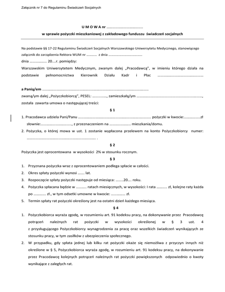 Załącznik nr 7 do Regulaminu Świadczeń Socjalnych U M O W A nr ……………………………….. w sprawie pożyczki mieszkaniowej z zakładowego funduszu świadczeń socjalnych Na podstawie §§ 17-22 Regulaminu Świadczeń Socjalnych Warszawskiego Uniwersytetu Medycznego, stanowiącego załącznik do zarządzenia Rektora WUM nr ………… z dnia ………………………………… dnia ……………… 20.…r. pomiędzy: Warszawskim Uniwersytetem Medycznym, zwanym dalej „Pracodawcą”, w imieniu którego działa na podstawie pełnomocnictwa Kierownik Działu Kadr i Płac ………………………………………… a Panią/em ………………………………………………………………………………………….…….. zwaną/ym dalej „Pożyczkobiorcą”, PESEL: ……………, zamieszkałą/ym ………………......................................………, została zawarta umowa o następującej treści: §1 1. Pracodawca udziela Pani/Panu ……………………………………………………….….…….. pożyczki w kwocie:……………..zł słownie:………………………….., z przeznaczeniem na ………..……….. mieszkania/domu. 2. Pożyczka, o której mowa w ust. 1 zostanie wypłacona przelewem na konto Pożyczkobiorcy numer: ………………………………………………………..……. . §2 Pożyczka jest oprocentowana w wysokości 2% w stosunku rocznym. §3 1. Przyznana pożyczka wraz z oprocentowaniem podlega spłacie w całości. 2. Okres spłaty pożyczki wynosi ……. lat. 3. Rozpoczęcie spłaty pożyczki następuje od miesiąca: ……..20…. roku. 4. Pożyczka spłacana będzie w ……….. ratach miesięcznych, w wysokości: I rata ……….. zł, kolejne raty każda po …………. zł., w tym odsetki umowne w kwocie: …………… zł. 5. Termin spłaty rat pożyczki określony jest na ostatni dzień każdego miesiąca. §4 1. Pożyczkobiorca wyraża zgodę, w rozumieniu art. 91 kodeksu pracy, na dokonywanie przez Pracodawcę potrąceń należnych rat pożyczki w wysokości określonej w § 3 ust. 4 z przysługującego Pożyczkobiorcy wynagrodzenia za pracę oraz wszelkich świadczeń wynikających ze stosunku pracy, w tym zasiłków z ubezpieczenia społecznego. 2. W przypadku, gdy spłata jednej lub kilku rat pożyczki okaże się niemożliwa z przyczyn innych niż określone w § 5, Pożyczkobiorca wyraża zgodę, w rozumieniu art. 91 kodeksu pracy, na dokonywanie przez Pracodawcę kolejnych potrąceń należnych rat pożyczki powiększonych odpowiednio o kwoty wynikające z zaległych rat. 3. W każdym przypadku łączna wartość potrąceń dokonywanych przez Pracodawcę w danym miesiącu odpowiadać będzie wartościom dopuszczalnym przepisami prawa. 4. Podwyższenie wartości potrąceń określonych w § 3 ust. 4, spowodowane okolicznościami o których mowa ust. 2 nie wymaga aneksu do umowy, a Pożyczkobiorca akceptuje taki sposób zapłaty zaległych rat pożyczki. §5 Kwota nie spłaconej pożyczki staje się natychmiast wymagalna w razie: 1) rozwiązania stosunku pracy z Pożyczkobiorcą z powodów określonych w art. 52 KP, 2) rozwiązania stosunku pracy przez Pożyczkobiorcę, w tym w trybie porozumienia stron z inicjatywy Pożyczkobiorcy. §6 1. W przypadku rozwiązania stosunku pracy pomiędzy Pożyczkobiorcą i Pracodawcą z przyczyn innych niż określone w §5, Pożyczkobiorca zobowiązuje się spłacać raty pożyczki na właściwy rachunek Pracodawcy w terminach i kwotach określonych w §3 ust. 4 i ust. 5. 2. Pracodawca może odstąpić od niniejszej umowy stawiając niespłaconą kwotę pożyczki w stan natychmiastowej wymagalności w przypadku nie wpłacenia przez Pożyczkobiorcę, który nie jest już pracownikiem Pracodawcy, trzech kolejnych rat pożyczki w terminie określonym w § 3 ust. 5 niniejszej umowy. §7 1. Pożyczkobiorca zobowiązany jest do wskazania Poręczycieli pożyczki, o których mowa w § 18 ust. 4 Regulaminu świadczeń socjalnych WUM. 2. W przypadku wygaśnięcia lub rozwiązania stosunku pracy z Poręczycielem w okresie trwania spłaty pożyczki, Pożyczkobiorca jest zobowiązany do przedstawienia nowego Poręczyciela. §8 W sprawach nie uregulowanych niniejszą umową mają zastosowanie przepisy ustawy z dnia 4 marca 1994 roku o zakładowym funduszu świadczeń socjalnych (Dz. U. 1996r. nr 70 poz. 335 z późn. zm.) oraz postanowienia Regulaminu świadczeń socjalnych WUM. §9 Niniejsza umowa została sporządzona w trzech jednobrzmiących egzemplarzach, z których dwa otrzymuje Pracodawca, a trzeci Pożyczkobiorca. Oświadczenie poręczycieli pożyczki: 1. Pani/Pan ……………………………………………………, PESEL ………………………………, zamieszkała/y ……………………………………………………………………………………………………………………………..…………, nr dowodu osobistego …………………………….…………….. 2. Pani/Pan ……………………………………………………, PESEL ………………………………, zamieszkała/y …………………………………………………………………………………………………………………………………………, nr dowodu osobistego ……………………….………………….. 3. Pani/Pan ……………………………………………………, PESEL ………………………………, zamieszkała/y …………………………………………………………………………………………………………………………………………, nr dowodu osobistego ……………………….………………….. Oświadczam, że w przypadku nie spłacania we właściwym terminie pożyczki zaciągniętej przez Panią/Pana …………………………………………………………………….. na podstawie ninie