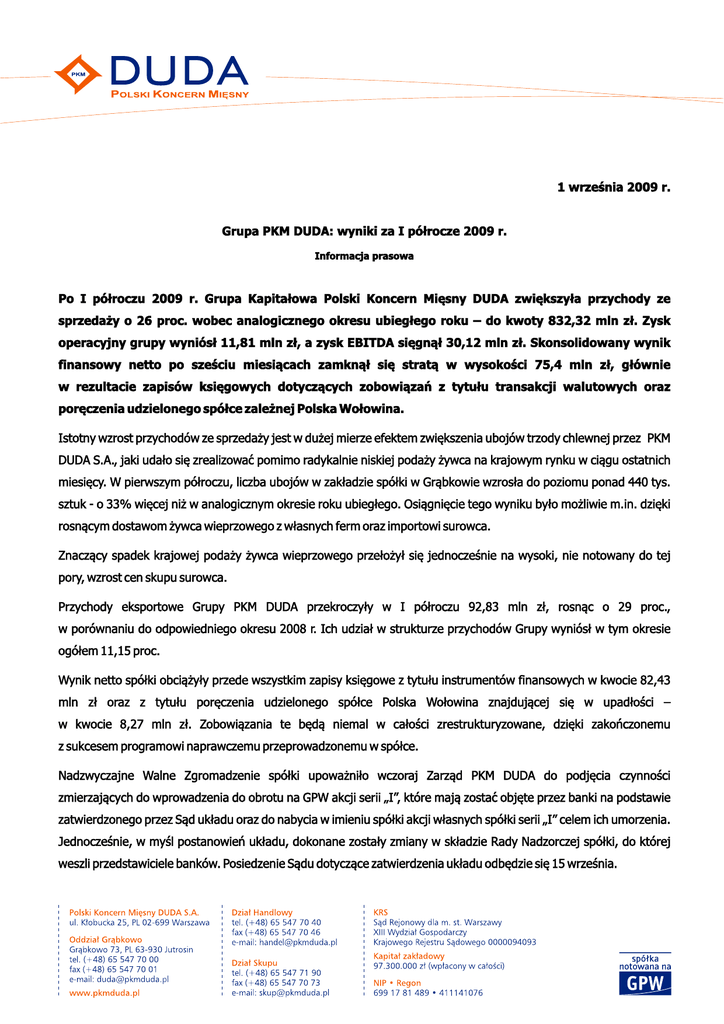 1 września 2009 r. Grupa PKM DUDA: wyniki za I półrocze 2009 r. Informacja prasowa Po I półroczu 2009 r. Grupa Kapitałowa Polski Koncern Mięsny DUDA zwiększyła przychody ze sprzedaży o 26 proc. wobec analogicznego okresu ubiegłego roku – do kwoty 832,32 mln zł. Zysk operacyjny grupy wyniósł 11,81 mln zł, a zysk EBITDA sięgnął 30,12 mln zł. Skonsolidowany wynik finansowy netto po sześciu miesiącach zamknął się stratą w wysokości 75,4 mln zł, głównie w rezultacie zapisów księgowych dotyczących zobowiązań z tytułu transakcji walutowych oraz poręczenia udzielonego spółce zależnej Polska Wołowina. Istotny wzrost przychodów ze sprzedaży jest w dużej mierze efektem zwiększenia ubojów trzody chlewnej przez PKM DUDA S.A., jaki udało się zrealizować pomimo radykalnie niskiej podaży żywca na krajowym rynku w ciągu ostatnich miesięcy. W pierwszym półroczu, liczba ubojów w zakładzie spółki w Grąbkowie wzrosła do poziomu ponad 440 tys. sztuk - o 33% więcej niż w analogicznym okresie roku ubiegłego. Osiągnięcie tego wyniku było możliwie m.in. dzięki rosnącym dostawom żywca wieprzowego z własnych ferm oraz importowi surowca. Znaczący spadek krajowej podaży żywca wieprzowego przełożył się jednocześnie na wysoki, nie notowany do tej pory, wzrost cen skupu surowca. Przychody eksportowe Grupy PKM DUDA przekroczyły w I półroczu 92,83 mln zł, rosnąc o 29 proc., w porównaniu do odpowiedniego okresu 2008 r. Ich udział w strukturze przychodów Grupy wyniósł w tym okresie ogółem 11,15 proc. Wynik netto spółki obciążyły przede wszystkim zapisy księgowe z tytułu instrumentów finansowych w kwocie 82,43 mln zł oraz z tytułu poręczenia udzielonego spółce Polska Wołowina znajdującej się w upadłości – w kwocie 8,27 mln zł. Zobowiązania te będą niemal w całości zrestrukturyzowane, dzięki zakończonemu z sukcesem programowi naprawczemu przeprowadzonemu w spółce. Nadzwyczajne Walne Zgromadzenie spółki upoważniło wczoraj Zarząd PKM DUDA do podjęcia czynności zmierzających do wprowadzenia do obrotu na GPW akcji serii „I”, które mają zostać objęte przez banki na podstawie zatwierdzonego przez Sąd układu oraz do nabycia w imieniu spółki akcji własnych spółki serii „I” celem ich umorzenia. Jednocześnie, w myśl postanowień układu, dokonane zostały zmiany w składzie Rady Nadzorczej spółki, do której weszli przedstawiciele banków. Posiedzenie Sądu dotyczące zatwierdzenia układu odbędzie się 15 września. Dodatkowe informacje: Rafał Oleszak Wiceprezes Zarządu Polski Koncern Mięsny DUDA S.A. Grąbkowo 73, 63-930 Jutrosin tel. +48 65 547-21-19, fax +48 65 547-21-26 www.pkmduda.pl ----------------------------------------------Polski Koncern Mięsny DUDA jest grupą powiązanych kapitałowo firm sektora rolno – spożywczego z terenu całej Polski. Liderem Grupy, która zatrudnia obecnie ponad 2500 osób, jest Polski Koncern Mięsny DUDA S.A. z siedzibą w Warszawie - od 2002 roku spółka giełdowa. W ciągu kilku lat od wejścia na GPW PKM DUDA stał się jednym z trzech największych na polskim rynku podmiotów branży mięsnej, który obejmuje ponad 30 powiązanych kapitałowo spółek. W skład grupy wchodzą firmy: PKM DUDA S.A., Polska Wołowina, Hunter Wild, CM Makton, Stół Polski, NetBrokers, Euro Duda, ZM DUDA, DUDA Skup, Meat Service, Agro Duda, Agrohop, Agroprof, Bioenergia, Rolpol, Wizental, PZZ Dystrybucja, Agro Net, NU Agrar Wschód, Agroferm oraz PKM Duda Distribution. Od 2006 r. Polski Koncern Mięsny DUDA S.A. inwestuje na Ukrainie – obecnie do Grupy Kapitałowej PKM DUDA wchodzą firmy: Zoria, Rosan Agro, Pieprzyk Rogatyń, Rogatyń Feedmill, Pan Produkt Plus, PF Rosana, Borys, PF Ekspres oraz PK Rosana Trade. Zakłady produkcyjne Polskiego Koncernu Mięsnego DUDA posiadają uprawnienia unijne oraz wdrożony system HACCP. Grupa eksportuje swoje produkty m.in. do większości krajów Unii Europejskiej, a także na rynki Dalekiego Wschodu. W sierpniu 2009 r. Polski Koncern Mięsny DUDA S.A. uzyskał zatwierdzenie do eksportu swojej produkcji na rynek rosyjski i białoruski.