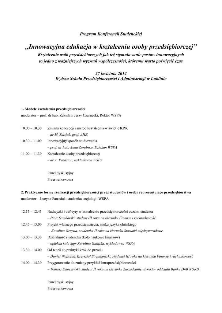 Program Konferencji Studenckiej „Innowacyjna edukacja w kształceniu osoby przedsiębiorczej” Kształcenie osób przedsiębiorczych jak też stymulowanie postaw innowacyjnych to jedno z ważniejszych wyzwań współczesności, któremu warto poświęcić czas 27 kwietnia 2012 Wyższa Szkoła Przedsiębiorczości i Administracji w Lublinie 1. Modele kształcenia przedsiębiorczości moderator – prof. dr hab. Zdzisław Jerzy Czarnecki, Rektor WSPA 10.00 – 10.30 Zmiana koncepcji i metod kształcenia w świetle KRK – dr M. Stasiak, prof. AHE. 10.30 – 11.00 Innowacyjny sposób studiowania – prof. dr hab. Anna Zarębska, Dziekan WSPA 11.00 – 11.30 Kształcenie osoby przedsiębiorczej – dr A. Paździor, wykładowca WSPA Panel dyskusyjny Przerwa kawowa 2. Praktyczne formy realizacji przedsiębiorczości przez studentów i osoby reprezentujące przedsiębiorstwa moderator – Lucyna Panasiuk, studentka socjologii WSPA 12.15 – 12.45 Nadwyżki i deficyty w kształceniu przedsiębiorczości oczami studenta – Piotr Samborski, student III roku na kierunku Finanse i rachunkowość 12.45 – 13.00 Projekt własnego przedsięwzięcia, nauka języka chińskiego – Karolina Grzywa, studentka II roku na kierunku Stosunki międzynarodowe 13.00 – 13.30 Działalność studencka (koło naukowe finansów) – opiekun koła mgr Karolina Gałązka, wykładowca WSPA 13.30 – 14.00 Od teorii do praktyki krok do przodu – Daniel Wojtczak, Krzysztof Strzałkowski, studenci III roku na kierunku Finanse i rachunkowość 14.00 – 14.30 Przygotowanie do zmiany przykład intraprzedsiębiorczości – Tomasz Smoczyński, student II roku na kierunku Zarządzanie, dyrektor oddziału Banku DnB NORD Panel dyskusyjny Przerwa kawowa 3. Działania i organizacje wspierające przedsiębiorczość moderator – dr A. Paździor, wykładowca WSPA 15.00 – 15.30 Przedsiębiorczość w rzeczywistości – wystąpienie przedstawiciela biznesu – Paweł Gaca, Wiceprezes ds. Finansowych Spółdzielczej mleczarni „Spomlek” 15.30 – 15.45 Prezentacja Inkubatora WSPA – Piotr Samborski, student III roku na kierunku Finanse i rachunkowość, koordynator biura Akademickich Inkubatorów Przedsiębiorczości przy WSPA 15.45 – 16.00 Intech – wystąpienie Dyrektora Generalnego Roberta Czajki 16.00 – 16.15 Fundacja Rozwoju Lubelszczyzny 16.15 – 16.45 Panel dyskusyjny 16.45 Oficjalne podsumowanie i zakończeni konferencji – prof. dr hab. Zdzisław Jerzy Czarnecki, Rektor WSPA Organizatorzy Sponsor