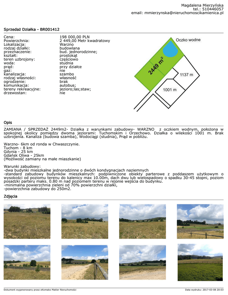 Magdalena Mierzyńska tel.: 510446057 email: [email protected] Sprzedaż Działka - BR001412 Cena: Powierzchnia: Lokalizacja: rodzaj działki: przeznaczenie: kształt: teren uzbrojony: woda: prąd: gaz: kanalizacja: rodzaj własności: ogrodzenie: komunikacja: tereny rekreacyjne: drzewostan: 198 000,00 PLN 2 449,00 Metr kwadratowy Warzno budowlana bud. jednorodzinne; prostokąt częściowo studnia przy działce nie szambo własność brak autobus; jezioro;las;staw; nie Opis ZAMIANA / SPRZEDAŻ 2449m2- Działka z warunkami zabudowy- WARZNO z oczkiem wodnym, położona w spokojnej okolicy pomiędzy dwoma jeziorami: Tuchomskim i Orzechowo. Działka o wilekości 1001 m. Brak uzbrojenia. Kanaliza (budowa szamba), Wodociągi (studnia), Prąd w pobliżu. Warzno- 6km od ronda w Chwaszczynie. Tuchom - 8 km Gdynia - 25 km Gdańsk Oliwa - 25km (Możliwość zamiany na małe miaszkanie) Warunki zabudowy: -dwa budynki mieszkalne jednorodzinne o dwóch kondygnacjach naziemnych -standard zabudowy budynków mieszkalnych: podpiwniczone obiekty parterowe z poddaszem użytkowym o wysokości od poziomu terenu do kalenicy max 10.00m, dach dwu lub wielospadowy o spadku 30-45 stopni, poziom posadzki parteru maks. 0.80 m nad poziomem terenu w rejonie wejścia do budynku. -minimalna powierzchnia zieleni od 70% powierzchni działki, -powierzchnia zabudowy do 250m2. Zdjęcia Dokument wygenerowany przez eKomako Makler Nieruchomości Data wydruku: 2017-03-08 20:03